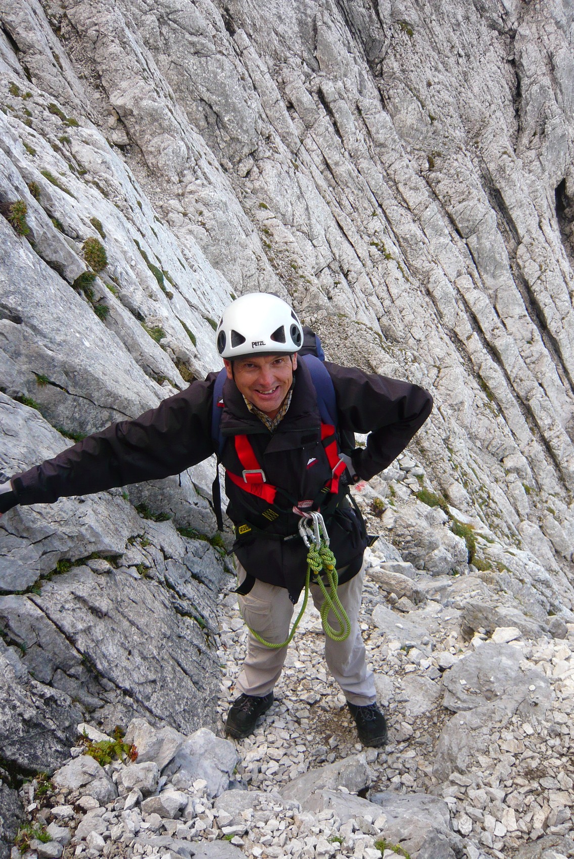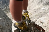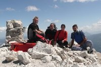 Trotz schönstem Bergwetter fanden sich nur 4 Teilnehmer für diese herrliche Unternehmung auf den Großen Priel. Am späten Vormittag machten wir uns auf den Weg nach Hinterstoder und erreichten in 2 Stunden Fahrzeit den Ausgangspunkt. Der ostseitige Aufstieg zum Prielschutzhaus gestaltete sich etwas heiß und umso freudiger wurden die kühlen Getränke auf der Hütte begrüßt. Da wir alle passionierte Kletterer sind, hatten wir uns entschlossen den Gipfel über den Südgrad anzugehen. Nach einer ruhigen Nacht, trotz voller Hütte, brachen wir gegen 6:30 Uhr auf und waren die Ersten am Einstieg. In leichter Kletterei (650 Hm, 1.300 Klettermeter, II–III) mit zwei etwas schwereren Stellen (IV+ und −V) kraxelten wir bei strahlend blauem Himmel den Grat entlang. Nach ca. 3½ Stunden Kletterei trifft der Bert-Rienisch-Klettersteig auf den Südgrad und in knapp ½ Stunde erreichten wir den Gipfel – den leider gerade kein Gipfelkreuz schmückte. Dies stand noch im Tal bei der Einweihung und sollte erst am Montag per Heli auf den Gipfel gebracht werden. Über den Normalweg (auch mit ein paar Seilsicherungen) ging es wieder hinab zur Hütte. Nach einer schönen Rast mit kühlen Getränken ging es nochmals 2 Stunden hinab ins Tal. Vor der Heimfahrt kühlten wir unsere beanspruchten Füße noch in der krummen Steyr ab und fuhren gemütlich wieder ins Bayernland. Eine gelungene Wochenendunternehmung.