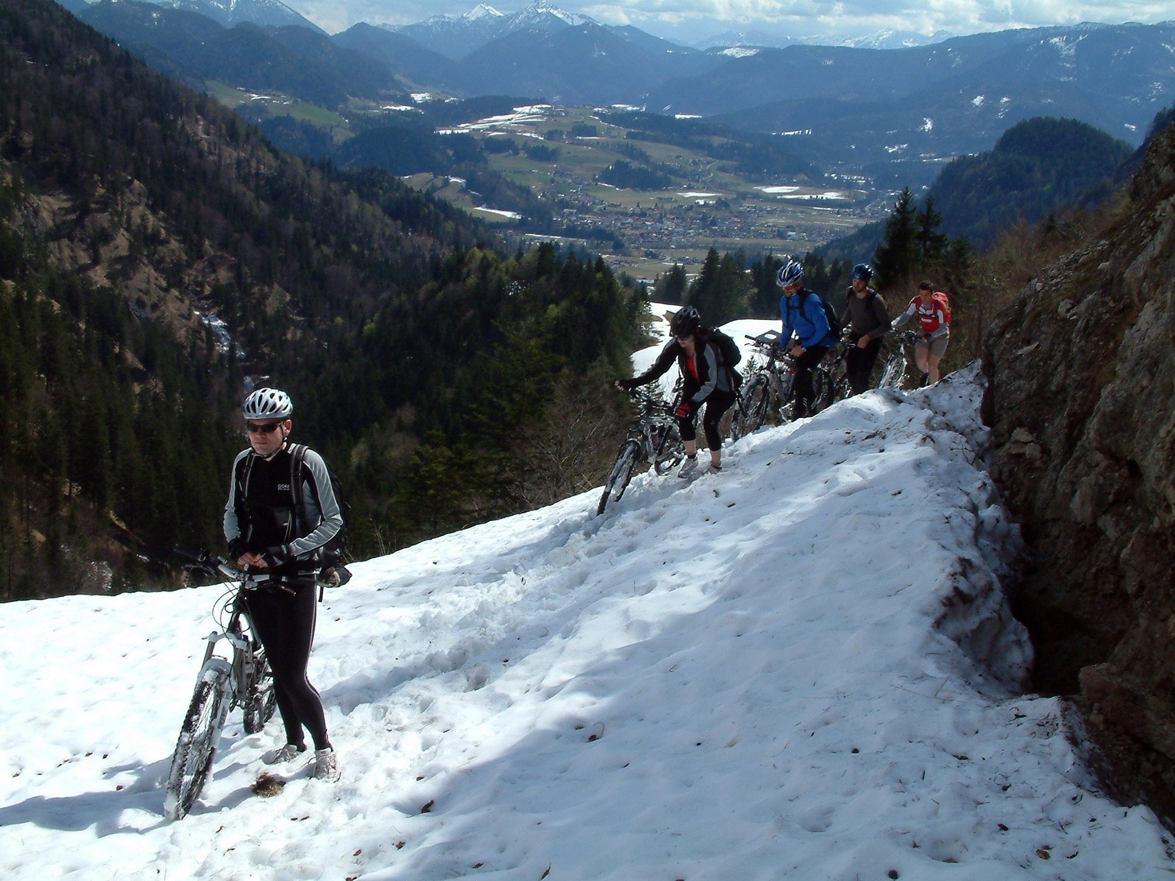 Bereits bei der Anfahrt mit dem Auto konnte man darüber rätseln, ob der Termin nicht etwas früh gelegt war. Aber solange man die grünen Südhänge anschaute, konnte man hoffen. Nach der ersten halben Stunde Fahrt wurde es uns dann recht schnell klar: es liegt noch verdammt viel Schnee. Wir verlegten die Route in die freien Südhänge – frei waren die Hänge, die Fahrwege noch lange nicht, stellten wir alsbald fest. So blieb uns nichts anderes übrig als zu schieben, umdrehen wollten wir alle nicht. Wir fuhren/stapften/schoben bis auf 1100 m, dann war aber wirklich Schluss. Der Rückweg über Staffen war weitgehend schneefrei, so dass wir wenigstens bergab nicht mehr allzu viel schieben mussten. Mittagsrast machten wir auf der schön gelegenen Horau-Alm, die vom Weißenbachtal in 300 Hm Auffahrt zu erreichen ist. Heiße Gulaschsuppe war der Renner.