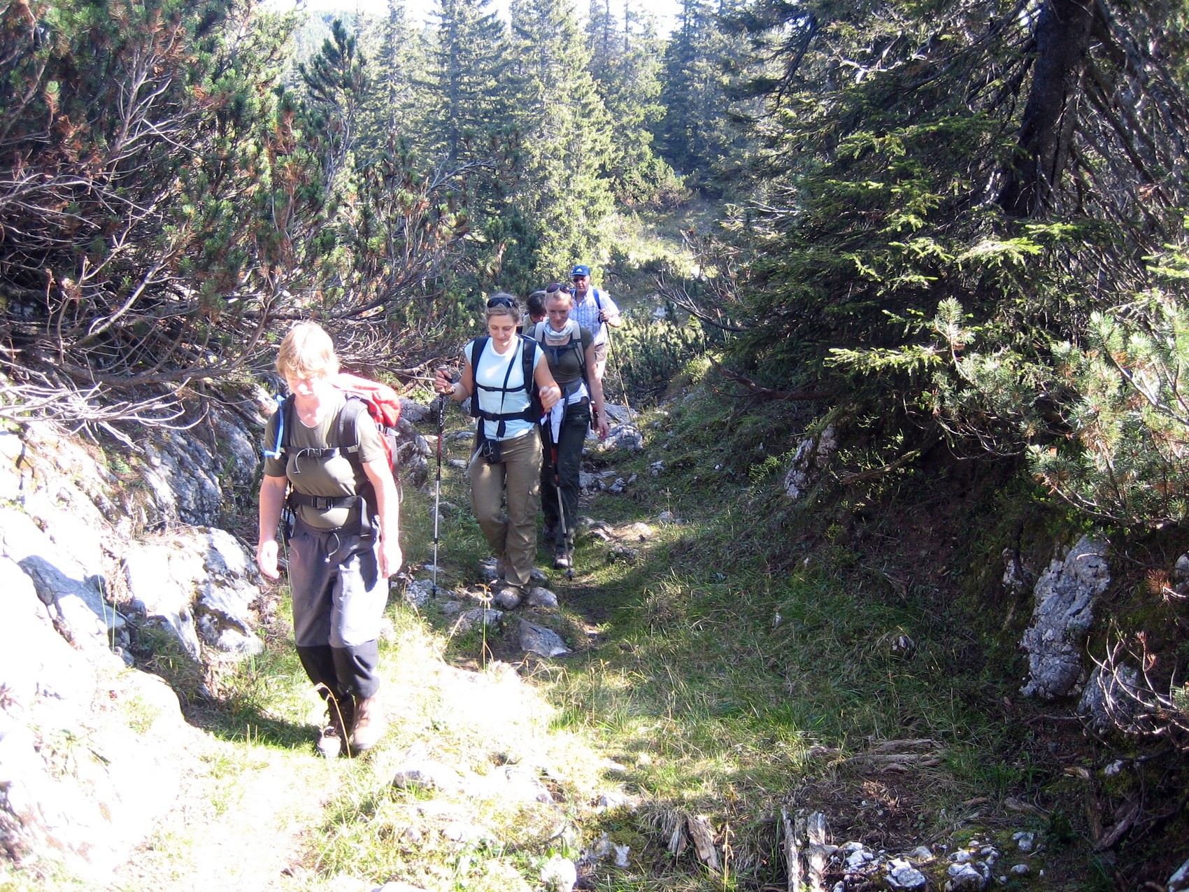 „Geht’s am Kogl?“ fragte uns ein Bauer am Ausgangspunkt; „da hat aber a Lawine zwischen da Ramsau- und Laufenberg-Alm alles niedergerissen. Müsst’s euch halt an Weg selba suacha“, sagt er, und wünscht uns einen schönen Bergtag. Nach kaum einer halben Stunde Gehzeit sahen wir die Bescherung: auf ca. 500 Höhenmeter war alles niedergewalzt und fast kein Durchkommen. Weglos, steil, Nebelschwaden und einsetzender leichter Regen kosteten Zeit, zusätzliche Kraft und Orientierungsvermögen. So erreichten wir erst nach 4 ½ Stunden den Bergwerkskogel. Der Regen hatte aufgehört, aber der Nebel riet uns dazu, den Rettenkogel sausen zu lassen, und auf gleichem Weg wieder abzusteigen. Kaum zu glauben, aber 10 Min. nach diesem Entschluss riss der Himmel auf und die Sonne leuchtete uns an! Die Gratwanderung mit der kitzligen Stelle und der kurze Klettersteig im Gipfelbereich waren unproblematisch für die Mannschaft. Die Rast und die Umsicht auf dem Rettenkogel war ein Genuss. Der Abstieg auf der sonnigen Westseite entschädigte die Truppe für den doch wettermäßig eher bescheidenen Aufstieg. Nach 8 Std. reiner Gehzeit, mit etwas müden Beinen und Verspätung wurde auf die übliche Einkehr verzichtet und der Weg nach Hause angetreten.