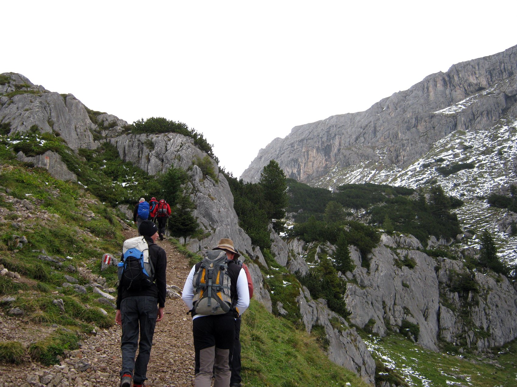 Um die Prognose für den Vormittag zu nutzen, sind wir – Dank der Hüttenküche für das „Früh(e)stück“ – sehr früh aufgestiegen. Laufend zogen aus Südwesten schnelle, hohe, dicke Wolken über den Alpenhauptkamm. Nachdem wir die Abzweigung zum Riepenkar genommen haben, sind wir bis auf ca. 2 900 m auf einen guten übersichtlichen Weg hoch gewandert.