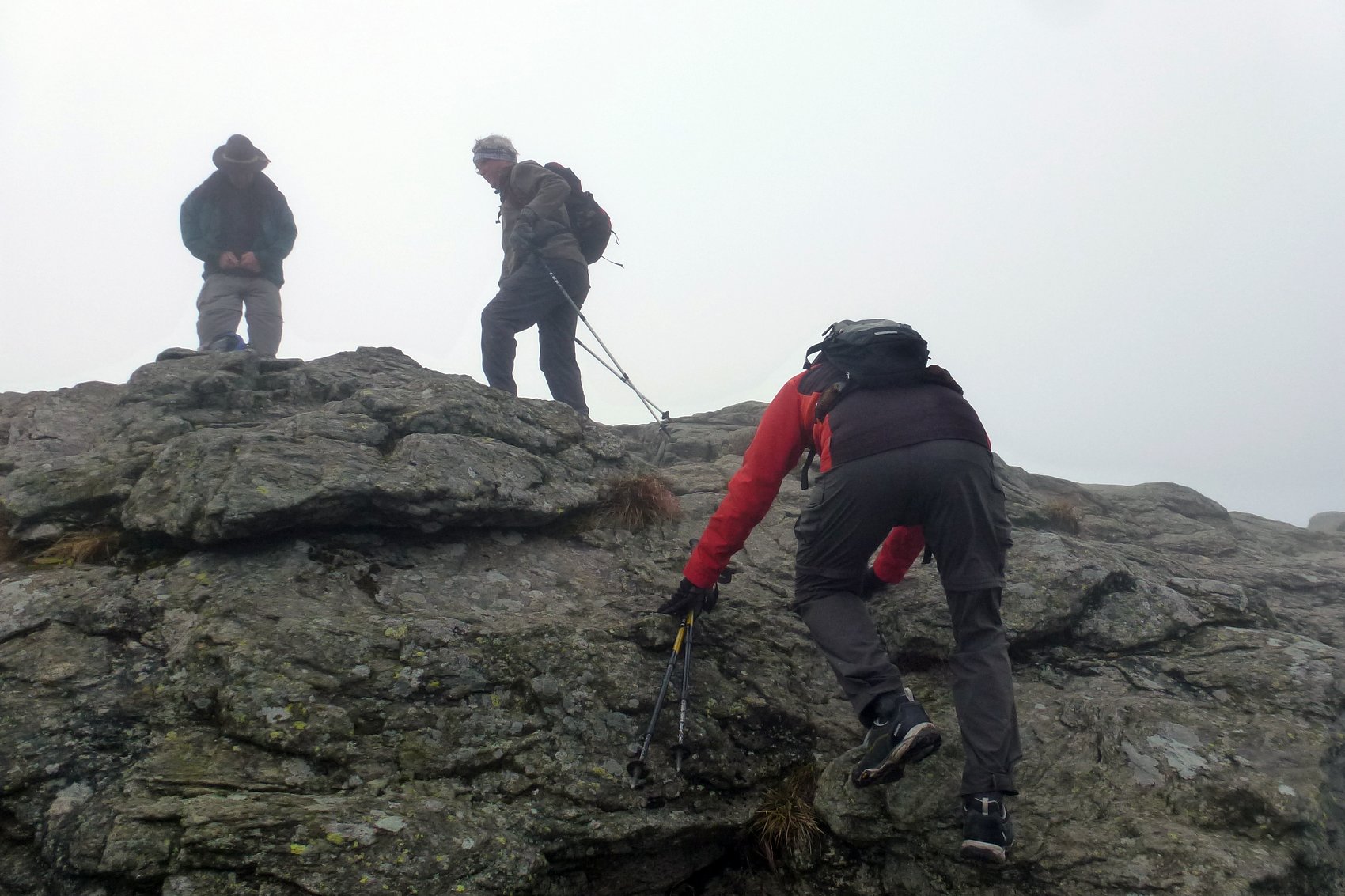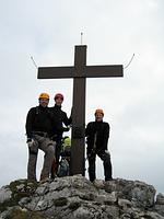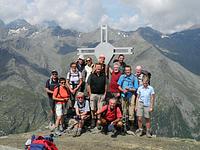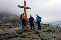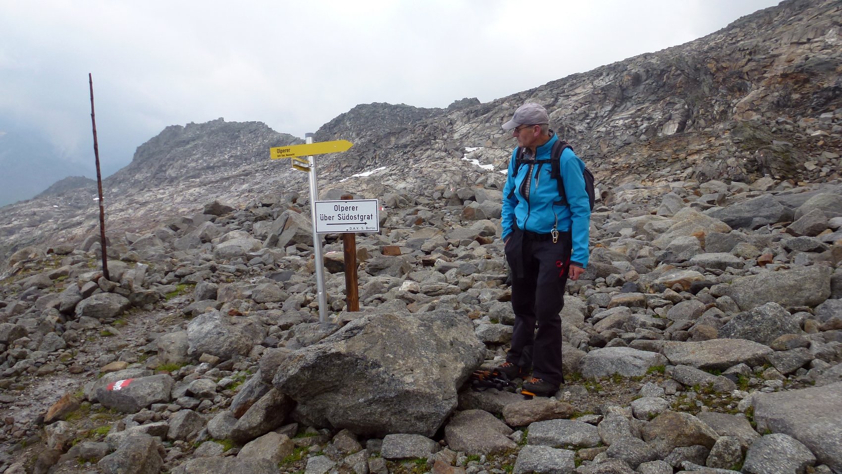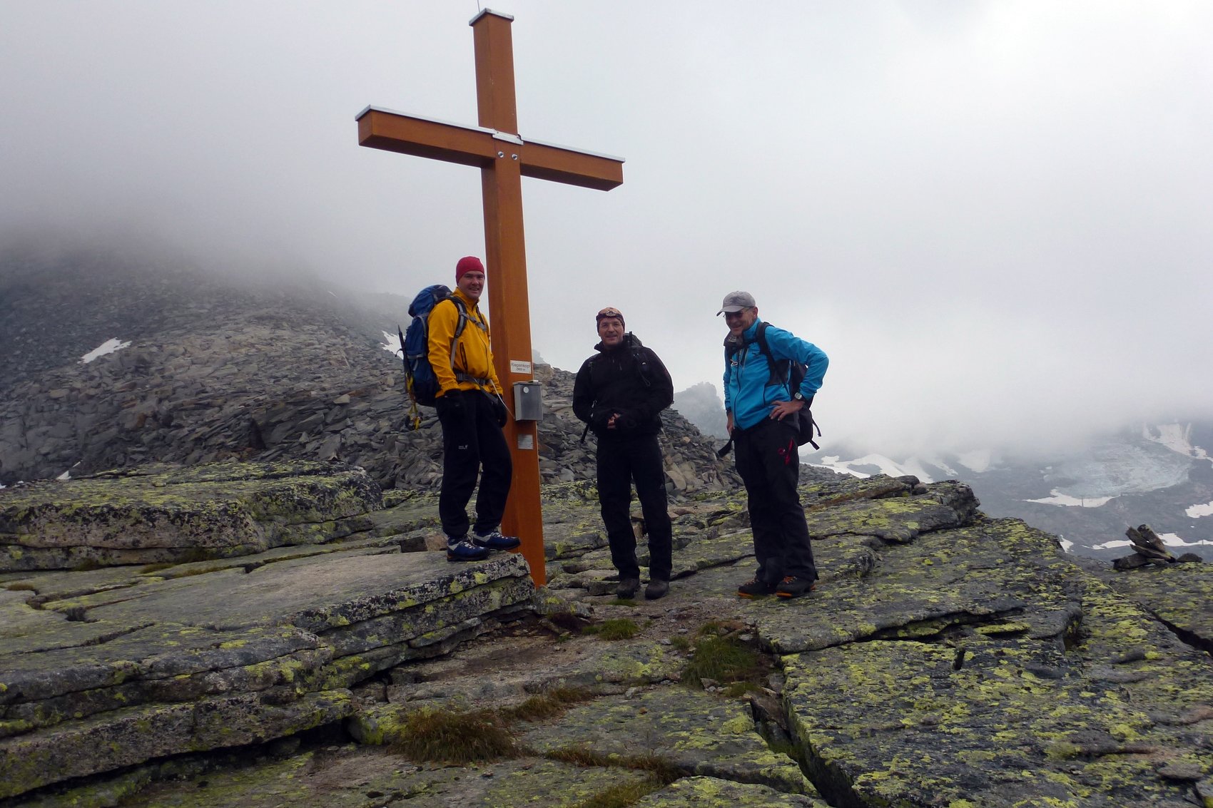 Als Ersatzgipfel haben wir den nahe stehenden Riepenkopf (2 905 m) auserkoren. Bis dorthin sind diverse Felsblöcke und leichte Kletterpassagen zu überwinden. Geschmückt mit neuem Gipfelkreuz, Metallabdeckung und Blitzableiter (gespendet von der Sektion Neumarkt/Oberpfalz) haben wir die elektrische Spannung in der Luft wahrgenommen. Nachdem auch die mitgebrachten Pickel die Spannung aufnahmen, haben wir sofort den Rückzug zur Hütte angetreten.