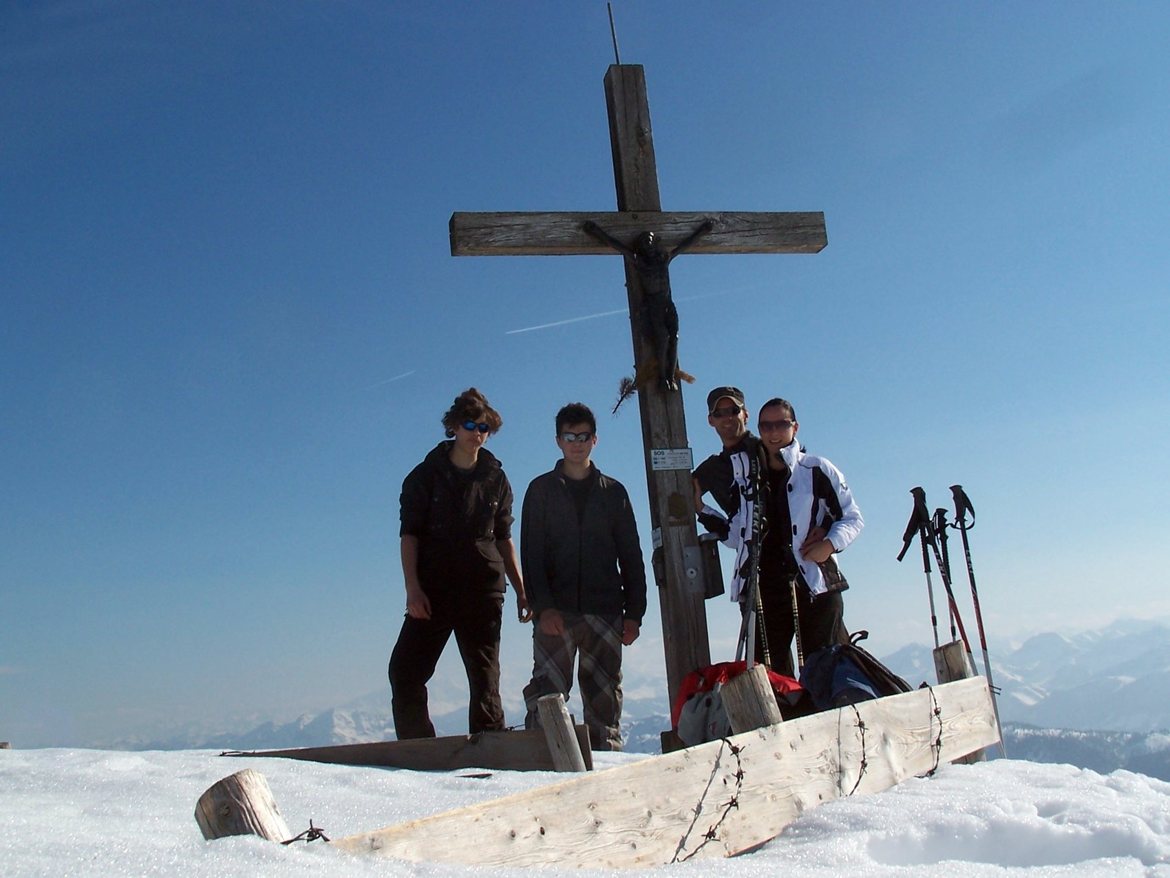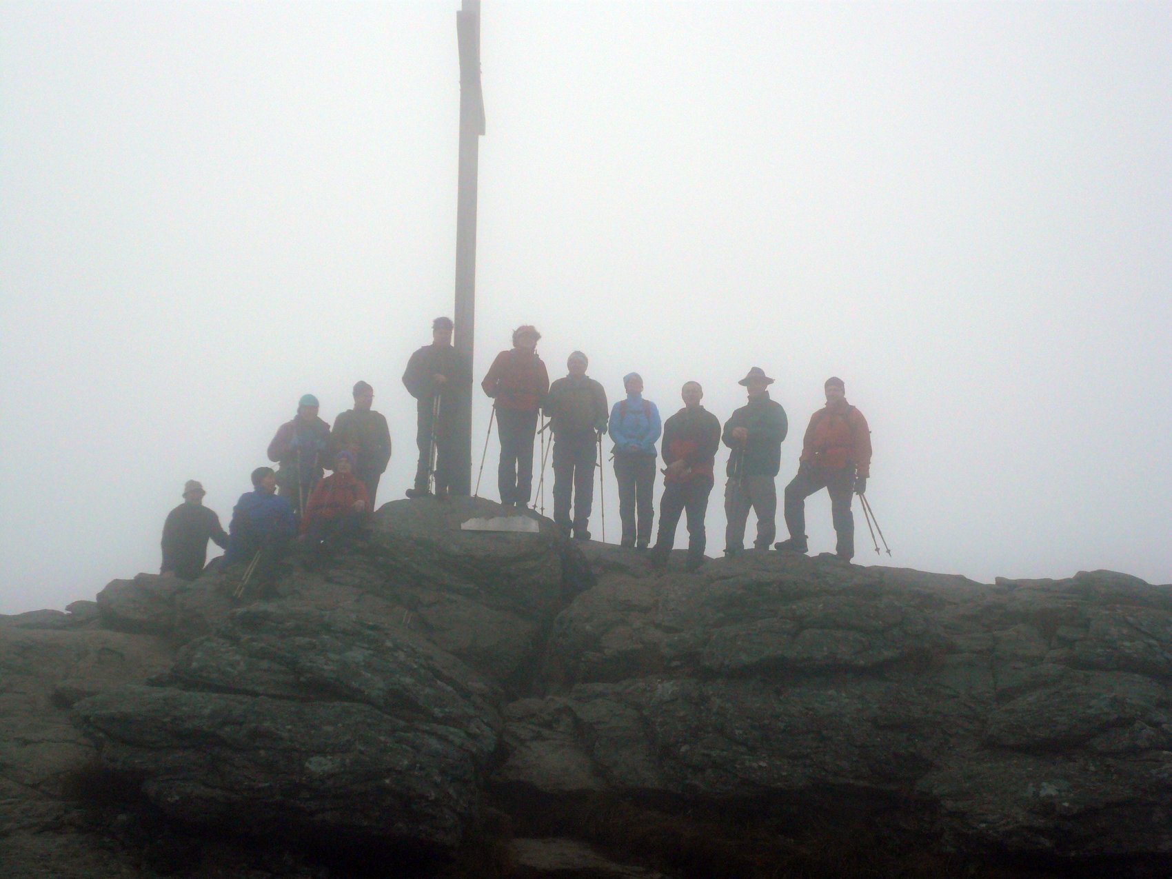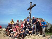 Wegen Regen haben wir die Tour um einen Tag verschoben. Im Aufstieg fing es leicht zu nieseln und nebeln an, hörte aber bald wieder auf. Dafür hatten wir ausgedehnte, zunehmend steilere Schneefelder vor uns, die auch alle Markierungen verbargen. Einmal rutschte sogar kurz der Hund von Beatrice aus und sauste verdutzt auf seinem Hinterteil talwärts, was uns ermahnte, sichere Tritte in den Schnee zu schlagen und die Stöcke gut einzusetzen. Die Sonne kam raus und alle kamen wohlbehalten am Gipfel an, wo wir uns die Brotzeit schmecken ließen. Auf einfachen Wegen ging’s zurück. Kaum in der Wirtschaft, regnete es sehr heftig. Anschließend fuhr Gunther den Bus bei Sonnenschein wieder zurück nach Eggenfelden.