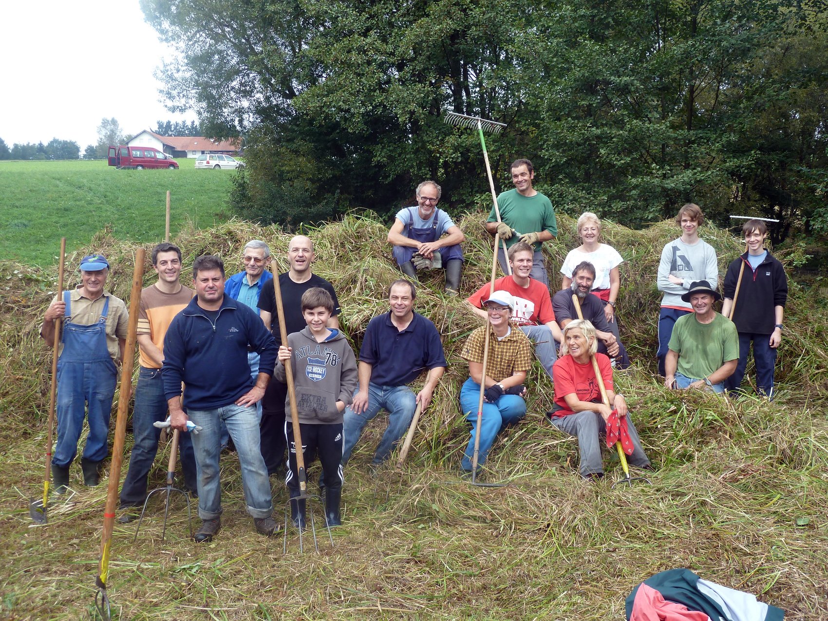 Für die alljährliche Biotoppflege trafen sich am Samstag 17 fleißige Helfer unserer Sektion zum Arbeitseinsatz. Dank der bereits teilweise unter der Woche und am Freitag vorgemähten Flächen ging die Arbeit flott voran. Bei dieser Aktion wird eine naturbelassene Grasfläche mit einem kleinen See in der Mitte gemäht und von den Helfern das Schnittgut zusammengetragen, um dieses Gebiet vor dem Zuwachsen zu schützen. Dies passiert im Auftrag des Landkreises Rottal-Inn und dient dazu, besonderen Tier und Pflanzenarten im Einklang mit der Natur Rückzugs- und Schutzgebiete zu geben. Nach getaner Arbeit gab es zum Abschluss noch ein besonderes Zuckerl für alle freiwilligen Helfer. Sie waren bei der Familie Kunigunde und Michael Zelger zur Brotzeit mit Würsten und selbstgebackenen „Kiachen“ eingeladen. Die Sektion bedankt sich an dieser Stelle bei allen Helfern, Spendern und Unterstützern der diesjährigen Biotoppflege, besonders auch bei Max Dallinger, der wie alle Jahre die Biomasse unentgeltlich abgeholt und in seiner Biogasanlage verwertet hat.