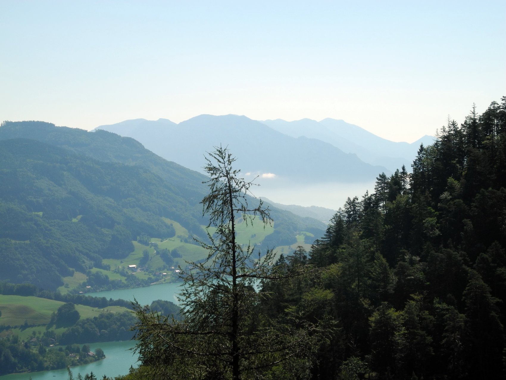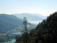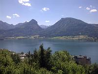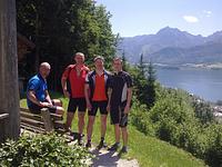 Die Route führte uns von Winkl am Mondsee um den Schafberg herum. Die erste Etappe ging zur Eisenaueralm. Dorthin waren zuvor jedoch etliche Höhenmeter auf steiler Schotterpiste und kurze extrem steile Abfahrten zu bewältigen. Nach kurzer Trinkpause ging’s gemütlich bergab zum Schwarzensee, einem viel besuchten Ausflugsziel in 730 m Höhe. Auf einem ziemlich grobem Wanderweg fuhren wir hinunter oder besser hinüber nach St. Wolfang, wo wir hoch überm See im Schatten einer Kapelle Mittag machten.