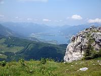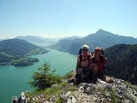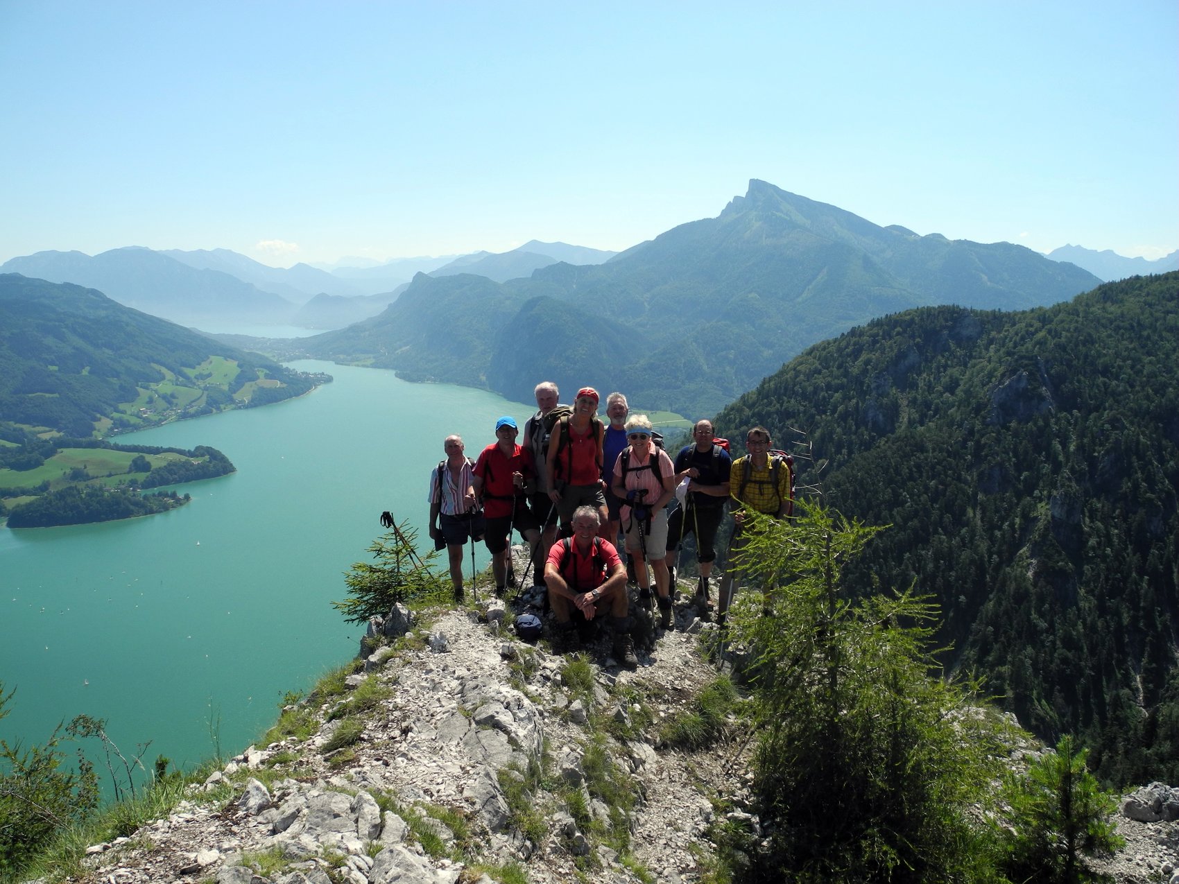 Im Programm stand die Pyramidenspitze im Zahmen Kaiser. Auf Grund der Hitze und starken Gewittervorhersagen für nachmittags von Westen ging’s ins Salzkammergut. Von Blomberg am Mondsee auf einem gesicherten Steiglein mit schönen Tiefblicken auf den blauen See und vorbei am bekannten Drachenloch. Der imposante Tiefblick wurde natürlich von allen wahrgenommen. Das Panorama am Aussichtslogenplatz des Gipfels wurde reichlich genossen. Nach einer halben Stunde Abstieg kam plötzlich ein heftiges Gewitter. So schnell es kam verschwand es auch wieder und der Himmel zeigte sich wieder sonnig. Der krönende Abschluss eines schönen Bergtages war das Bad im herrlichen Wasser des Zeller Sees mit Einkehr im Biergarten.