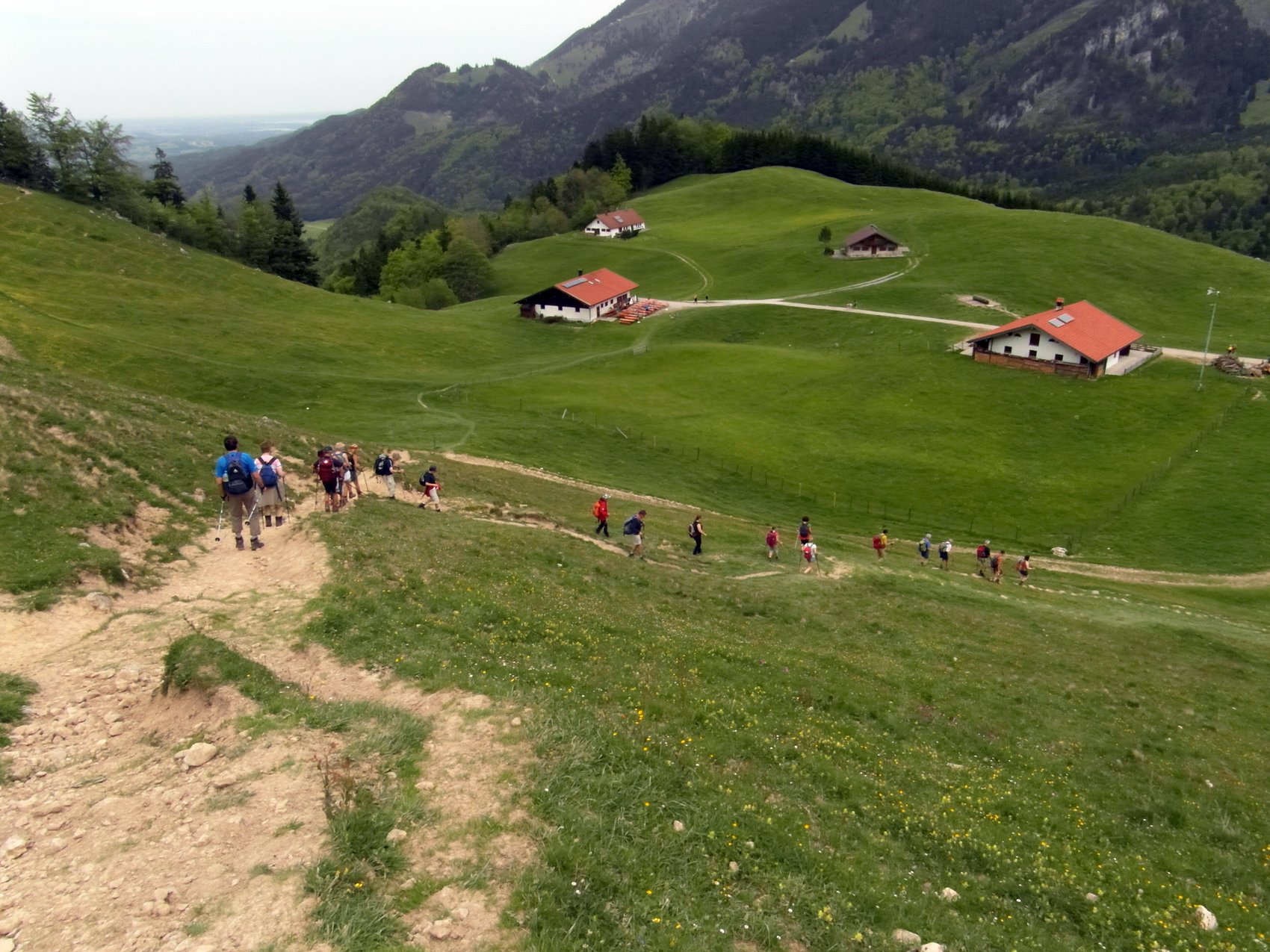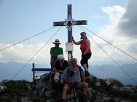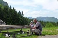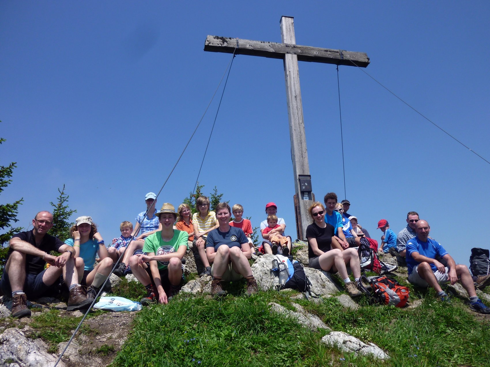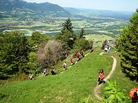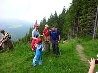 Auf Steigen und Pfaden ging es vorbei an der Wagneralm, wo schon fleißig für den Festtag vorbereitet wurde. Stets von einigen grauen Wolken begleitet, die auch die Sicht auf die Nachbarberge wie den Heuberg einschränkten, erreichten wir nach ca. zwei Stunden den Gipfel des Feichtecks. Auch unser jüngster Begleiter mit knapp vier Jahren schaffte tapfer den Aufstieg. Die Sonne hatte sich jetzt eisern durch die Wolken gekämpft und bescherte uns einen warmen Gipfelaufenthalt. Nach einer längeren Rast mit Brotzeit packten wir den Abstieg an. Richtung Karkopf stiegen wir in östlicher Richtung bis zum Sattel ab, um dann Richtung Feichteckalm zur wohlverdienten Einkehr zu wandern.