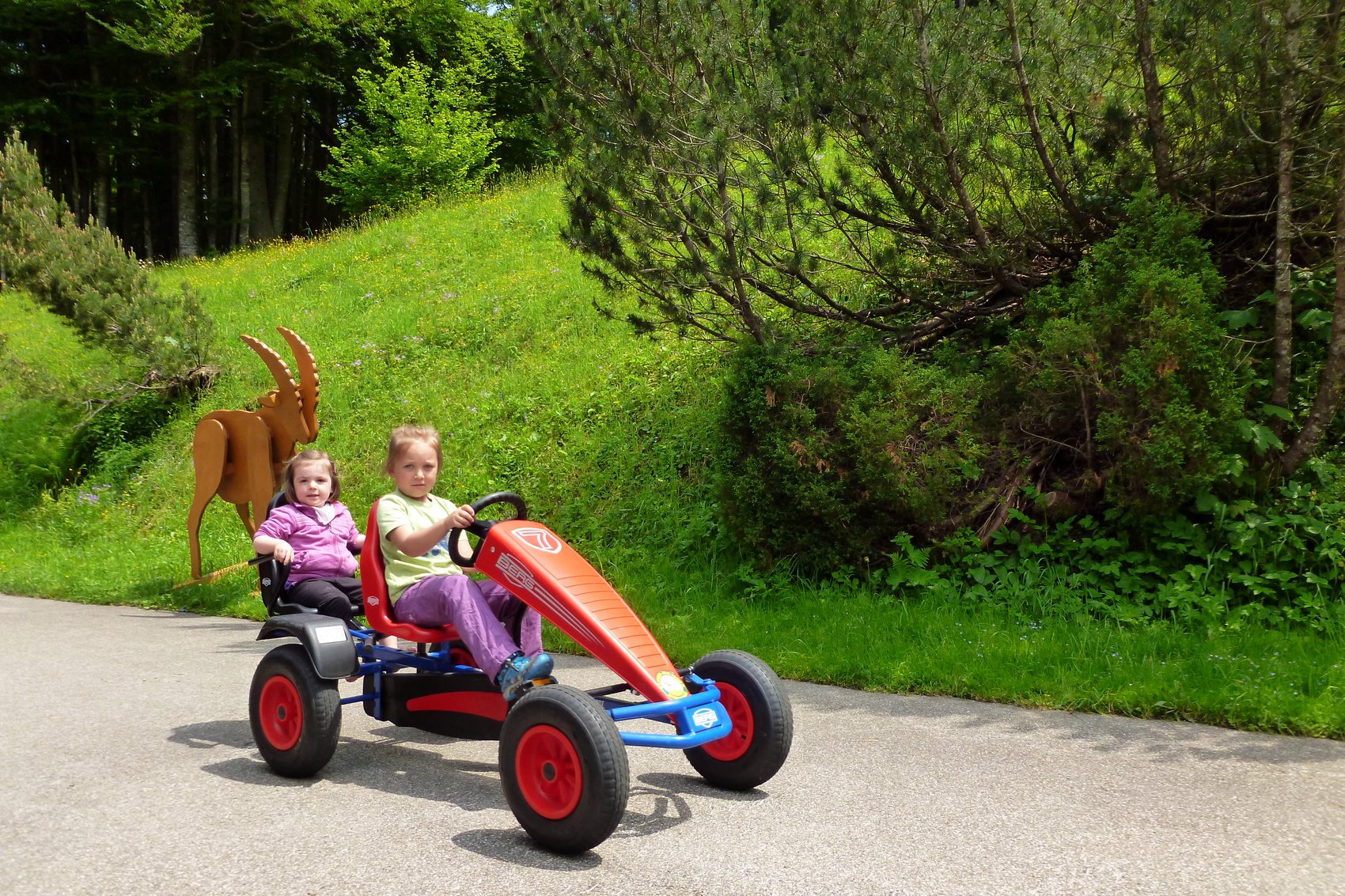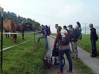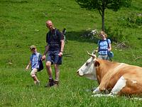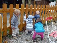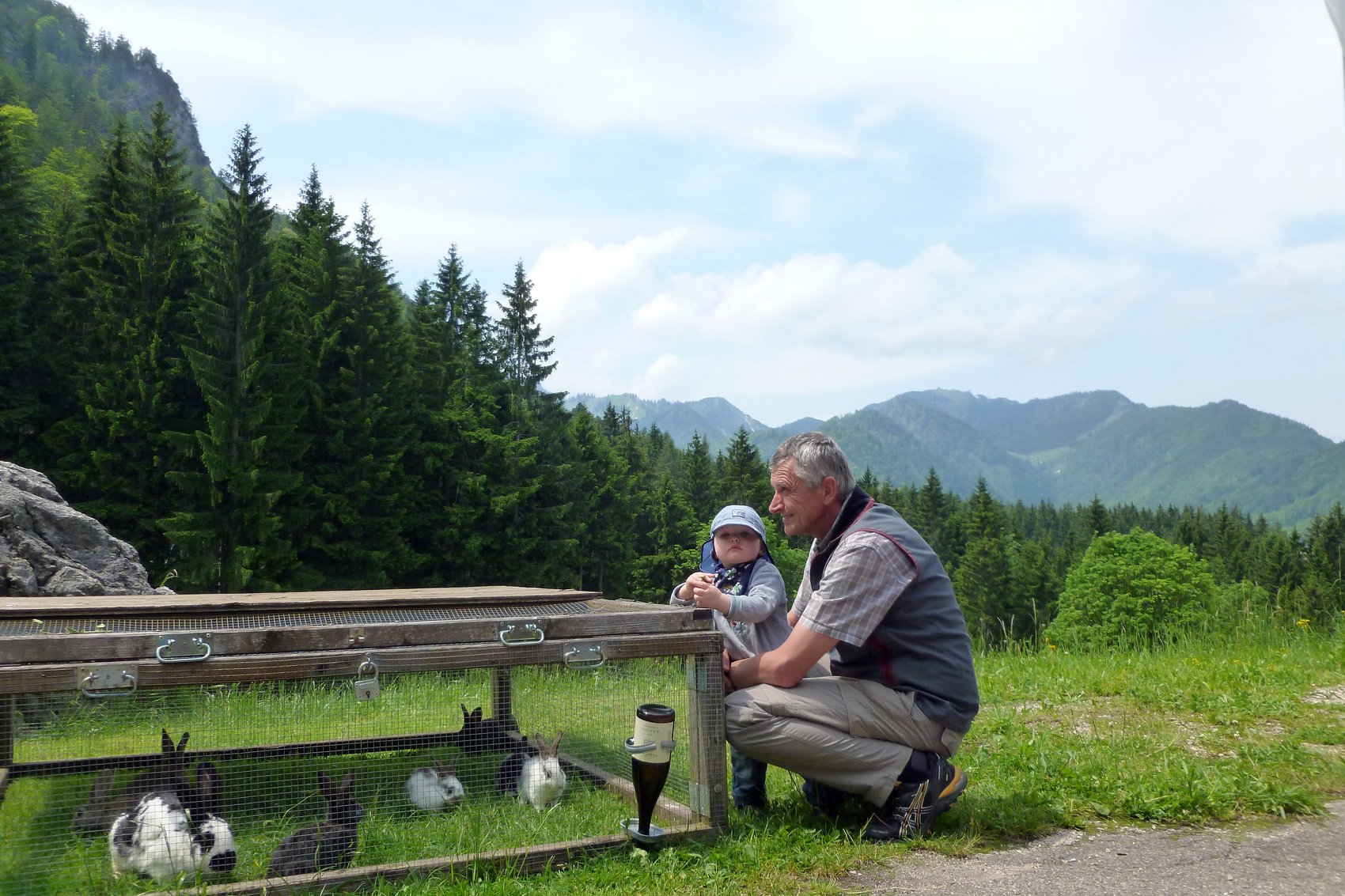 Wir waren eine kleine Gruppe bei unserer ersten Kraxenwanderung im Gebirge. Dafür gab es fast alles zu sehen, was Kinderherzen höher schlagen lässt – auf der Alm ein Spielplatz mit Schaukel und Sandkasten, unterwegs eine Blindschleiche und ein Feuersalamander. Aber viel interessanter waren die vielen Hasen auf der Alm, welche von uns kugelrund mit Gras gefüttert wurden. Wir wählten unsere Tour als Rundweg aus und so kamen wir beim Abstieg zusätzlich am Wirtshaus Weingarten vorbei, wo lecker Erdbeerkuchen auf uns wartete. Auch interessant waren die Gleitschirmflieger, die nur wenige Meter von der Terrasse entfernt starteten. Nach einer Gehzeit von ca. zwei Stunden kamen wir glücklich und zufrieden wieder an unserem Ausgangspunkt an.