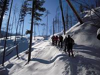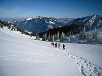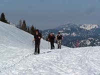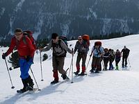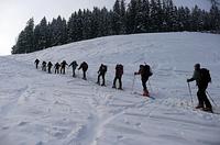 Der Weg führte zunächst durch tief verschneite Wälder über meterhohen Pulverschnee zum steilen Gipfelanstieg. Das weiträumige Gipfelplateau empfing die Bergsteiger nach 850 Höhenmetern Aufstieg und drei Stunden Gehzeit absolut unberührt und völlig still. „Der Schnee glitzerte im Sonnenlicht wie Edelsteine und am strahlend blauen Firmament bot sich eine grandiose Aussicht auf die Bergwelt“, schwärmen die Schneeschuhwanderer. Trotz der Minusgrade wurde erst nach einer Stunde der Abstieg in Angriff genommen – ein weiterer Höhepunkt, denn vorbei an einem Rudel Gemsen konnte jeder der sieben Teilnehmer in den weiten Hängen im Pulver seine eigenen Spuren bis zur Waldgrenze ziehen. „Schöner kann Winter kaum sein“, war man sich bei der Heimfahrt einig.