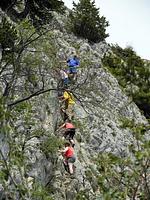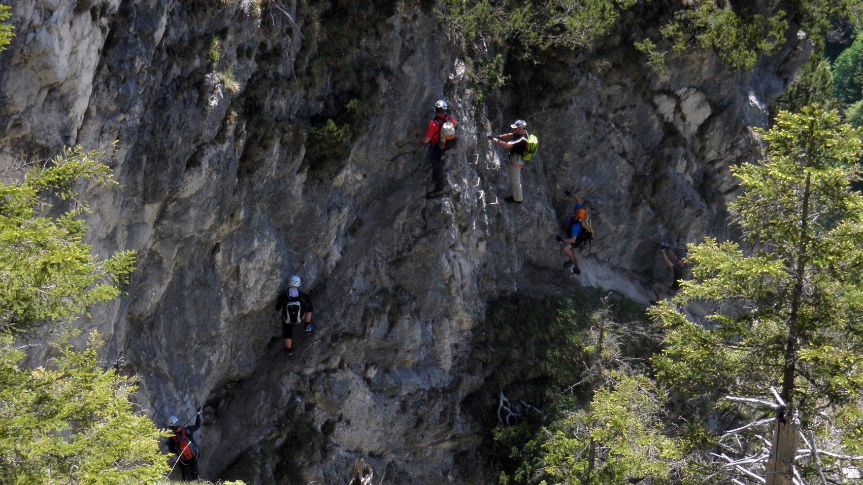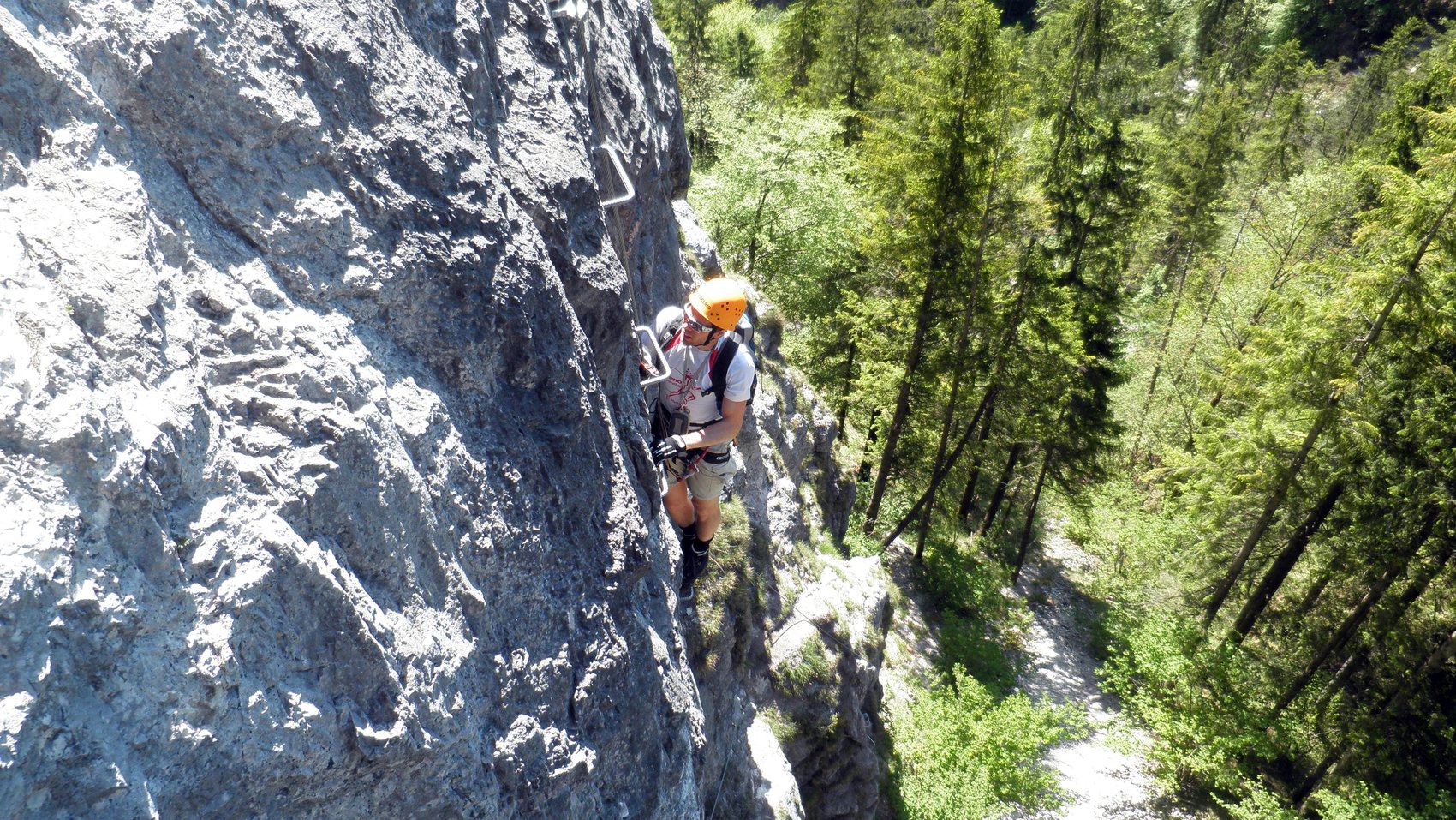 Bei sonnigem Wetter und großem Andrang am Einstieg haben wir uns den Grünstein-Klettersteig vorgenommen. Nach der Gruppenaufteilung wurden die Teilnehmer für die leichte Passage zur Ausrüstung-, Sicherungs- und Materialkunde eingewiesen. Beim Einstieg gab es die ersten C-Passagen zu überwinden und aufgrund der großen Gruppen vor uns sind wir sehr zögerlich vorangekommen.
