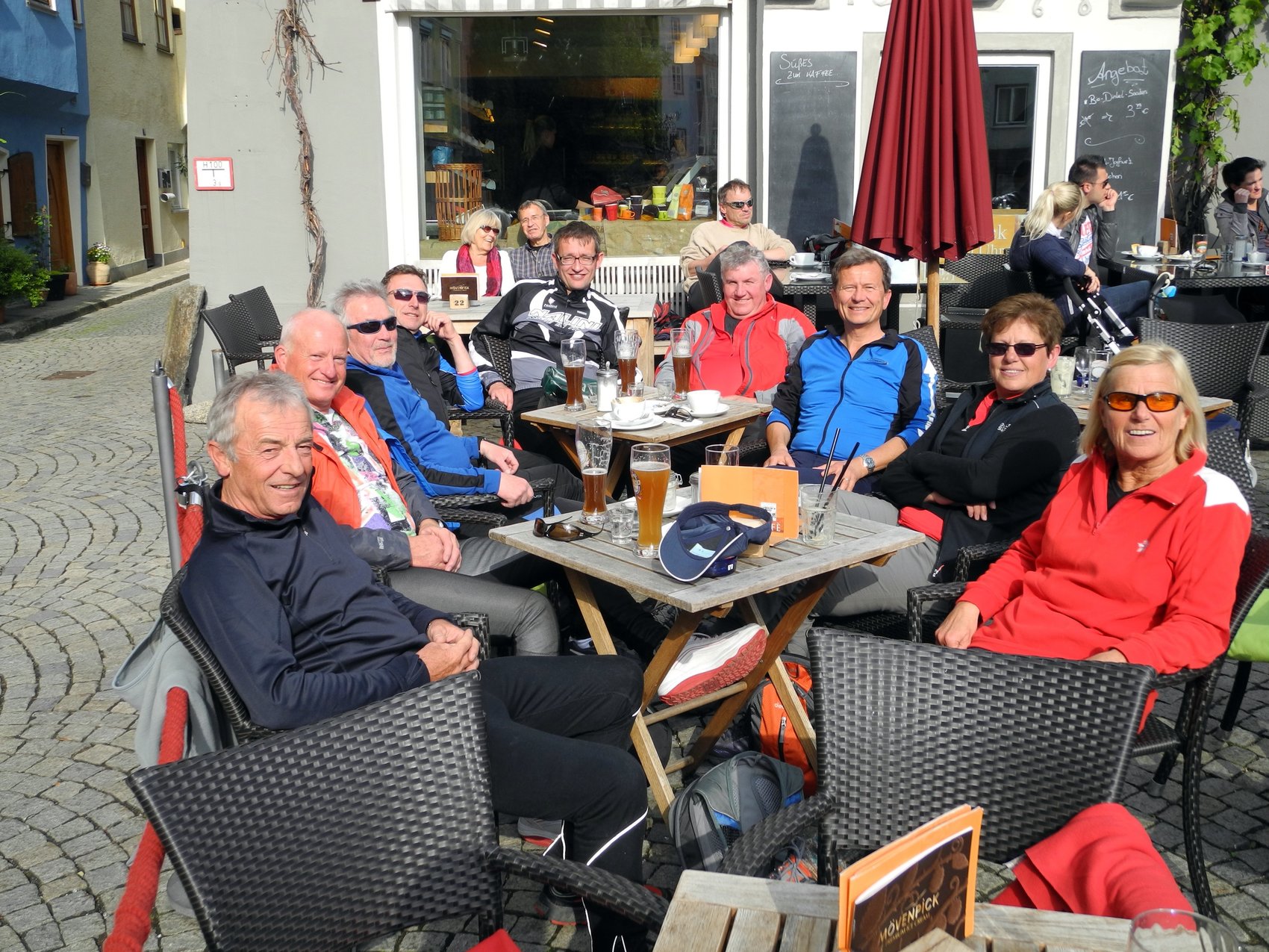 Vom Ziel trennte uns nur noch der Falkenstein mit einem gut 150 Höhenmeter langem und ziemlich steilem Anstieg, in der Nachmittagshitze eine richtige Schinderei. Umso schöner war’s nachher im Biergarten.