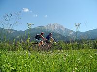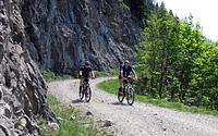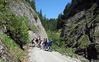 Die ersten zwei Kilometer auf Asphalt waren schnell hinter uns gebracht. Während viele Radfahrer auf der vielbefahrenen Mautstraße zur Ackernalm weiterfuhren, wählten wir eine etwas weitere, dafür landschaftlich viel schönere und ruhigere Strecke auf einer Forststraße zu den Grabenbergalmen, wo wir eine kleine Rast einlegten. An der Ackernalm vorbei ging’s weiter ins Tal der Brandenberger Ache. Allein ein paar störrische Kühe bremsten auf der rasanten Abfahrt. Gut 150 Höhenmeter Anstieg waren von hier aus noch bis zum Elendsattel zu fahren, bevor es durch den engen Elendgraben nur noch bergab zurück zum Startpunkt ging.