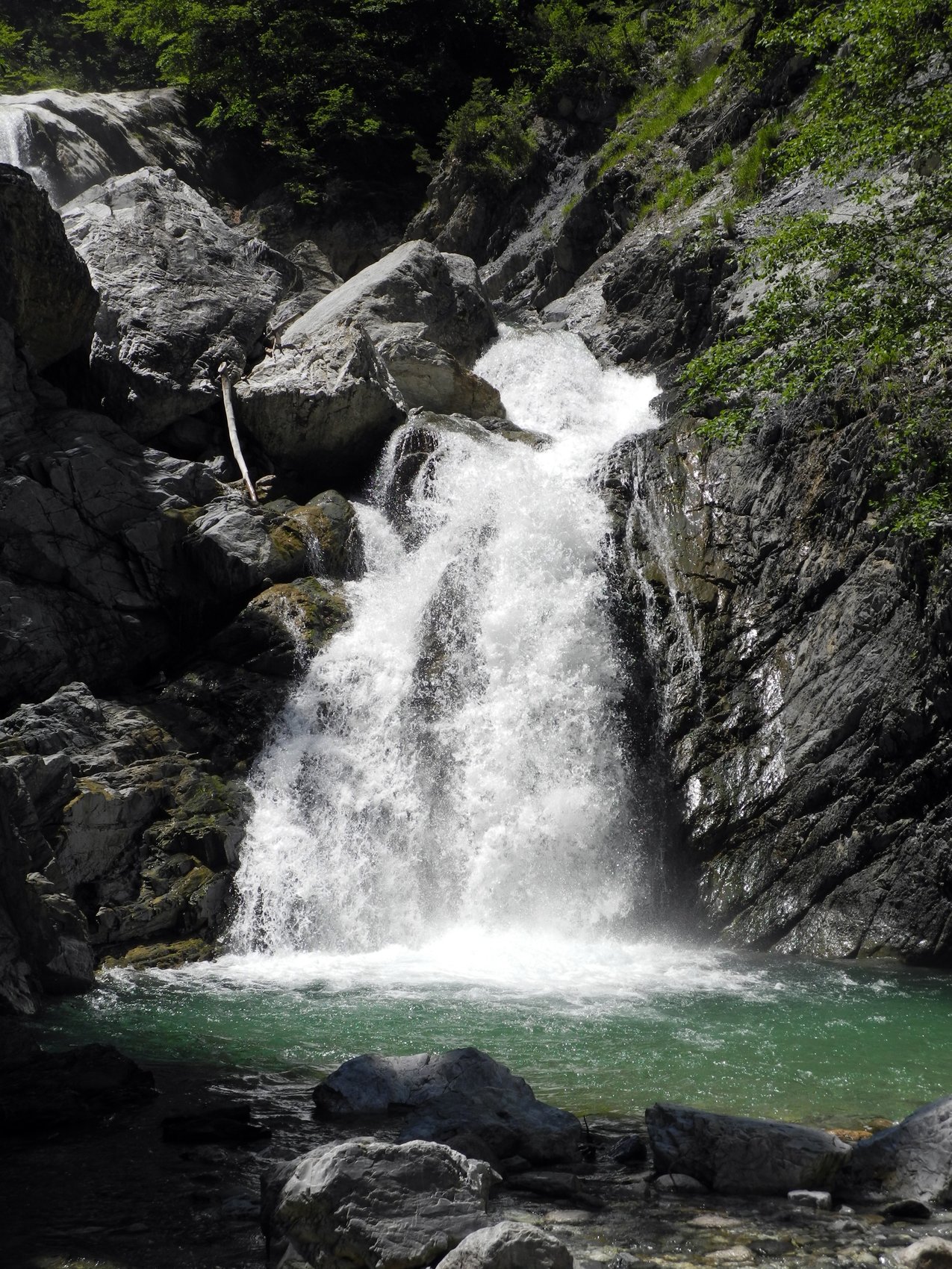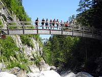 Nach der königlichen Schifffahrt ging es erst mal auf gutem Weg durch den Wald. Durch die Regenfälle bis kurz vorher war der Eisbach gut eingeschenkt und seine Wasserfälle natürlich fotogen. Das Mittelstück gibt der Tour seinen Namen: Saugasse. In 31 Serpentinen führt der Weg durch eine eindrucksvolle Felsschlucht schnell nach oben. Nach deren Ende und einer wohlverdienten Brotzeit schlängelt sich der Weg wieder durch eine grüne, aber doch wilde Landschaft hinauf zur Hütte. Auf diesem Abschnitt lagen auch noch Schneereste – gerade genug für einige Schneeballschlachten und trotz ordentlicher Gehzeit war im Kinderlager lange nichts von Erschöpfung zu hören!