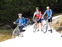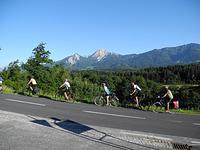16.06.2012 — Nach dem Verladen der Fahrräder war um 8.30 Uhr Abfahrt am Gymnasium. Mit dem neuen Vereinsbus und zwei PKW starteten die 16 Teilnehmer nach Obertauern, wo der Freilinger Adi bei einer Rast traditionell Knacker und Brezn spendierte. Nach 300 km Autofahrt und der Zimmerverteilung am Ziel rief Fritz zum Prolog. Der Silbersee unweit von Villach lud bereits nach 10 km zu einem Badestopp ein. Weiter ging es zu einem Straßencafé oberhalb der Drau in Villach. Auf die Stadtrundfahrt folgte eine Faaker-See-Umrundung und nach 38 km war der erste Radltag zu Ende. Das Hotel Melcher servierte ein 4-Gängemenü und wie schon so oft die Jahre zuvor wurde eine Hochzeit gefeiert.