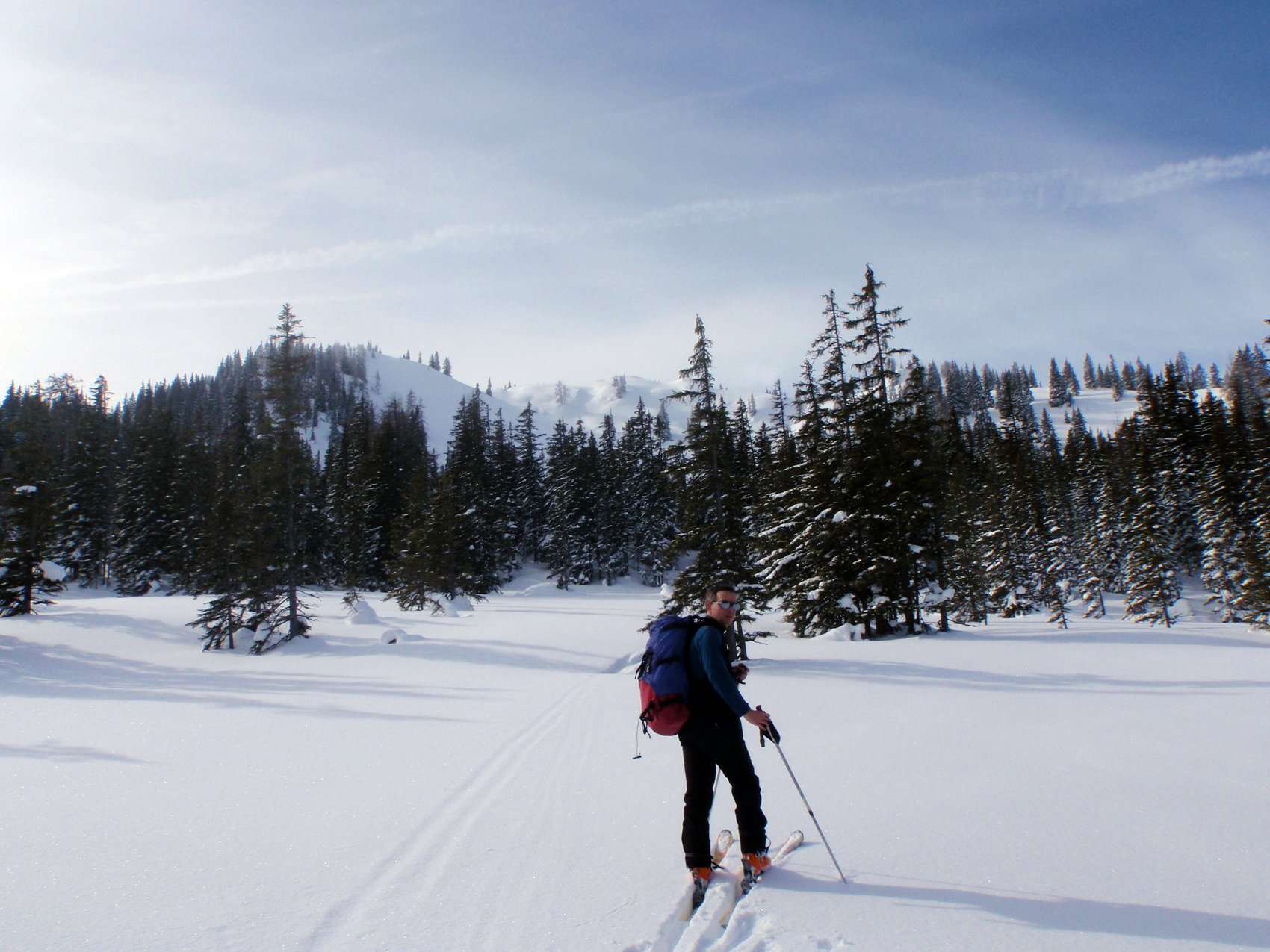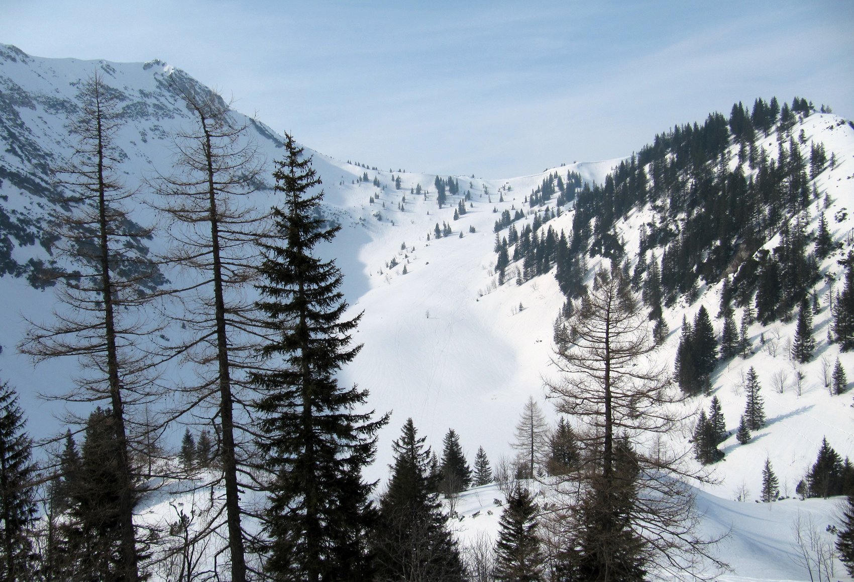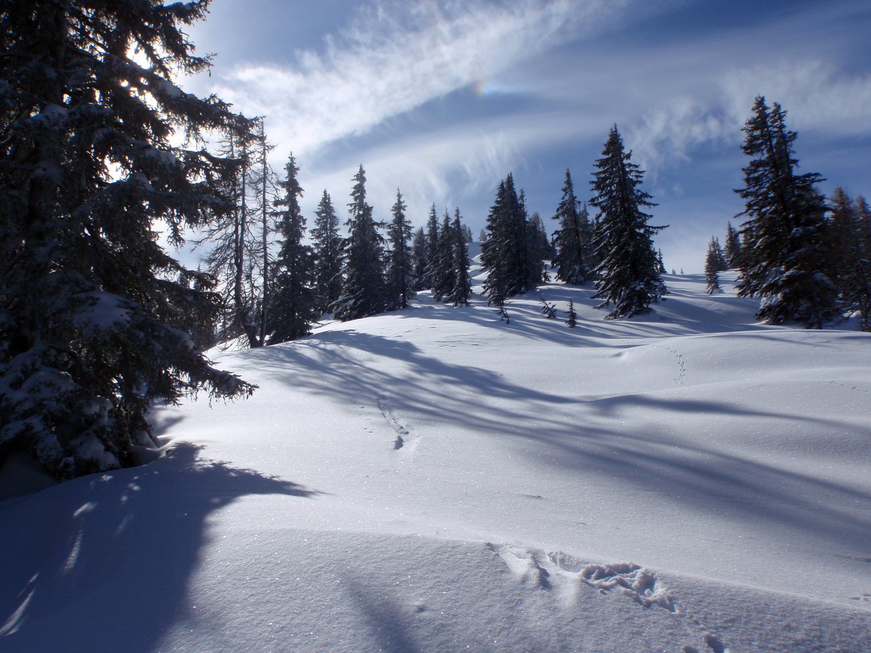 Auch bei einem Traumwochende kann man einsame Touren machen, wie dieser Berg zeigte. Die angespannte Lawinensituation erforderte eine eine kleine Planänderung in die Radstädter Tauern. Doch auch unspektakuläre und unbekannte Ziele haben Ihren Reiz, wie dieses Ziel zeigt. Nach einem gemütlicher Anstieg durch den breiten Waldgürtel erreichten wir die Hochfläche mit glitzerndem Pulverschnee. Der Sturm der letzen Tage hatte viele Bäume in bizarre Schneekunstwerke verwandelt. Auf den sehr schönen Gipfelhängen wedelten wir beeindruckt Richtung Tal, wo wir die Tour im Walchhof aufklingen ließen.