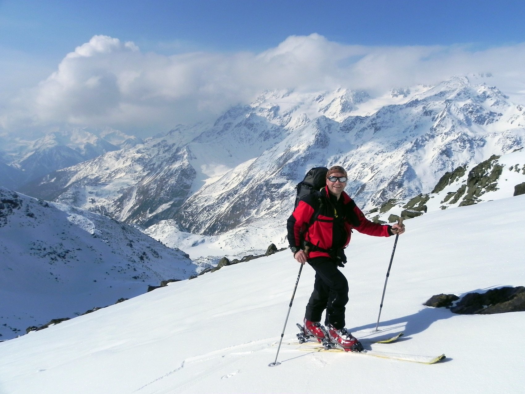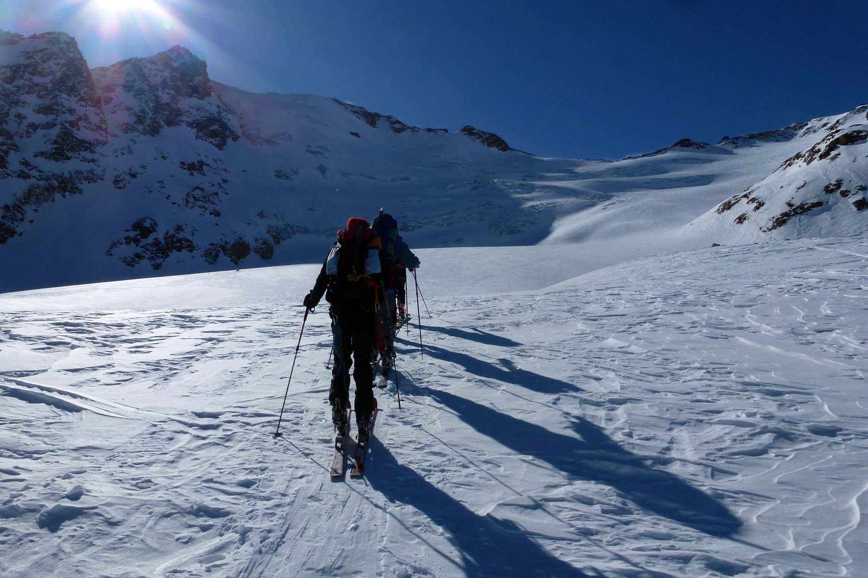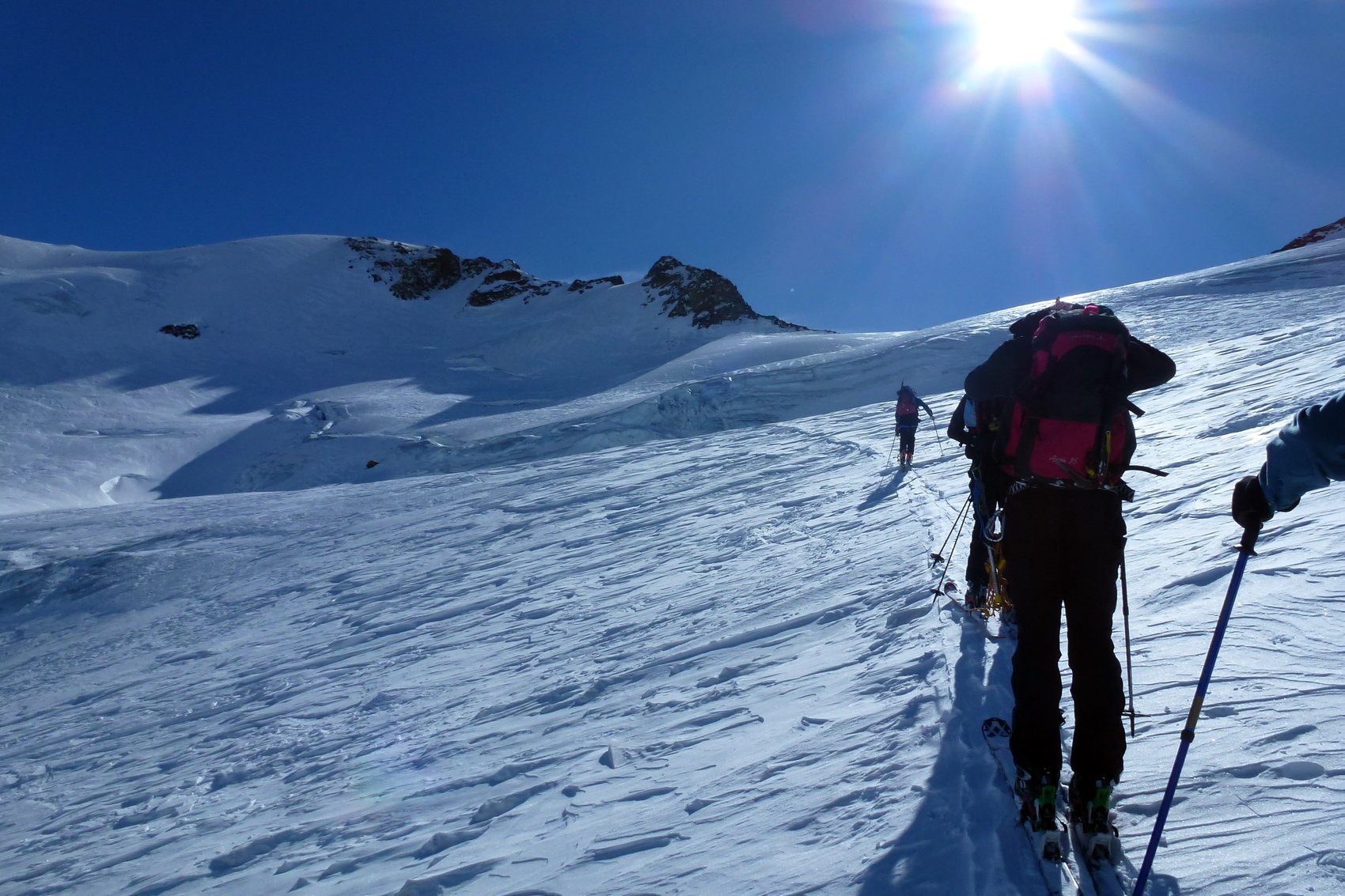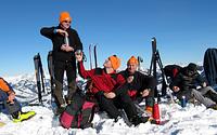Das traumhafte Panorama des Ortlergebirges mit seinen zahlreichen Dreitausendern in einer Skironda zu erleben ,war die Idee. Von Sulden am Ortler ging es am ersten Tag bei Sonnenschein über die Suldenspitze hoch zur Casati-Hütte. Nach einer mehr oder weniger erholsamen Nacht auf 3 269 m spurten wir am nächsten Morgen bei blauem Himmel zum Gipfel der Zufallspitze (3 757 m). Über den anschließenden Grat erreichten wir den Gipfel des Monte Cevedale (3 769 m). Nach einer ordentlichen Gipfelbrotzeit fuhren wir über vergletscherte Hänge ab zur Refugio Cevedale (2 607 m). Bei der Überschreitung der dritten Veneziaspitze (3 396 m) zur Zufallhütte am dritten Tag bot sich uns ein traumhaftes Panorama über das Ortlergebirge. Aufgrund eines Kommunikationsproblems bei der Hüttenreservierung wurden wir im Ruheraum der Blockhaussauna der Zufallshütte einquartiert. Nach einer wirklich erholsamen letzten Nacht ging es über das Schöntaufjoch (3 193 m) zurück nach Sulden.