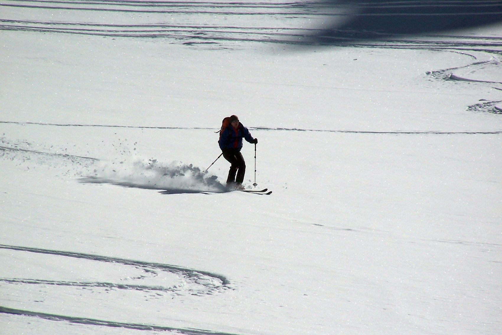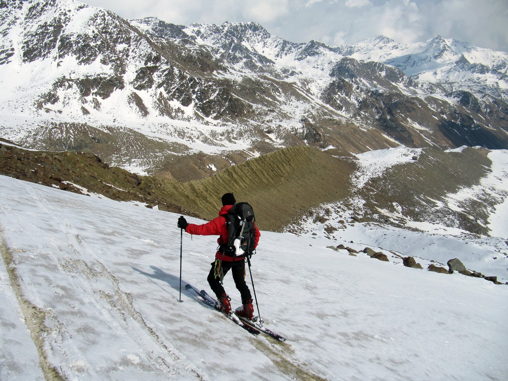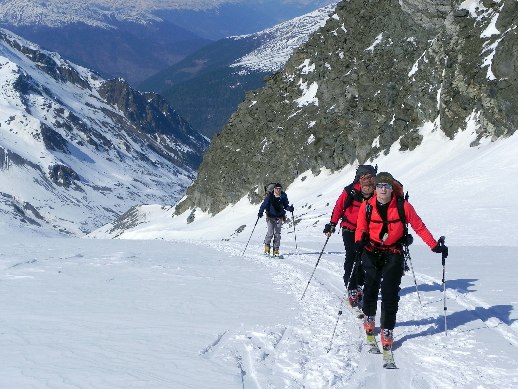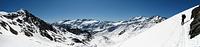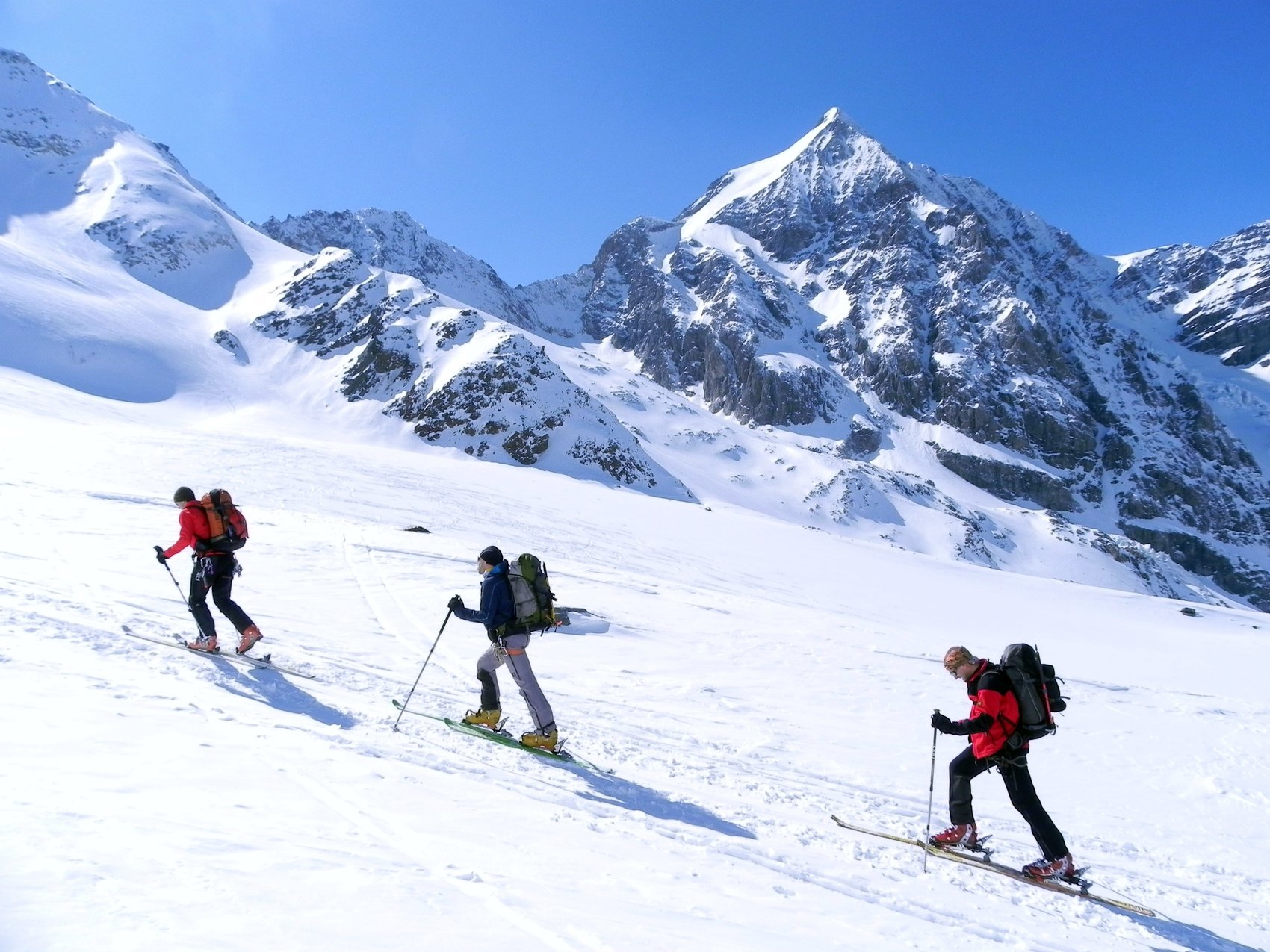 Das traumhafte Panorama des Ortlergebirges mit seinen zahlreichen Dreitausendern in einer Skironda zu erleben ,war die Idee. Von Sulden am Ortler ging es am ersten Tag bei Sonnenschein über die Suldenspitze hoch zur Casati-Hütte. Nach einer mehr oder weniger erholsamen Nacht auf 3 269 m spurten wir am nächsten Morgen bei blauem Himmel zum Gipfel der Zufallspitze (3 757 m). Über den anschließenden Grat erreichten wir den Gipfel des Monte Cevedale (3 769 m). Nach einer ordentlichen Gipfelbrotzeit fuhren wir über vergletscherte Hänge ab zur Refugio Cevedale (2 607 m). Bei der Überschreitung der dritten Veneziaspitze (3 396 m) zur Zufallhütte am dritten Tag bot sich uns ein traumhaftes Panorama über das Ortlergebirge. Aufgrund eines Kommunikationsproblems bei der Hüttenreservierung wurden wir im Ruheraum der Blockhaussauna der Zufallshütte einquartiert. Nach einer wirklich erholsamen letzten Nacht ging es über das Schöntaufjoch (3 193 m) zurück nach Sulden.
