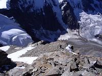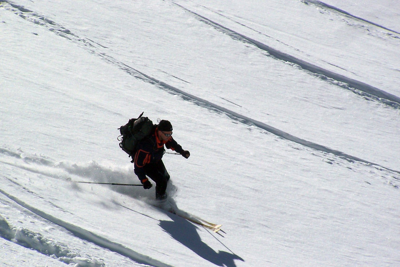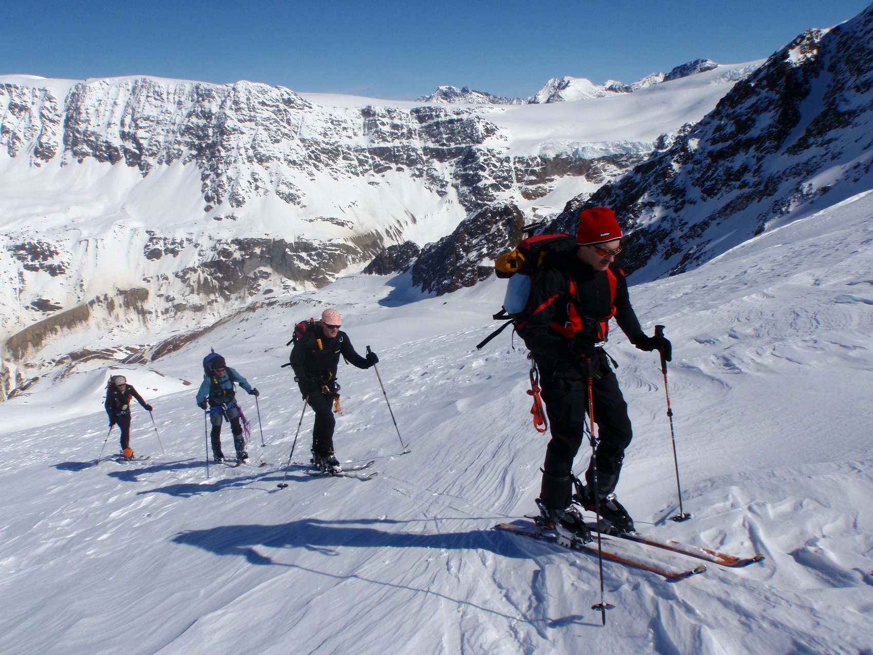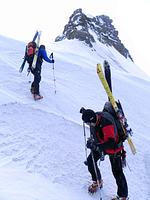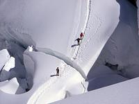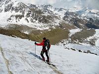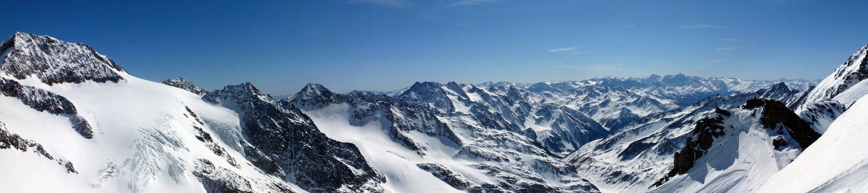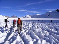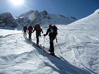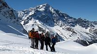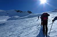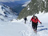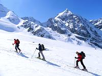 Direkt von unserem Quartier am Talende in Melag starteten wir zu unseren Touren. Mehrere Dreitausender dienten uns zur Akklimatisierung, bevor wir uns am letzen Tag an einen größeren Brocken wagten. So wurden an den darauffolgenden Tagen die Falbanairspitze (3 199 m), der Glockhauser (3 025 m) und das Mittereck (2 908 m) bestiegen. Für den letzen Tag haben wir uns dann als krönenden Abschluß noch den Äußeren Bärenbartkogel (3 473 m) aufgehoben. Über eine steile Endmoräne erfolgte der Zugang zu einer beeindruckenden Hochgebirgslandschaft mit wilden Gletscherbrüchen. Vom Skidepot ging es dann noch in leichter Gratkletterei auf den Gipfel, der bei wolkenlosem Himmel eine umfassende Rundsicht Richtung Berner und Glarner Alpen hin zur Bernina und zum Ortler-Massiv bot.