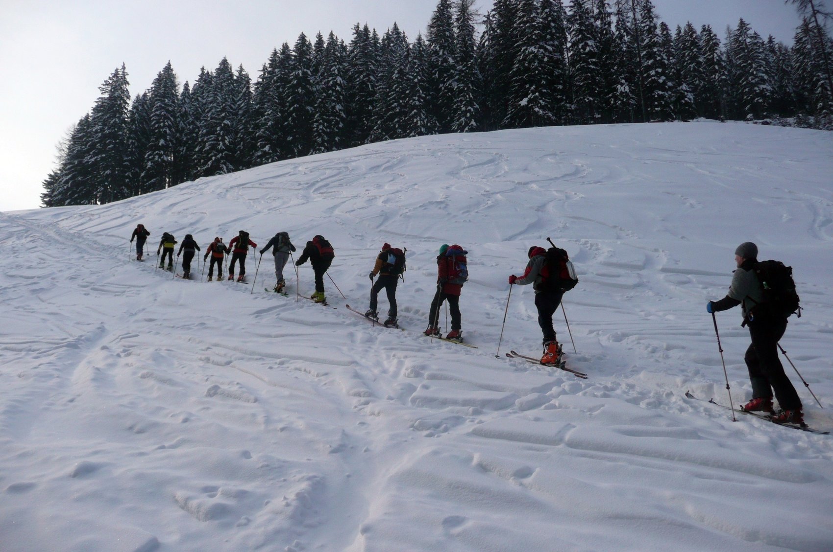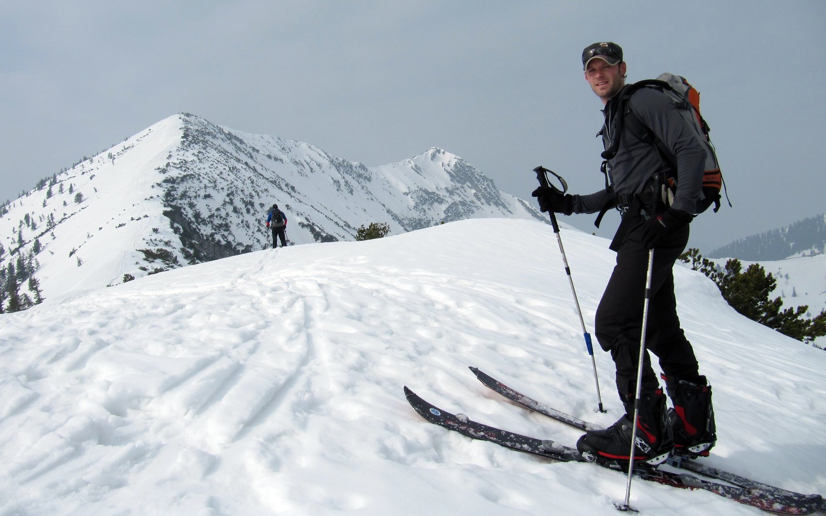 Über eine Forststraße und nicht allzu steile Hänge ging’s zur Baumoos-Alm, die im dichten Nebel erst auf den letzten Metern davor auszumachen war. Nach kurzem Aufschwung und einer flachen Passage standen wird unterm Steilner Joch. Gut, daß es recht hart war, so konnten wir uns die diversen Harscheisen-Typen vorführen: die einen so dünn und kurz, daß ein Bierdeckel, den man sich unter die Bindung zwickt, auch nicht schlechter wär, die anderen so riesig, daß mancher mit dem Blech seinen Carport decken würde.
