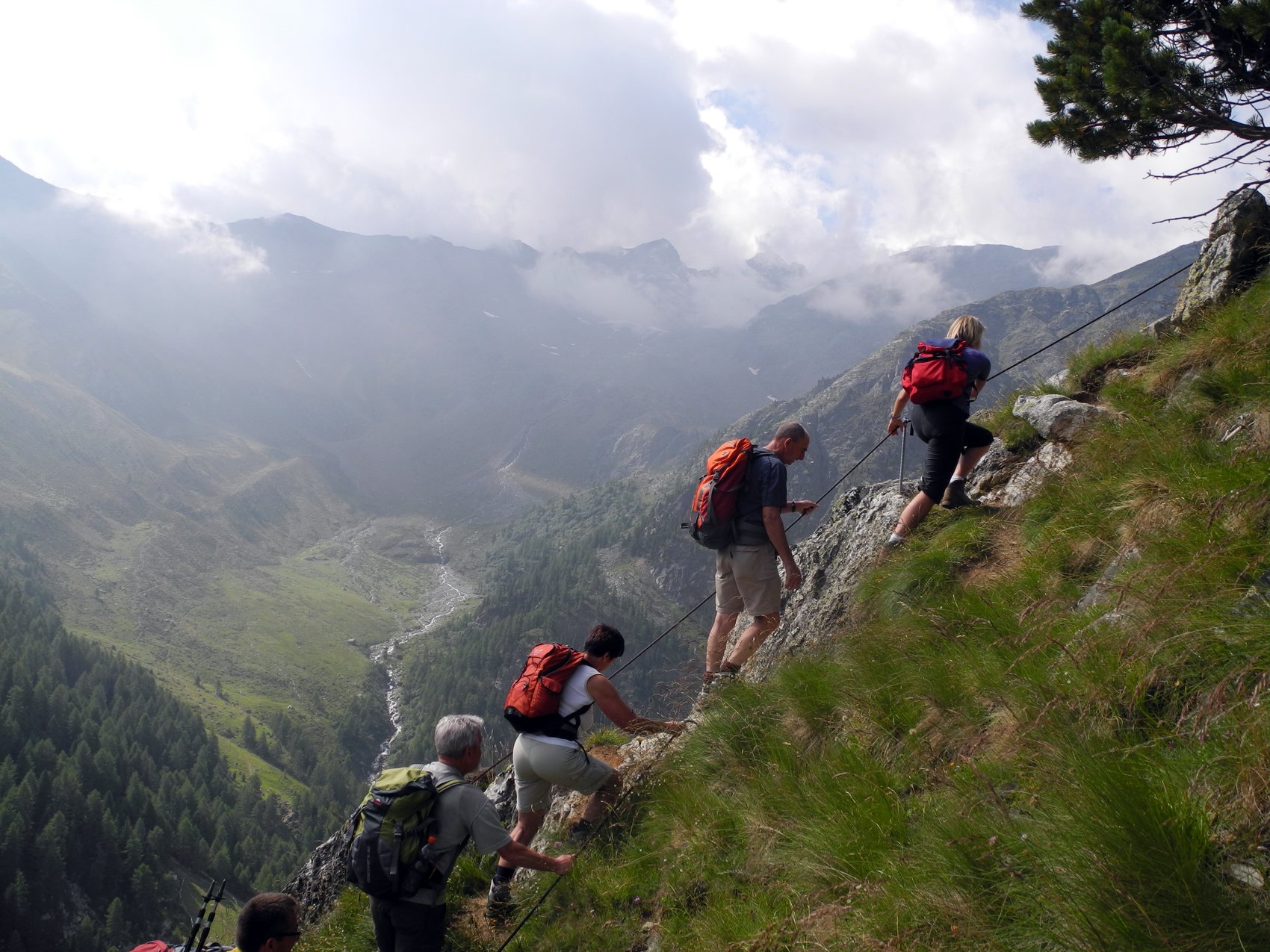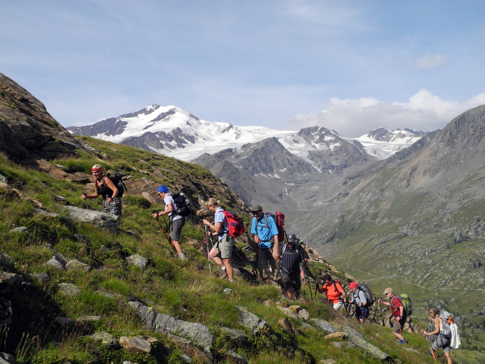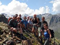 Zum Eingehen wählte Fritz einen Höhenweg unterhalb der Laaser Spitze, der die 14-köpfige Gruppe zum Zirmbichl in 2 750 m brachte. Eine sichere Wetterlage ermöglichte am 2. Tag den Aufstieg zum Vorderen Rotspitz (3 033 m), gleichzeitig der Höhepunkt der Tourentage. Kondition und Trittsicherheit waren Grundvoraussetzungen für die 9-stündige Tour. Als Abstieg wurde der Umweg über die Marteller Hütte (2 610 m) mit grandiosen Ausblicken auf die schneebedeckte, fast 4 000 m hohe Ortlergruppe gewählt – und das im T-Shirt. Der Marteller Höhenweg am Tag danach, eine Bergwanderung auf gesicherten Steigen, diente mehr der Erholung, war aber bis zur höchstgelegenen Gastwirtschaft Stallwies (1 953 m) nicht zu unterschätzen. Wegen der ungünstigen, gewittrigen Wetterlage musste am 4. Tag auf den zweiten Dreitausender verzichtet werden. Als Ersatz diente die Marteller Elferspitze, ein prächtiger Aussichtsberg, 750 Höhenmeter hoch und einem steilen Anstieg auf 2 260 m. Während die hohen Gipfel in Wolken gehüllt waren, schien hier fast ausschließlich die Sonne über dem Martelltal. Nach einer Stärkung in der Soyalm schloss sich die Wanderung entlang des 1 860 m hohen Zufrittsees an, dessen eisige Temperatur zwei Unerschrockene nicht vom Baden abhalten konnte. Vor der Heimreise am letzten Tag verabschiedeten sich die Bergsteiger mit einer Wanderung in den steilen Hängen des Ostgebietes von Martell von der anstrengenden und doch erholsamen Unternehmung.