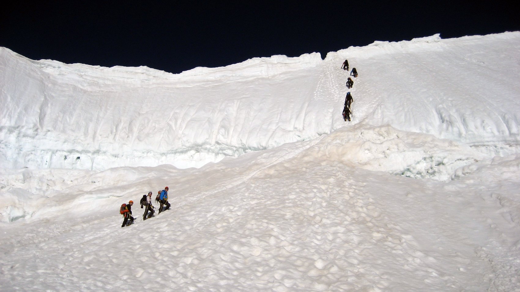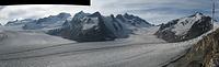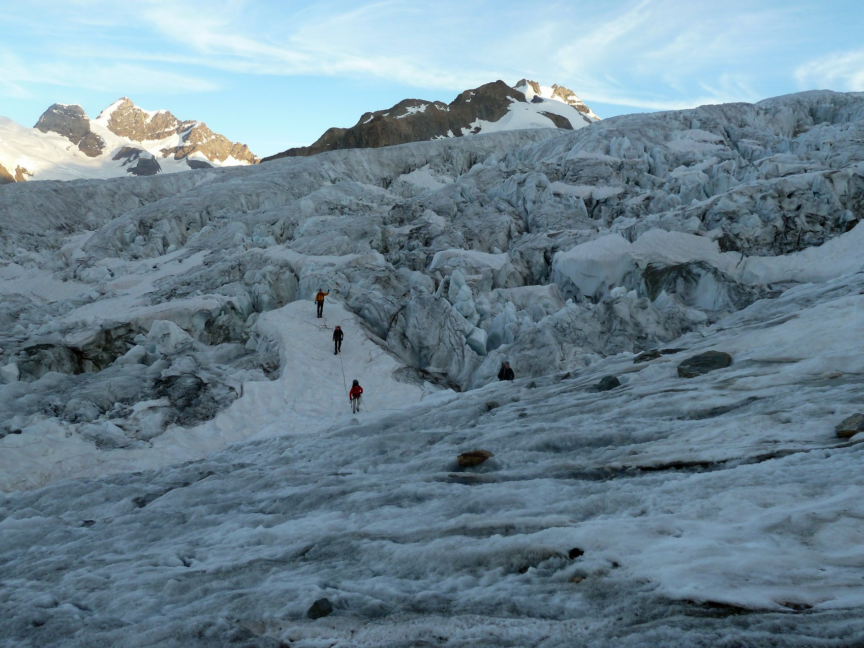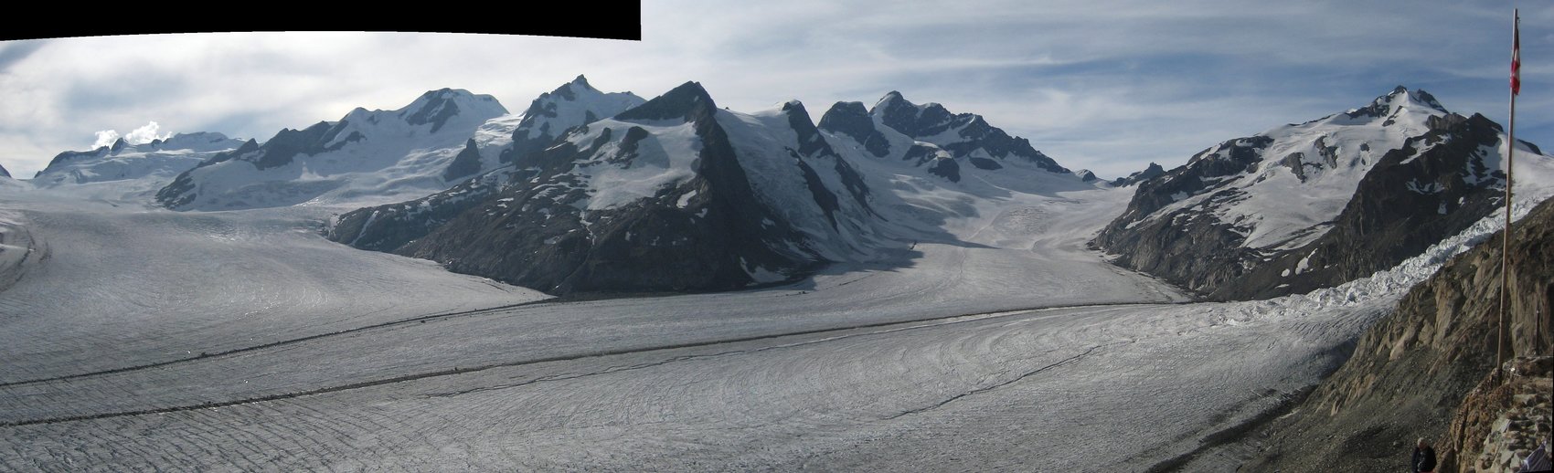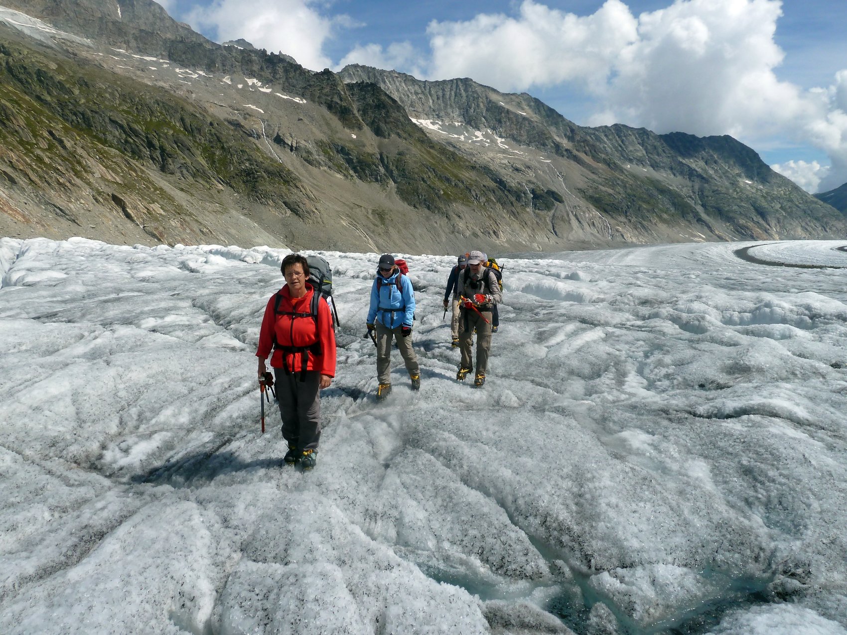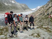 Aufgrund der langen Anfahrt, es waren ca. 600 km bis zum Ausgangspunkt der Tour, planten wir einen Tag nur für die Anfahrt ein. Am zweiten Tag warteten wir ab, bis es zu regnen aufgehört hatte und nahmen die Seilbahn bis auf die 2 212 m hoch gelegenen Mittelstation des Eggishorns. Von nun an sollte es nur noch zu Fuß den Gipfelzielen entgegen gehen. Anfangs noch auf breiten Wanderweg und durch den Tunnel zur Gletscherstube am Märjlensee und kurz darauf durch die Spaltenlabyrinthe des Großen Aletschgletschers. Die Abmessungen des mächtigsten Eisstroms der Alpen, weist dieser heute noch eine Länge von über 20 km auf, hatten jeden Teilnehmer erstaunt. An diesem Tag legten wir eine Strecke von über 8 km nur auf dem Gletscher zurück und kamen am Nachmittag an der Konkordiahütte (2 850 m) an. Die Konkordiahütte befindet sich ca. 150 Höhenmeter über dem Gletscher und ist nach unseren Zählungen über eine Eisentreppe mit 467 Stufen zu erreichen.