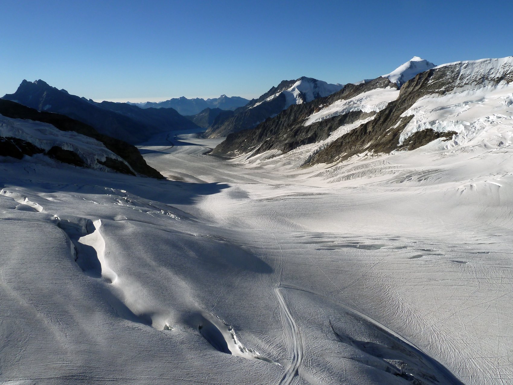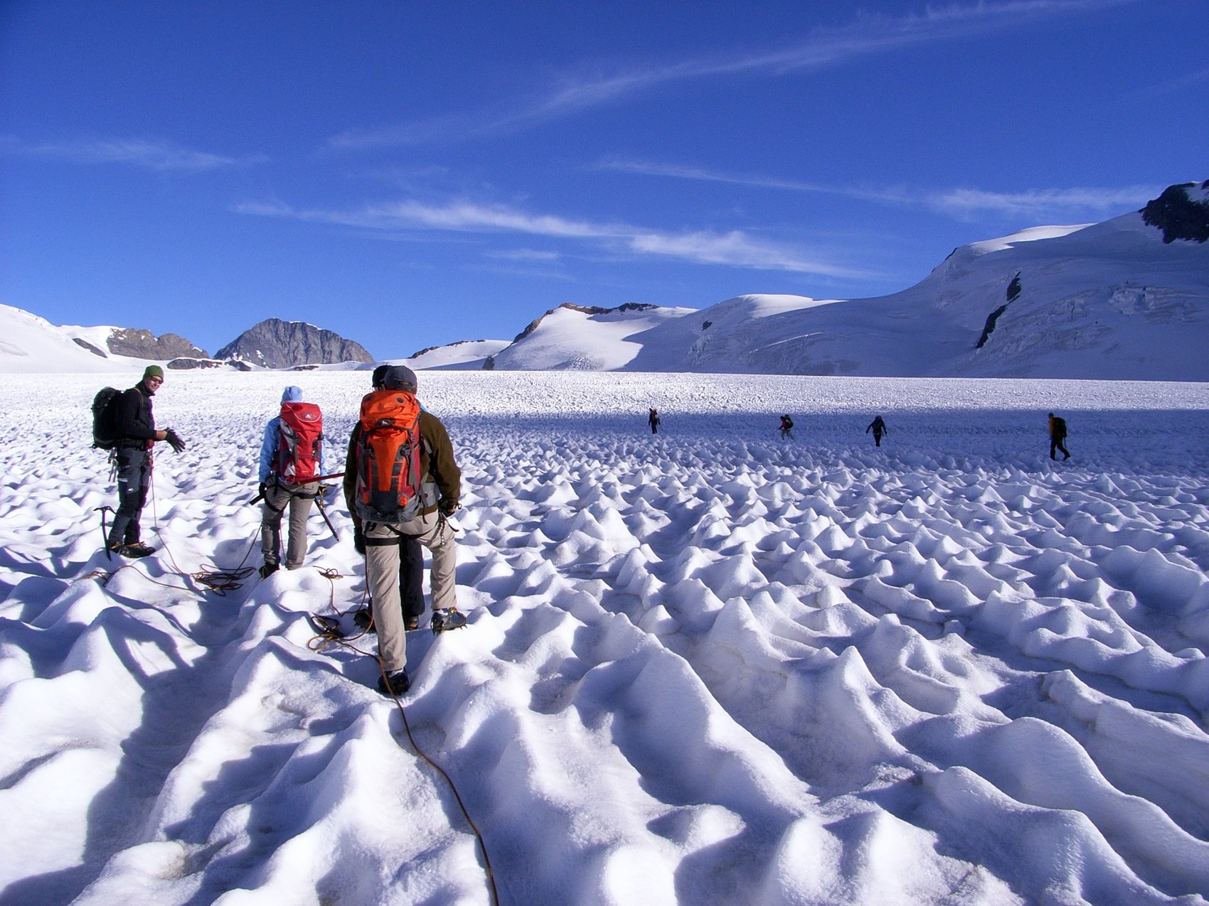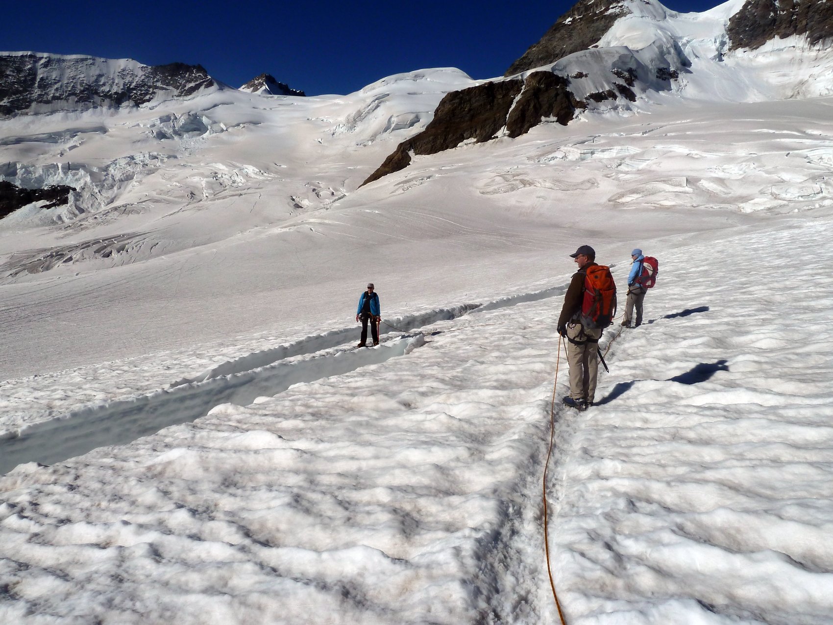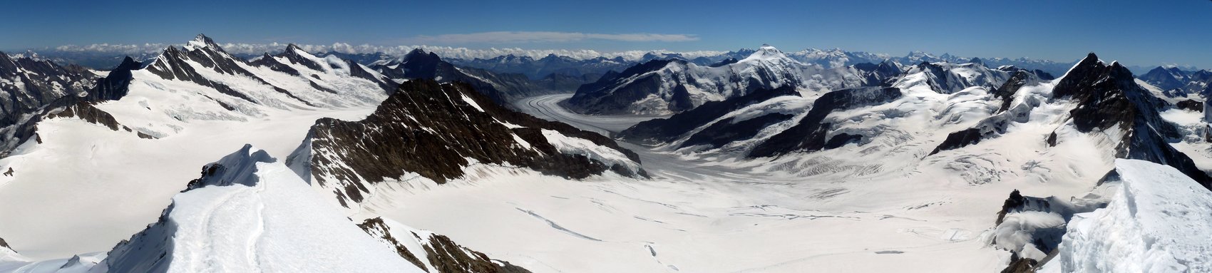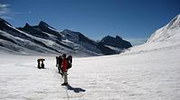 Der Samstag stand im Zeichen der Jungfrau. Für fünf Bergsteiger von uns begann der Tag sehr zeitig. Sie machten sich in Richtung Jungfrau auf den Weg. Leider hatte ein Großteil der Hütte ebenfalls das gleiche Ziel und so kam es an den Kletterstellen zu Stauungen, was sehr viel Geduld und Zeit kostete. Gegen Mittag wurde von der 5-köpfigen Gipfelmannschaft das Ziel – die Jungfrau mit ihren 4 158 m – erreicht. Nicht nur bei den 4000er-Neulingen wie Christl Wiedenhofer und Christian Hölzl war die Freude über das erreichte große Ziel sehr groß! Der Abstieg erfolgte als direkte Variante zum Jungfrauenfirn und nicht wie im Aufstieg über den Rottalhorn-Ostgratsporn. All diejenigen, die bedingt durch kleinere Verletzungen (Blasen am Fuß, Prellungen, etc.) den Gipfel nicht erreichen konnten, bekamen die Chance, die Bergstation Jungfraubahn (3 464 m) – Europas höchster Bahnhof – kennenzulernen. Eine Stunde bevor die erste Bahn hinauf kam und die Station noch menschenleer war, konnten alle Sehenswürdigkeiten, wie Eispalast, Sphinx oder die Ausstellung zum 100. Jahrestag der Jungfraubahn, besucht werden. Nach der Besichtigung folgte der Abstieg zur Konkordiahütte. Am Abend waren Gipfelmannschaft und Besichtigungsmannschaft auf der Konkordiahütte vereint.