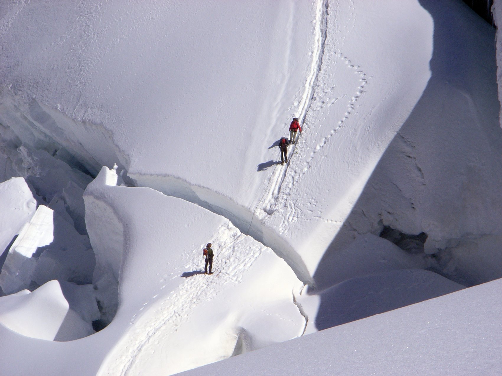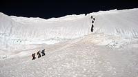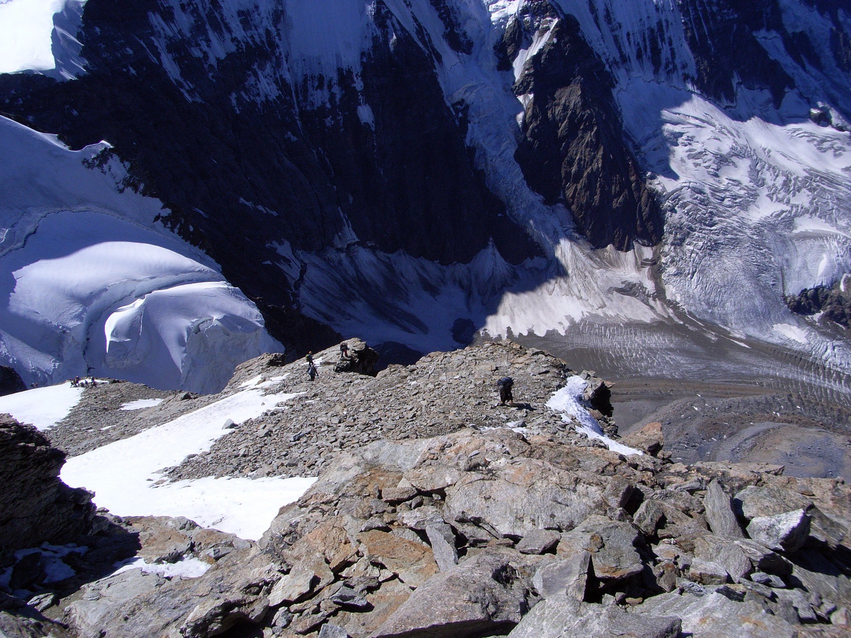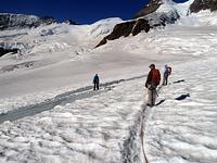 Der nächste Morgen begann für uns um 4.00 Uhr. Erst ging es die Stufen wieder hinab, um mit dem Anstieg zur 3 657 Meter hoch gelegenen Mönchsjochhütte beginnen zu können. Unser Weg führte uns über das Ewigschneefäld, das anfangs sehr verspaltet und steil ist und sich später flach zwischen Trugberg und den Fiescherhörnern einbettet.Gegen 11.00 Uhr kamen wir an der Mönchsjochhütte (3 650 m) an. Wir legten in dieser Zeit eine Strecke von 10 km ausschließlich auf Eis und Schnee zurück. Für den Nachmittag war der Anstieg zum nahegelegenen Mönch eingeplant. Doch leider konnten sich nur Markus Wild und Marcel Kießling für diesen Gipfel begeistern. Sehr abwechslungsreich gestalteten sich die 500 Höhenmeter zum 4 107 m hohen Mönch. Die Aussicht vom Gipfel war Dank des wolkenlosen blauen Himmels gigantisch.