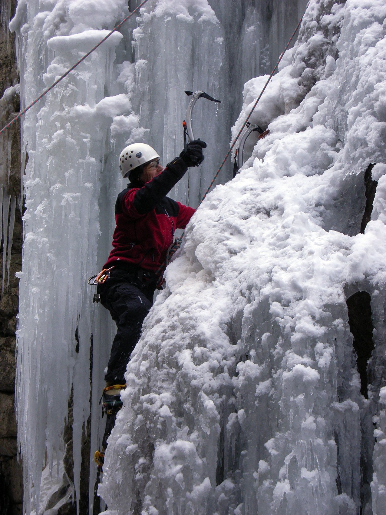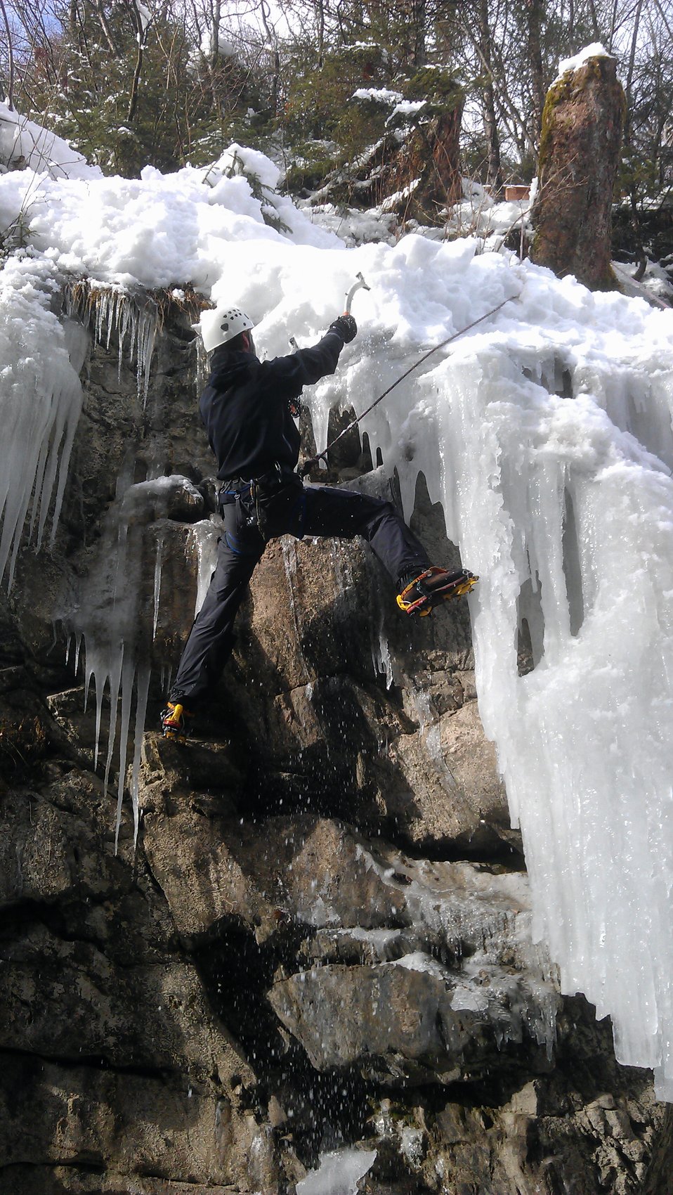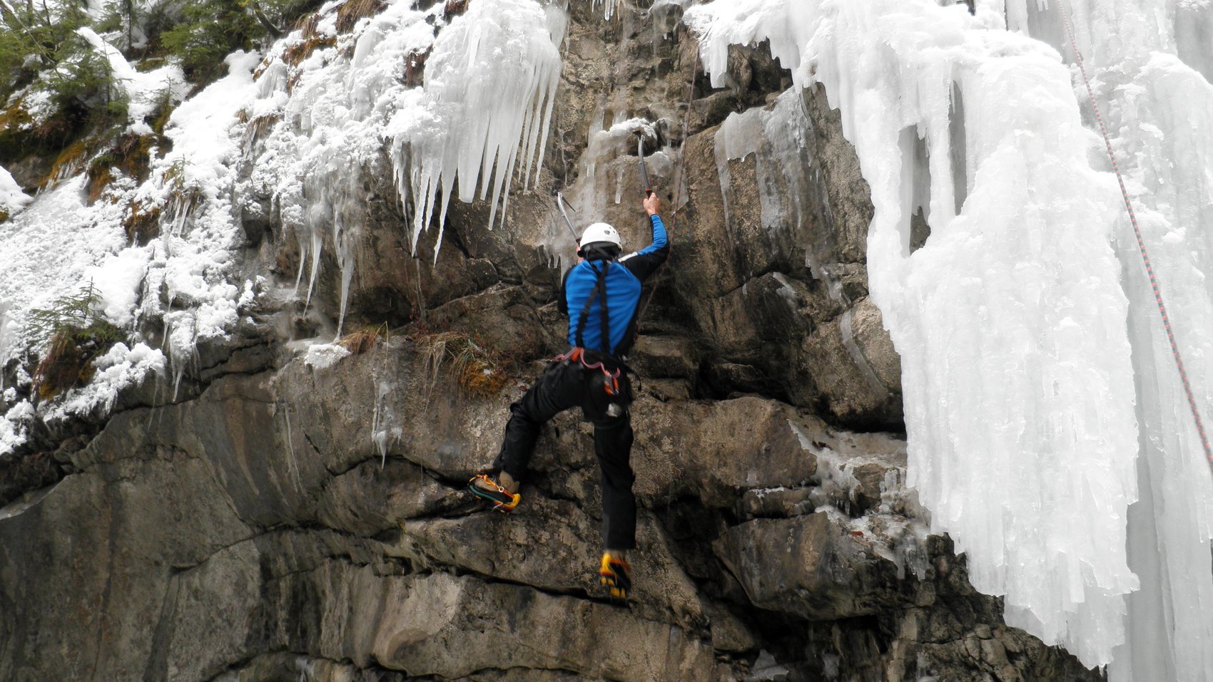 Die Radstädter Tauern zwischen Unter- und Obertauern bieten auf engstem Raum zahlreiche Eisklettermöglichkeiten. Aufgrund der besonderen Lage gibt es hier meist gutes Eis und es besteht keine Lawinengefahr. Für diesen Tag haben wir uns den 30 m hohen Eisfall THE BEGINNER ausgesucht. Verschiedene Linien im Schwierigkeitsgrad WI2 und WI3 konnten geklettert werden. Weitere Klettermöglichkeiten boten uns zwei kurze knackige Eissäulen im Grad WI4+.