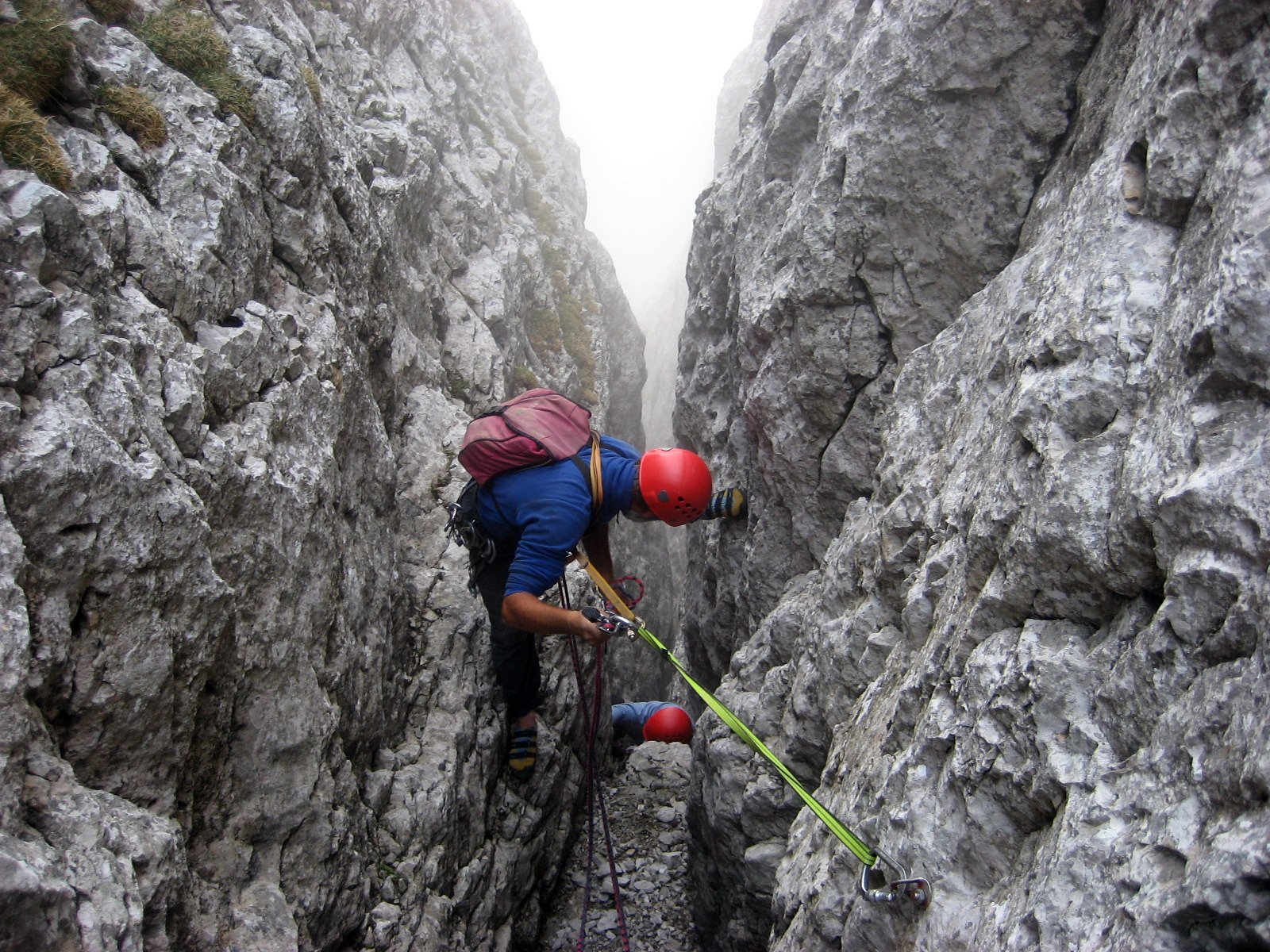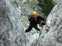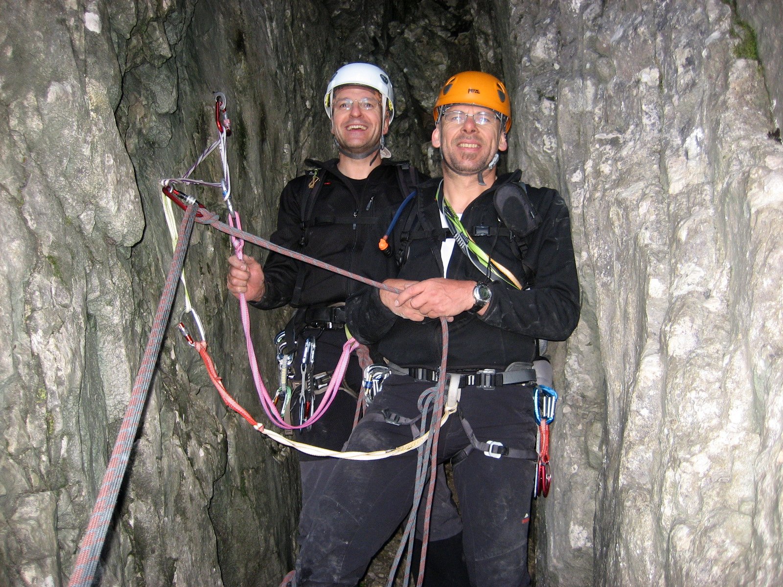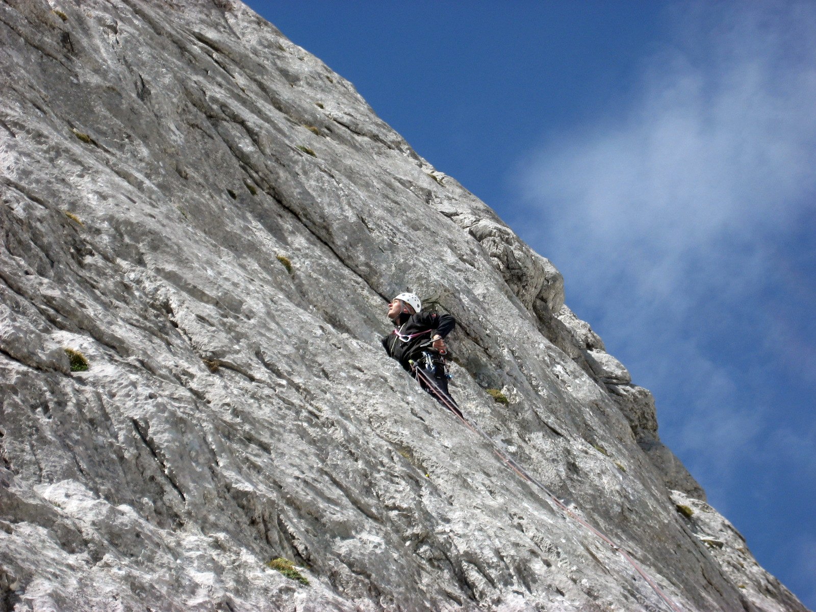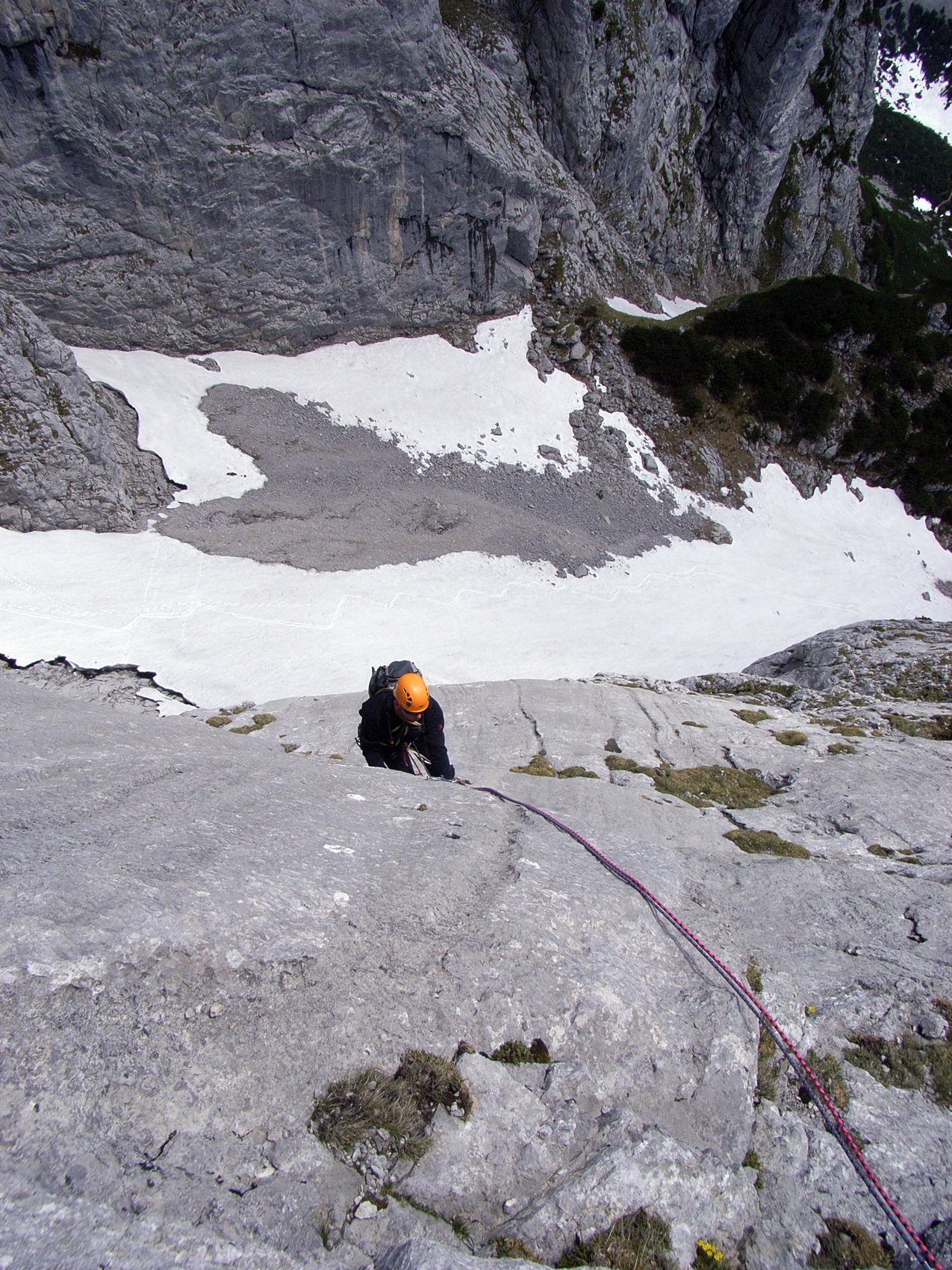 Das Klettergebiet um die Stuhlalm (1 462 m) auf der Nordseite des Dachsteinmassivs bietet kurze Mehrseillängenrouten in bestem Fels. Für den Samstag standen die sieben Seillängen der 220 m langen Route Halleluja auf dem Programm. Der Klassiker bot uns eine herrliche henkelige Plattenkletterei im oberen 4. Schwierigkeitsgrad. Nach einem gemütlichen Hüttenabend folgte am Sonntag der Klassiker am Angerstein. Der Deyekamin ist ein 175 m langer schulterbreiter Kamin, der eine besondere Art von Kletterei im oberen 4. Schwierigkeitsgrad bietet. Die altbewährte Raupentechnik kam an diesem Tag wiedereinmal zum Einsatz. An einer Engstelle mussten wir unseren Rucksack sogar mit einer Bandschlinge hinter uns herziehen.