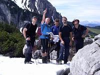 Mit Querungen, Spreizschritten und diversen Oberarmeinsätzen sind wir unter strahlendem Sonnenschein am Gipfel des Grünsteins angekommen. Mit Genuß wurde der Ausblick ins Berchtesgadener Land und auf das Watzmannmassiv mit der mitgebrachten Brotzeit verbunden.