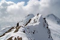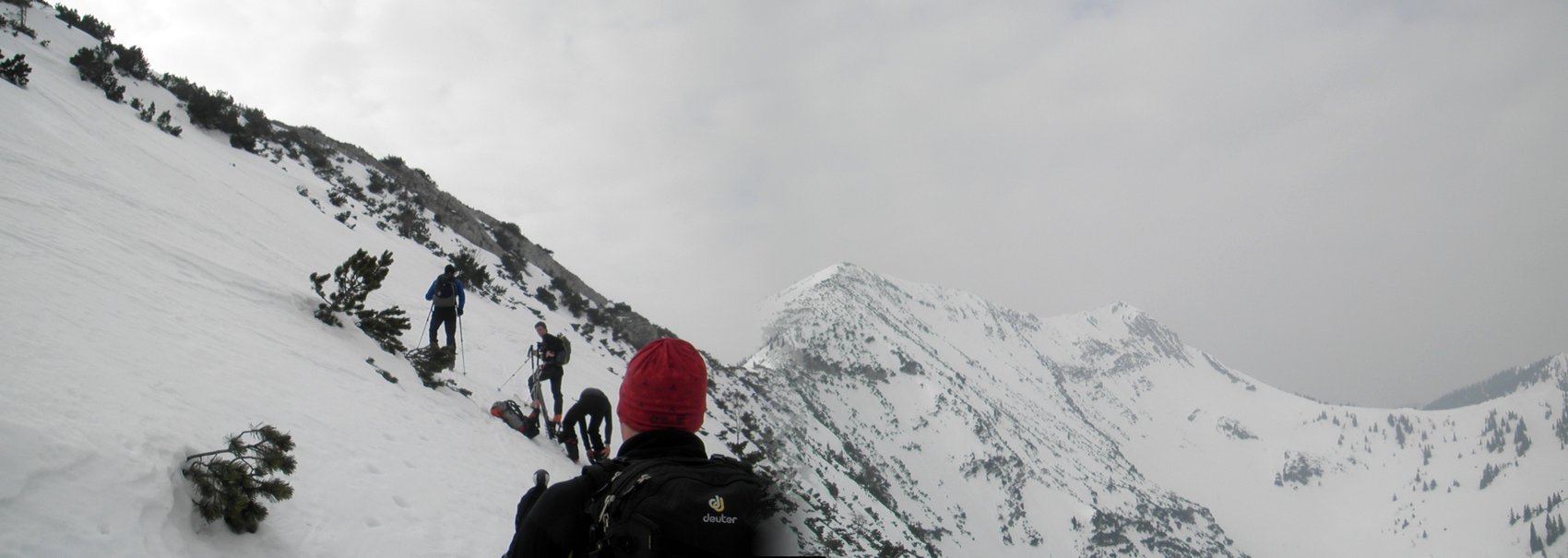Auf den letzten hundert Höhenmeter am Grat entlang hatten wir einen guten Blick auf die tief verschneiten Hänge am Nordgrat und hinunter zur verfallenen Fell-Alm. So war die Entscheidung schnell gefallen, nach der Gipfelrast trotz 100 Höhenmeter Gegenanstieg diesen Weg zu nehmen. Und es hat sich gelohnt!