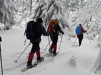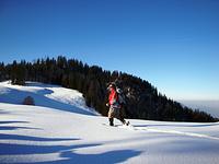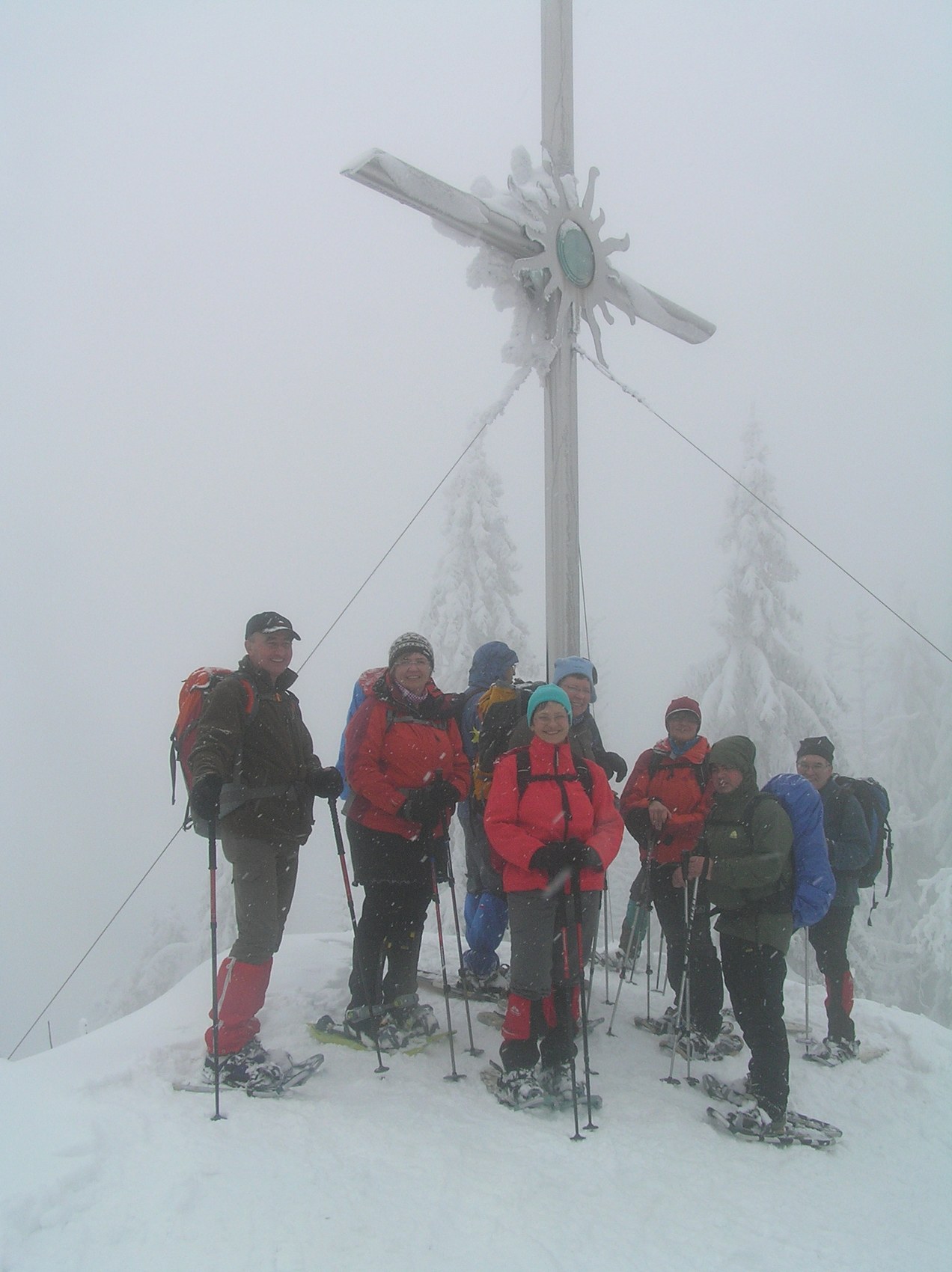 Pünktlich zur ersten Schneeschuhtour des Jahres fing es an zu schneien und das Gebiet rund um die Hörndlwand verwandelte sich in eine unberührte weiße Winterlandschaft. Es war nicht ganz einfach für Fritz, Heini und Christian, die sich beim Spuren abwechselten. Bis zur Brandner Alm konnten wir vorgegebenen Spuren folgen, ab da mussten wir unseren Weg dann selber suchen und versanken teilweise bis zu den Knien im Pulverschnee. Eine riesige steile Schneewechte, die sogar das Gipfelkreuz verschwinden lies, stoppte uns 10 Meter unterhalb des Zieles. Nach 3 ½ Stunden Gehzeit bei sonnigem Föhnwetter und bester Rundsicht schmeckte die verdiente Brotzeit. Diverse Sturzeinlagen beim Abstieg sorgten für allgemeine Belustigung.