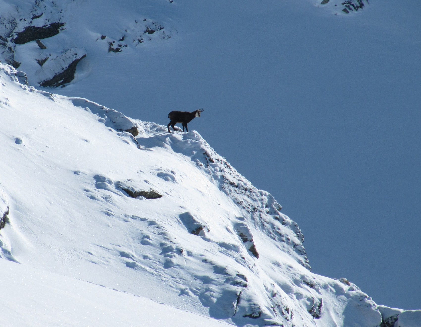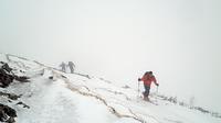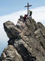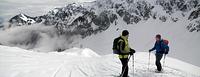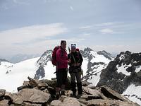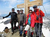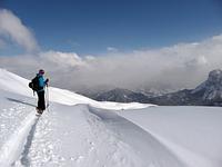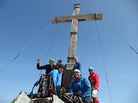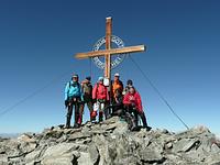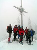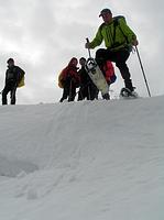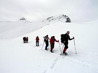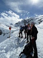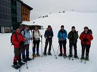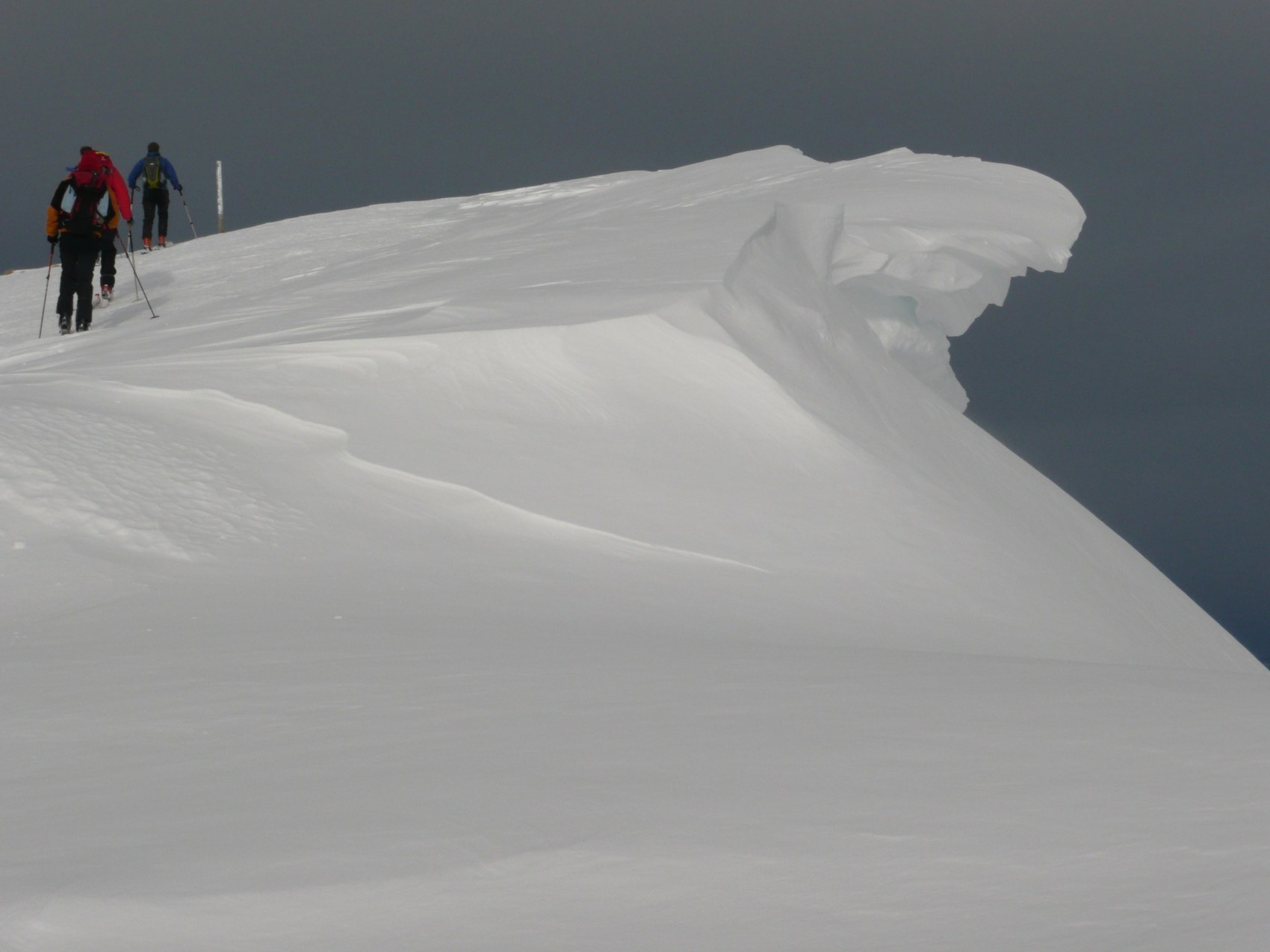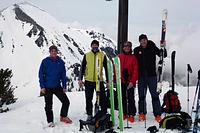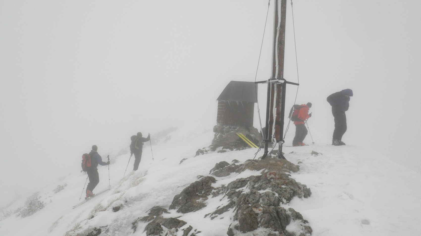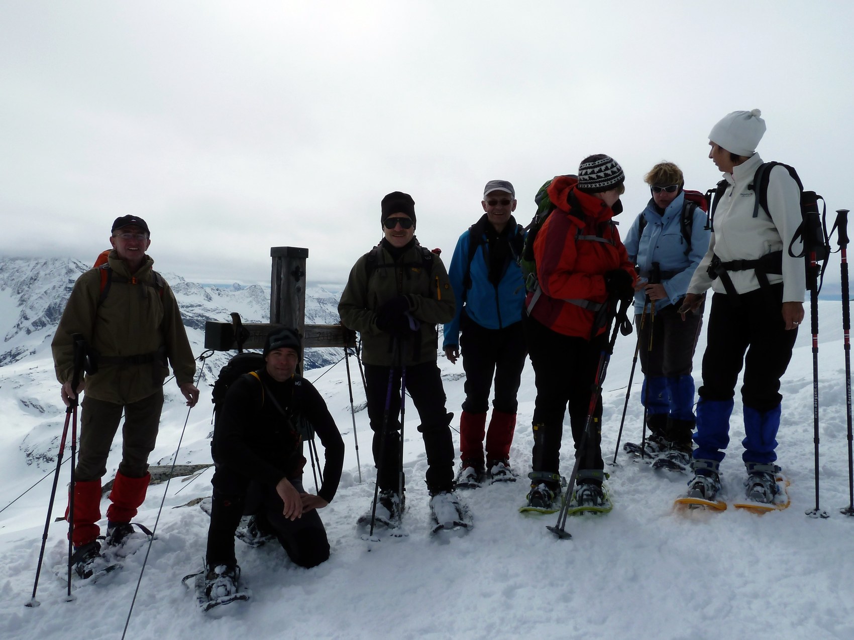 Den Gipfeltag begannen wir mit einem Abstieg von ca. 150 Höhenmetern. Dann ging es bei schlechter Sicht um den Weißsee (ein Stausee) herum. Im Laufe des Vormittags besserte sich das Wetter und am Gipfel, den wir gegen die Mittagszeit erreichten, gesellten sich Sonnenstrahlen zu uns. Da sich die Wolkenschicht gen Süden auf einer Höhe von ca. 3 300 m hielt, konnten die benachbarten Gipfel nur schwer ausgemacht werden. Nach unser Gipfelbrotzeit und einigen Fotoaufnahmen folgten wir unseren Aufstiegsspuren in entgegengesetzter Richtung. Der Abstieg war für einige sicherlich ebenso nervenaufreibend wie der Aufstieg, denn die kurze aber knackige Steilstufe musste ohne Schneeschuhe an unseren Füßen absolviert werden. Nach dem 2½-stündigen Abstieg trennten uns nur noch die 150 Höhenmeter, die für manch einen sicherlich zur Qual wurden, zur Hütte. Letztendlich setzten wir uns alle um 15.30 Uhr in die Gondel und schwebten dem Tal entgegen.