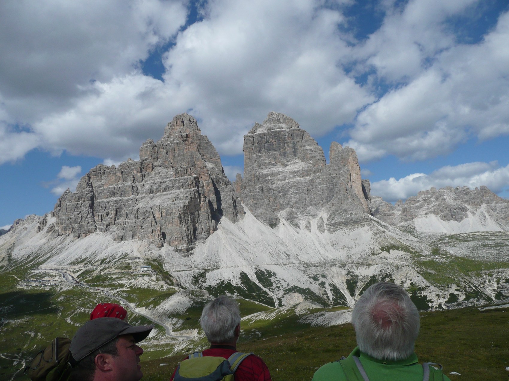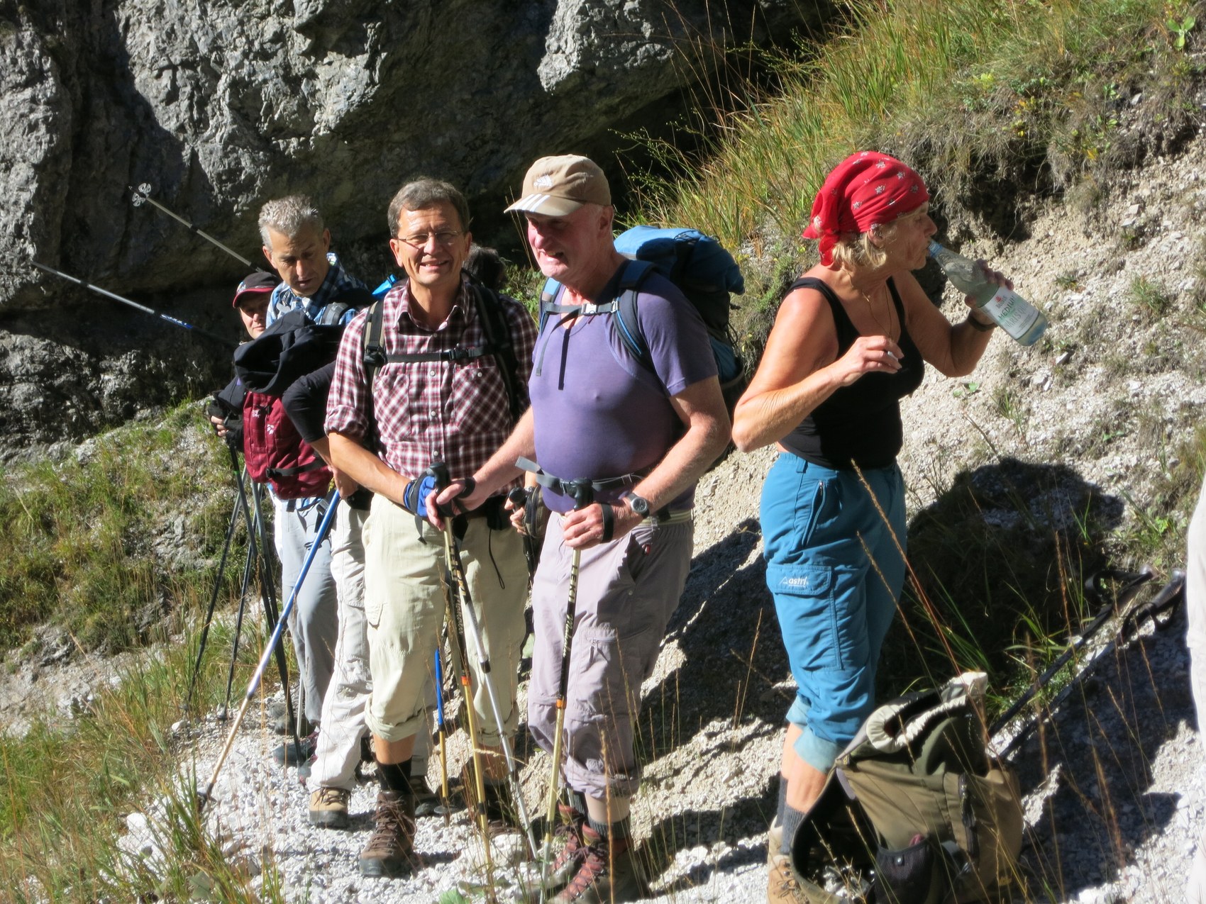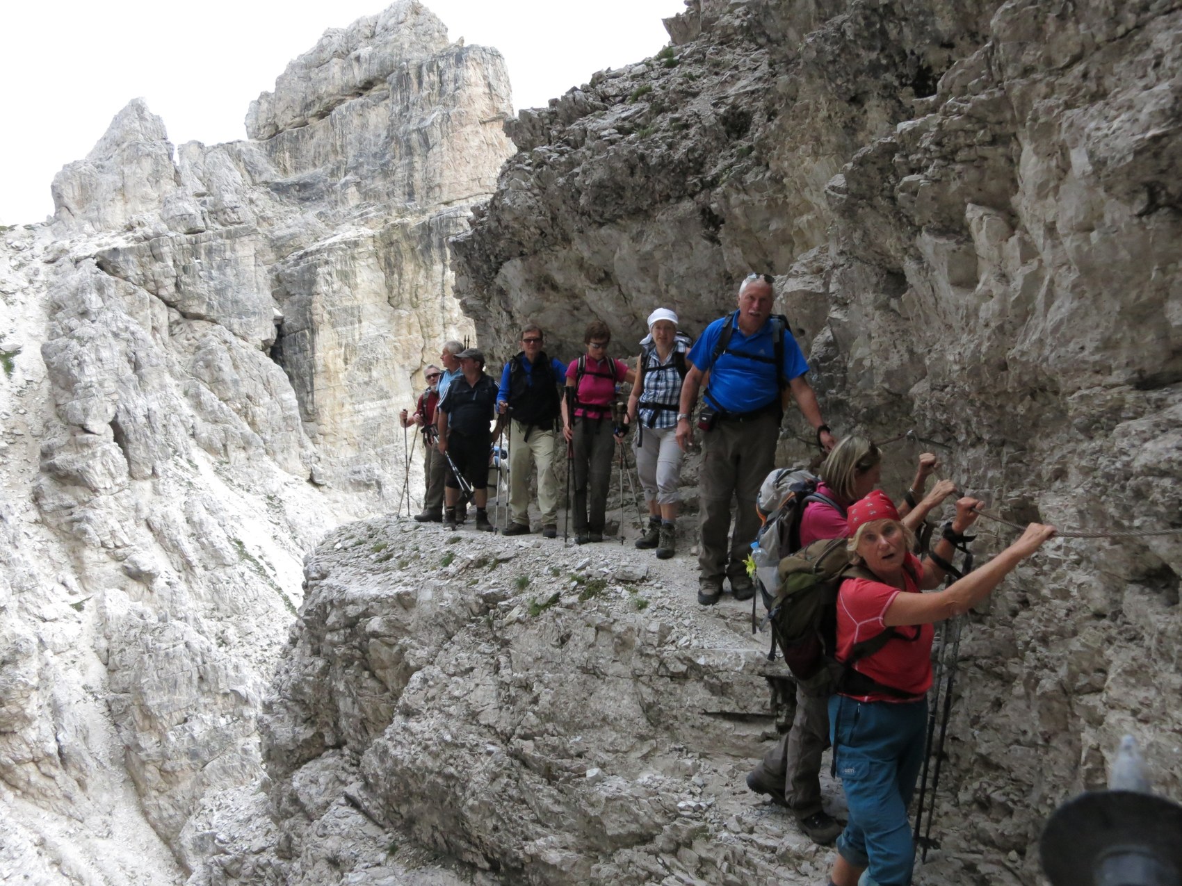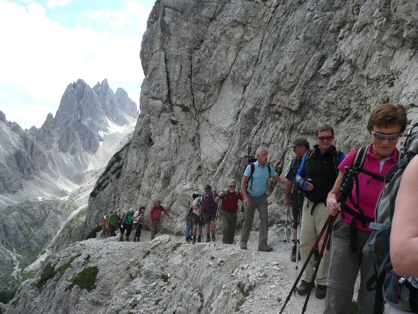 Trotz anfänglich unbeständigem Wetter verbrachten 18 Teilnehmer eine schöne und erfolgreiche Woche in den Dolomiten. Als Quartier diente das ziemlich genau zwischen Toblach und Cortina d’Ampezzo gelegene Hotel Dreizinnenblick, welches sich als hervorragender Ausgangs- und Verpflegungspunkt erwies. Obwohl wir auf Schritt und Tritt mit der traurigen Vergangenheit dieser Region im Ersten Weltkrieg konfrontiert wurden, kam auch das Bergsteigen nicht zu kurz. Neben einfachen, aber landschaftlich großartigen, Wanderungen wie zum Fanes-Wasserfall, auf den Monte Piano oder zum Strudelkopf durfte natürlich ein Klettersteig nicht fehlen. So beging eine Gruppe die Via Ferrata Michelle Strobel auf die Punta Fiames (2 240 m). Dies ist ein schöner Steig mittlerer Schwierigkeit durch eine von unten fast senkrecht erscheinende Wand. Direkt vor der Haustür begann der berühmte Weg durch das Rienztal hinauf zur Dreizinnen-Hütte. Selbstverständlich wurde auch dieser begangen, obwohl sich die drei Felssäulen beharrlich hinter einem Wolkenvorhang verbargen. Natürlich durfte auch ein Ausflug zum weltberühmten Pragser Wildsee nicht fehlen. Während die einen hier eine gemütliche Wanderung zum Großen Apostel (1 995 m) unternehmen, bestiegen die anderen den dominierenden Seekofel (2 810 m) mit immerhin 1 400 Höhenmetern, die es zu überwinden gab. Höhepunkt der Woche war zweifellos die gemeinsame Begehung des Sentiero Bonacossa vom Rifugio Fonda Savio zur Auronzohütte. Es gibt wohl keine schönere und ruhigere Annäherung an die Drei Zinnen. Viele Abschnitte dieser Route sind mit Drahtseilen versichert und erinnern eher an einen Klettersteig als an einen Wanderweg. Als Lohn winkten unglaubliche Ausblicke auf die drei Monumente aus Stein von einem überraschend wenig begangenen Weg.