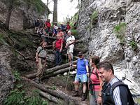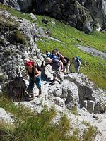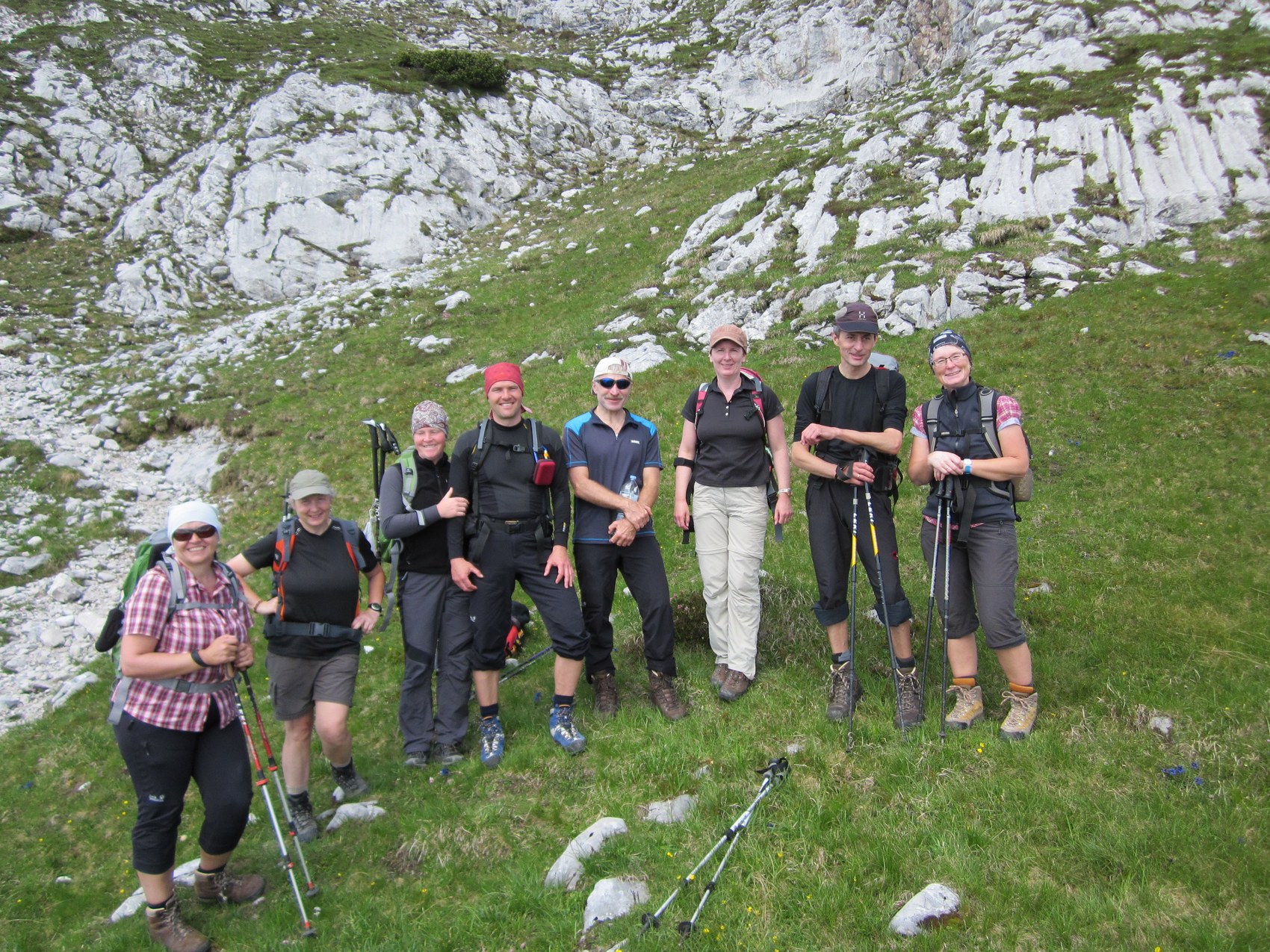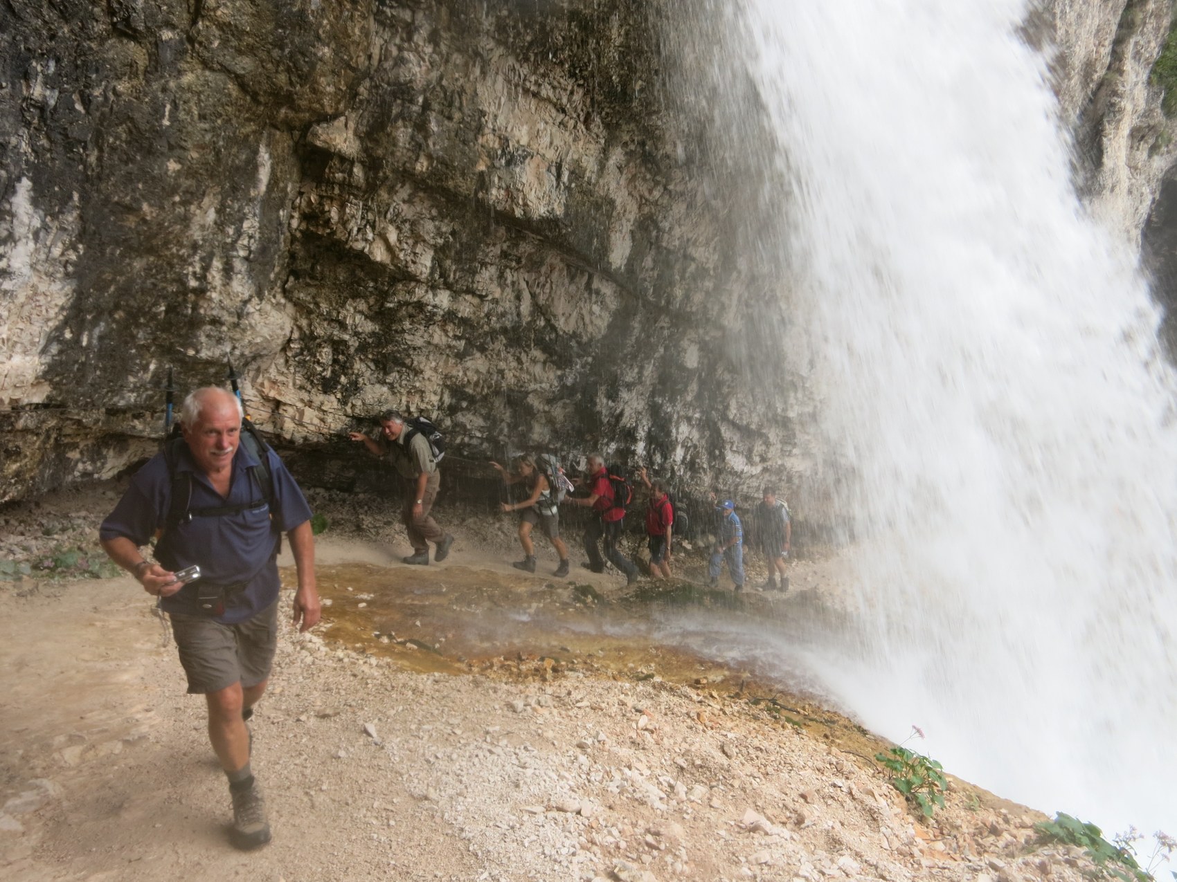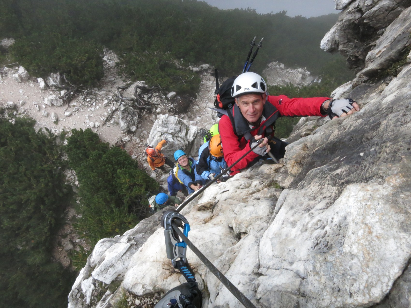 Trotz anfänglich unbeständigem Wetter verbrachten 18 Teilnehmer eine schöne und erfolgreiche Woche in den Dolomiten. Als Quartier diente das ziemlich genau zwischen Toblach und Cortina d’Ampezzo gelegene Hotel Dreizinnenblick, welches sich als hervorragender Ausgangs- und Verpflegungspunkt erwies. Obwohl wir auf Schritt und Tritt mit der traurigen Vergangenheit dieser Region im Ersten Weltkrieg konfrontiert wurden, kam auch das Bergsteigen nicht zu kurz. Neben einfachen, aber landschaftlich großartigen, Wanderungen wie zum Fanes-Wasserfall, auf den Monte Piano oder zum Strudelkopf durfte natürlich ein Klettersteig nicht fehlen. So beging eine Gruppe die Via Ferrata Michelle Strobel auf die Punta Fiames (2 240 m). Dies ist ein schöner Steig mittlerer Schwierigkeit durch eine von unten fast senkrecht erscheinende Wand. Direkt vor der Haustür begann der berühmte Weg durch das Rienztal hinauf zur Dreizinnen-Hütte. Selbstverständlich wurde auch dieser begangen, obwohl sich die drei Felssäulen beharrlich hinter einem Wolkenvorhang verbargen. Natürlich durfte auch ein Ausflug zum weltberühmten Pragser Wildsee nicht fehlen. Während die einen hier eine gemütliche Wanderung zum Großen Apostel (1 995 m) unternehmen, bestiegen die anderen den dominierenden Seekofel (2 810 m) mit immerhin 1 400 Höhenmetern, die es zu überwinden gab. Höhepunkt der Woche war zweifellos die gemeinsame Begehung des Sentiero Bonacossa vom Rifugio Fonda Savio zur Auronzohütte. Es gibt wohl keine schönere und ruhigere Annäherung an die Drei Zinnen. Viele Abschnitte dieser Route sind mit Drahtseilen versichert und erinnern eher an einen Klettersteig als an einen Wanderweg. Als Lohn winkten unglaubliche Ausblicke auf die drei Monumente aus Stein von einem überraschend wenig begangenen Weg.