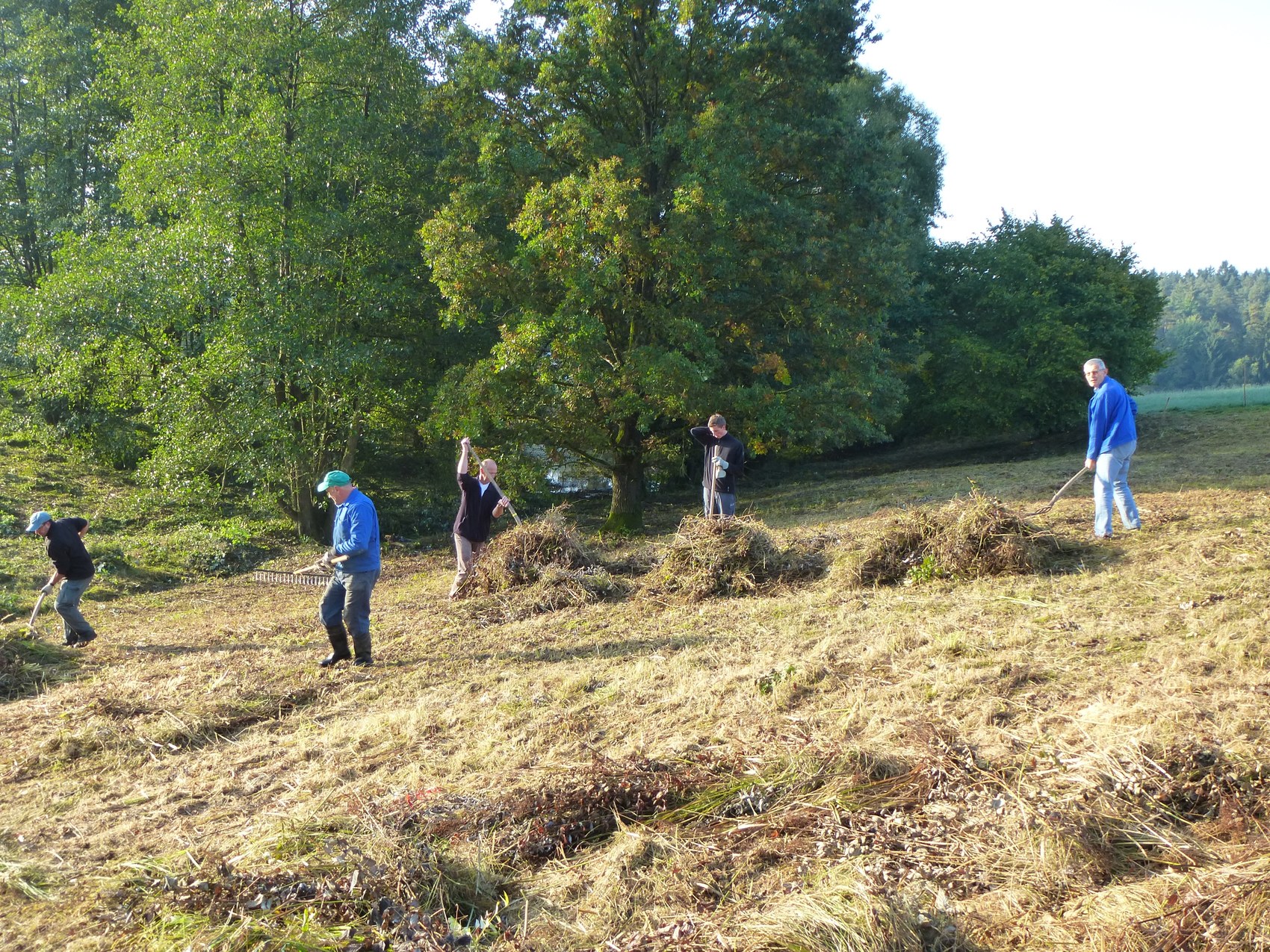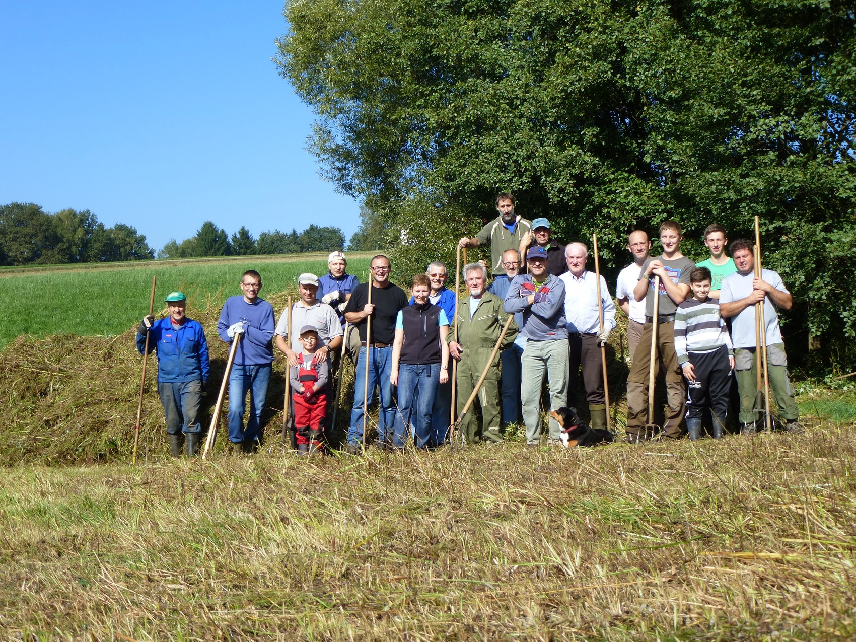 Über mehrere Tage hinweg wurde mit Balkenmäher und Motorsense vorab gemäht. Am Samstag, den 28. September, wurde von 20 freiwilligen Helfern das Schnittgut mit Rechen und Gabeln an den Rand der Feuchtfläche getragen und zum Abtransport gelagert. Alle waren erfreut, es auch dieses Jahr wieder geschafft zu haben, dieses Rückzugsgebiet der Natur für die Zukunft zu erhalten.