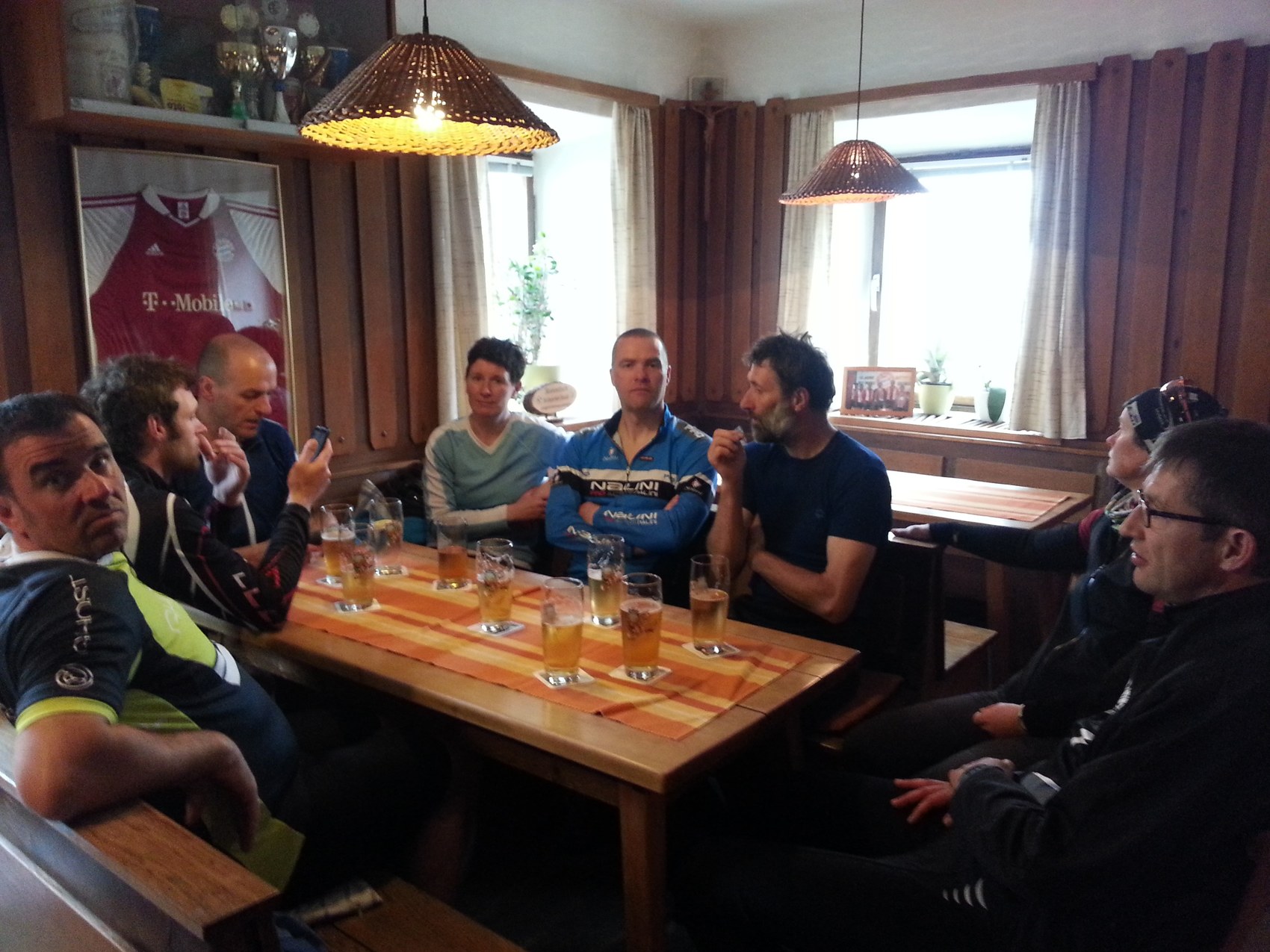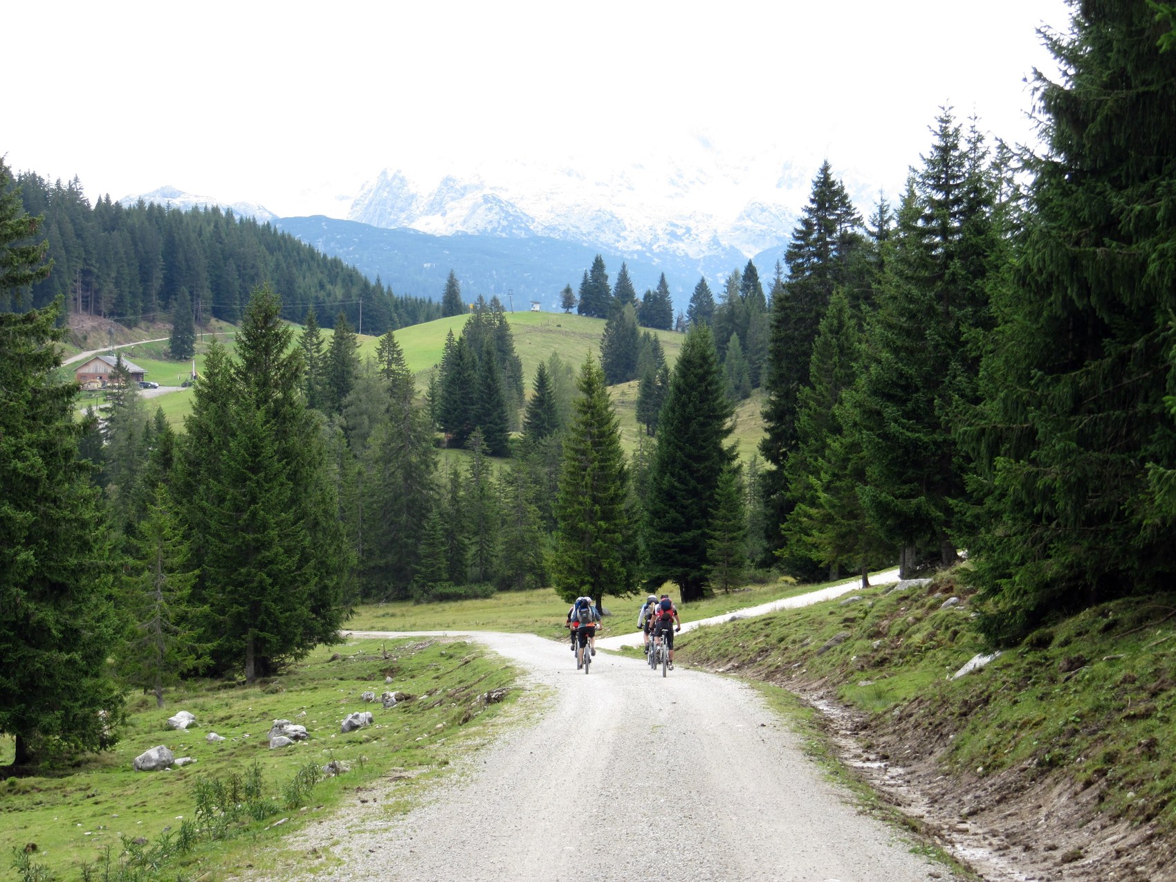 Nach gutem Frühstück starteten wir bei strömenden Regen zunächst nach Bad Aussee und mit einer längeren Bergetappe weiter zum Salzastausee. Der Regen hatte mittlerweile aufgehört und nach einer kleinen Stärkung kurbelten wir die berüchtigten 730 Hm hinauf zur Viehbergalm. Bei naßkalten einstelligen Temperaturen machten wir uns es bei Brotzeit, Kaffee und Nußstriezeln in der Almhütte gemütlich, bevor es steil und rasant hinunter – je nach Gusto auf der Forststraße oder auf dem steinigen Wanderweg – bis fast nach Gröbming ging. Vom Quartier trennten uns noch zwei teilweise zu schiebende Anstiege und ein traumhafte Trailabfahrt von der Assacher Scharte. Nach insgesamt 2200 anstrengenden Höhenmetern kamen wir um acht beim Rössinger Hof an, wo wiedereinmal das Abendessen – Hirschgulasch und Zwetschgendatschi – schon fertig war.