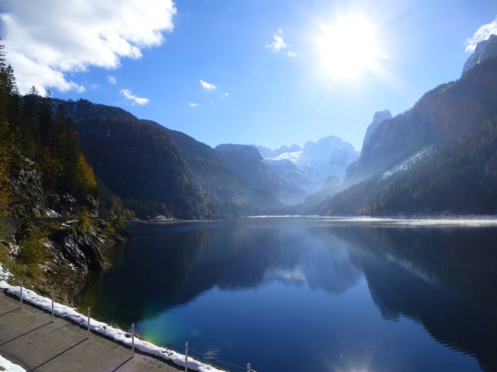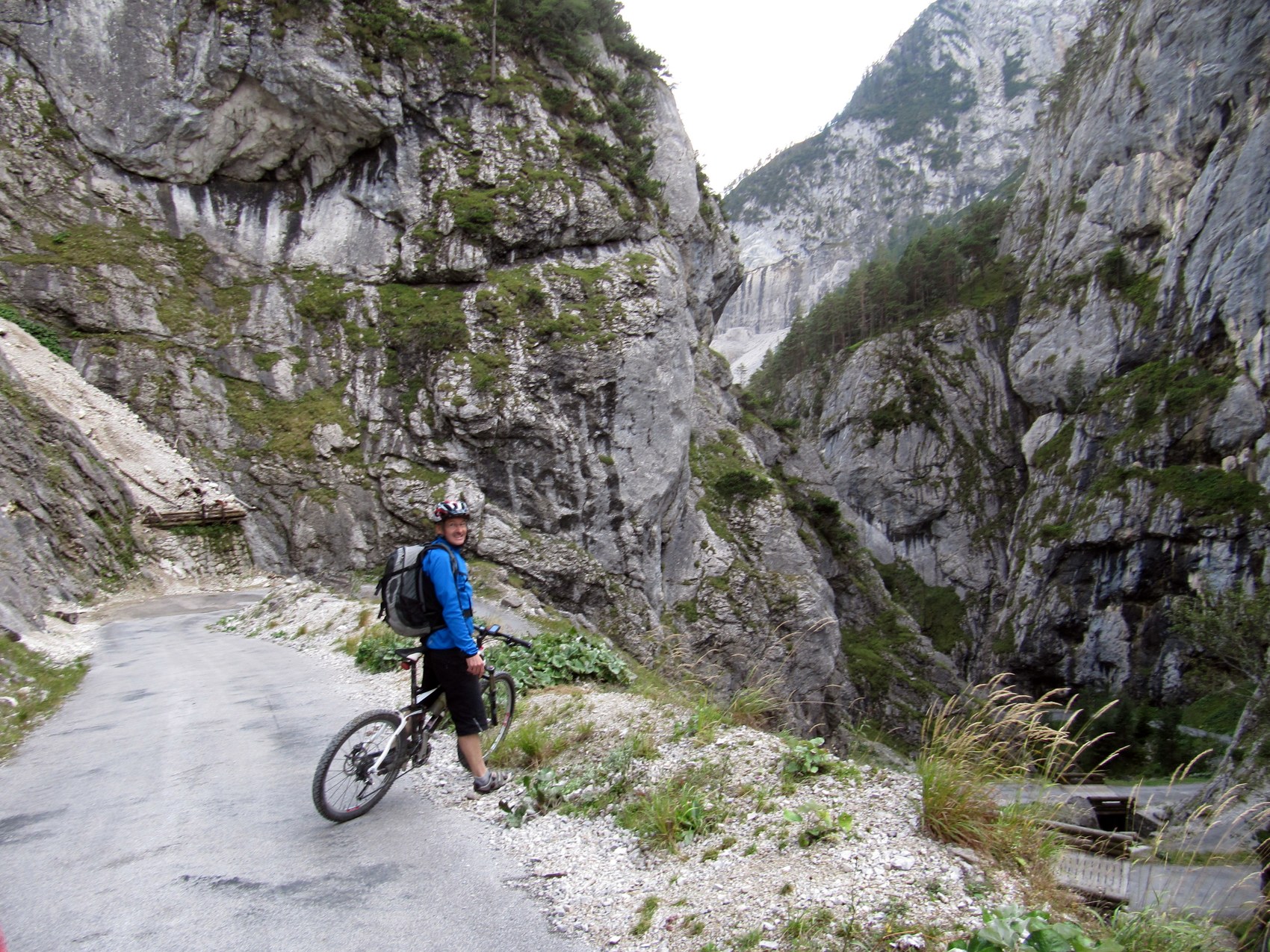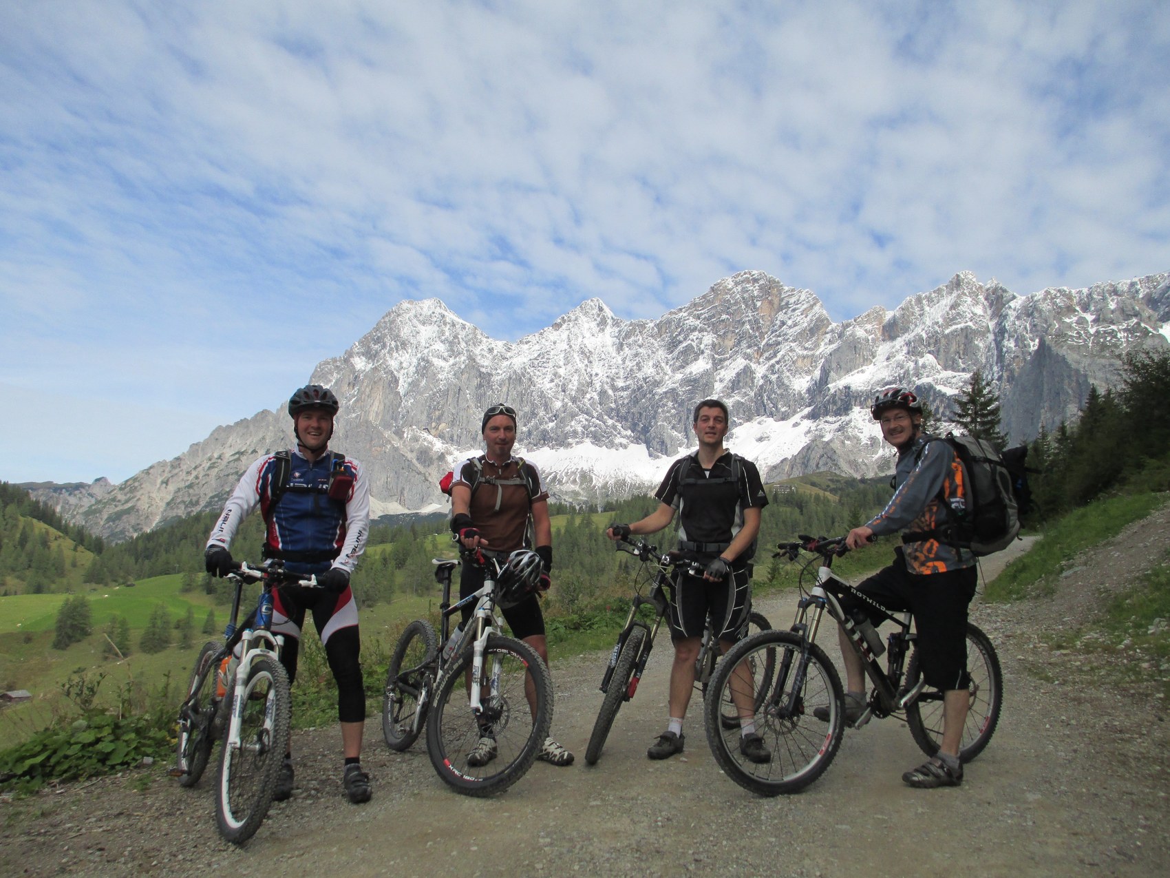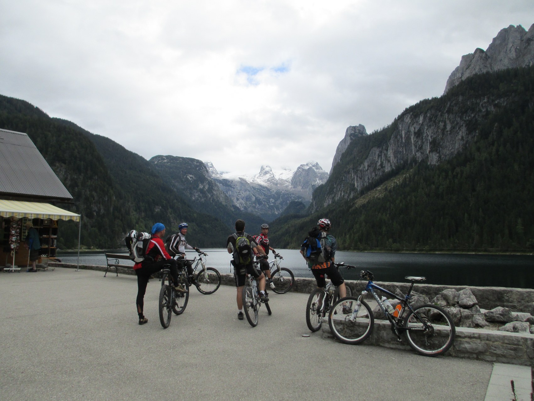 Nach wochenlangem Regen war endlich und pünktlich zur Tour eine Wetterbesserung angekündigt. So machten wir uns zu sechst mit dem Vereinsbus und Radl-Anhänger (Danke, Franz!) auf bis kurz hinter Abtenau am Dachstein. Von hier aus starteten wir die erste Etappe bis nach Obertraun am Hallstätter See. Entlang der Lammer konnten wir uns noch warmfahren, bevor sogleich der erste lange Anstieg auf die Hornspitz (1 433 m) im Rußbacher Skigebiet folgte. Nach steiler Abfahrt mit einer nassen Trial-Passage ging es in großem Bogen nach Gosau und weiter zum Vorderen Gosausee, wo wir beim Wirtshaus mit Blick auf den Dachstein Rast machten. Gestärkt packten wir den letzten, dafür aber langen, Anstieg des Tages über die Roßalm bis auf 1 502 m an. Die 2000 Höhenmeter der ersten Etappe waren geschafft und das einigermaßen trockene Wetter aufgebraucht. Im Regen ging’s mit teilweise spektakulären Tiefblicken in die Waldbachschlucht hinunter zum See und weiter zum Quartier, wo die Köchin schon mit dem Abendessen wartete.