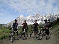 Bei schönstem Wetter ohne Aussicht auf Regen begann die letzte Etappe an den Südwänden des Dachsteins vorbei. Zunächst fuhren wir über die Austriahütte hinauf zur Talstation der Huhnerkogelseilbahn. Hier folgte mit die schönste Strecke unter den den Felswänden bis zur Bachlalm und wieder hinauf zum Nößlerriedel auf 1 646 m. Hier konnten wir wieder zwischen Almweg und Wandersteig wählen, so kamen alle auf ihre Kosten. In Filzmoos gab’s erstmal Kaffee und Kuchen. Bis zum Bus waren es noch gute 1000 Hm Abfahrt, allerdings mit fast 600 Hm Gegenanstieg.. Aber auch die waren bald geschafft und so kamen wir alle gut gelaunt nach 195 km und über 6000 Hm wieder am Ausgangspunkt an.