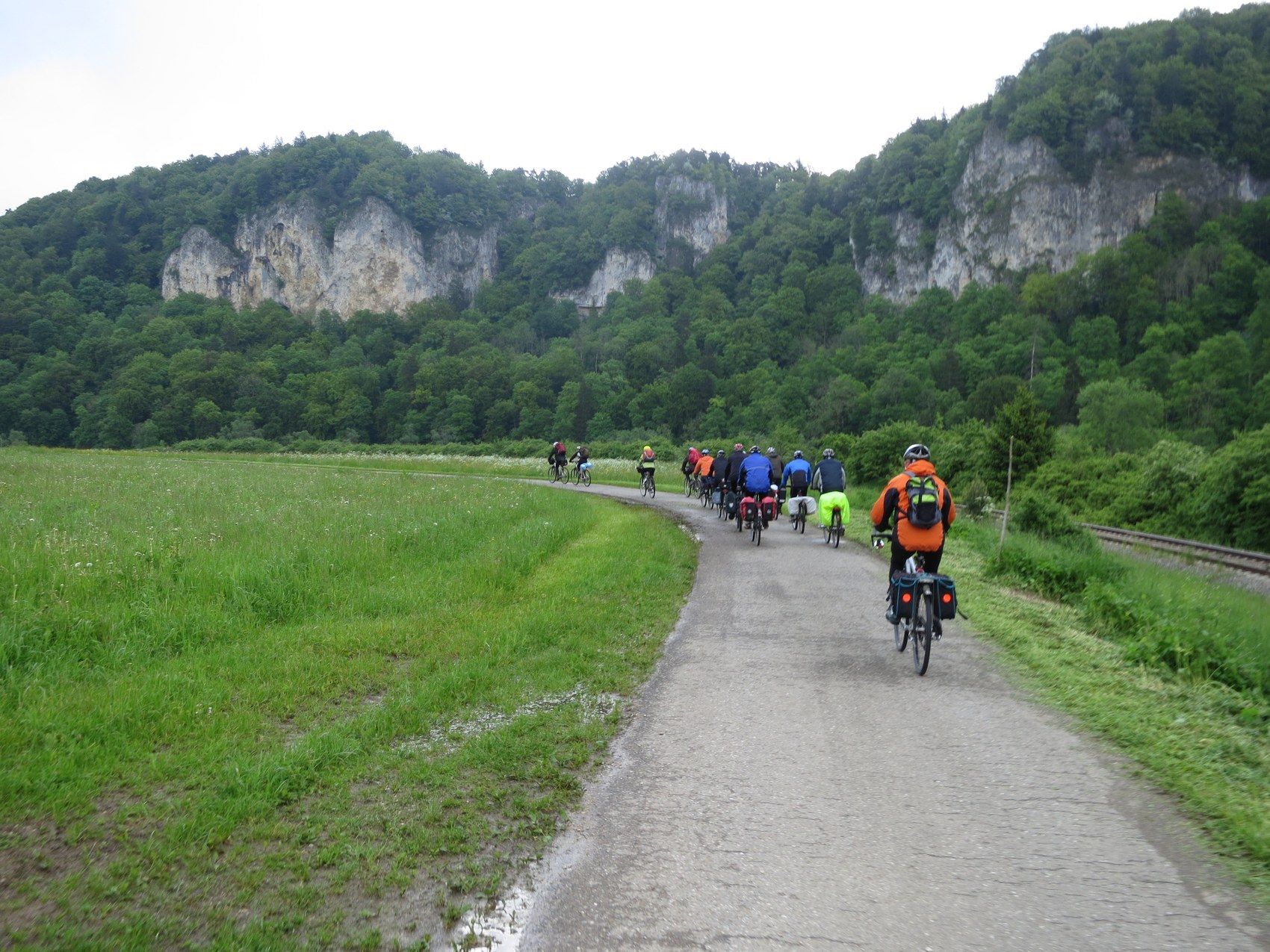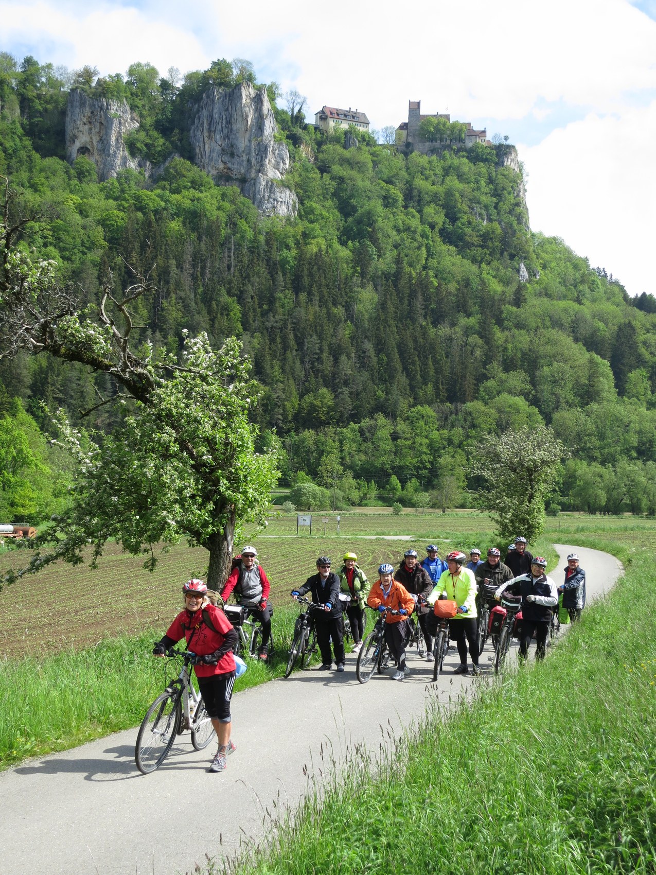 Von Mühlheim bis Sigmaringen folgte der wohl schönste Teil unserer Reise. Die junge Donau schlängelt sich durch die Schwäbische Alb mit beeindruckenden Felsformationen und zahlreichen Burgen auf den Anhöhen. Das anfangs kalte, trübe, aber trockene Wetter besserte sich zusehends. Die Überflutungen des Radweges hielten sich in Grenzen und das Mittagessen in Sigmaringen schmeckte bereits im Freien bei Sonnenschein im Gasthof Zur Traube, während daheim der strömende Regen die Hochwassergefahr stündlich verschärfte. Im sommerlichen Outfit genoss man den Nachmittagskaffee in Binzwangen. Das Charisma Hotel in Riedlingen kann man nur weiterempfehlen. Als einzige Gäste am Ruhetag verwöhnte uns der Koch mit einem gepflegten Menü. Riedlingen hat eine sehenswerte, typisch schwäbische Altstadt mit vielen Fachwerkhäusern, wie die Sightseeingtour zu Fuß zeigte. Die deutsche Fußballnationalmannschaft verlor an diesem Abend sensationell gegen die USA mit 3:4 Toren.