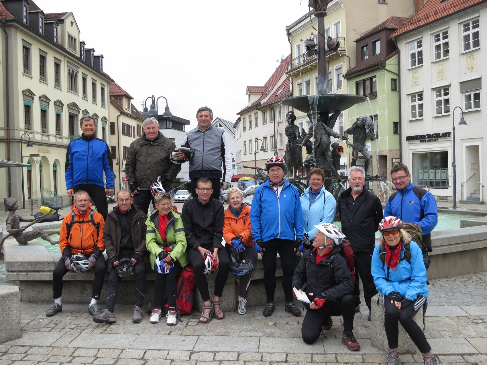 Bei trübem Wetter verließen wir Riedlingen und fuhren abwechselnd auf Asphalt- und Splittwegen durch die hügelige Landschaft. Das Donauhochwasser nahm an Intensität spürbar zu, immer wieder ist der Radweg deshalb unpassierbar. In Ehingen fällt deshalb die Entscheidung einen Umweg über das Blautal zu machen. Genau zur Mittagszeit in Blaubeuren begann es zu regnen und es wurde immer kälter. Nach der Rast im Gasthof Zum Löwen wurde die Regenbekleidung angelegt und der Blautopf besichtigt, der aus einem langen Höhlensystem entspringt und bei einem Pegelstand von nur 74 cm über 16 000 Liter Wasser pro Sekunde an diesem Tag ausschüttete. Auf den 15 km bis Ulm war es nass und die Temperatur bei 6–8 Grad ziemlich ungemütlich. Im Café gegenüber dem Ulmer Münster, mit dem höchsten Kirchturm der Welt (161,53 m), konnten sich die Radfahrer aufwärmen. Eine Besichtigung der Kirche durfte nicht fehlen und der Herr hat geholfen, der Regen hörte auf. Über Umwege gelangte man zum Hotel Hirsch in Günzburg. Der freundliche Aufenthaltsraum verhinderte ein zu frühes Zubettgehen.