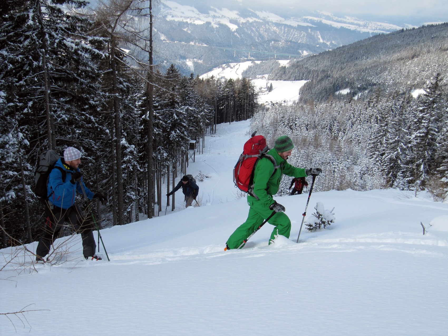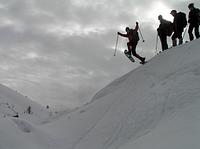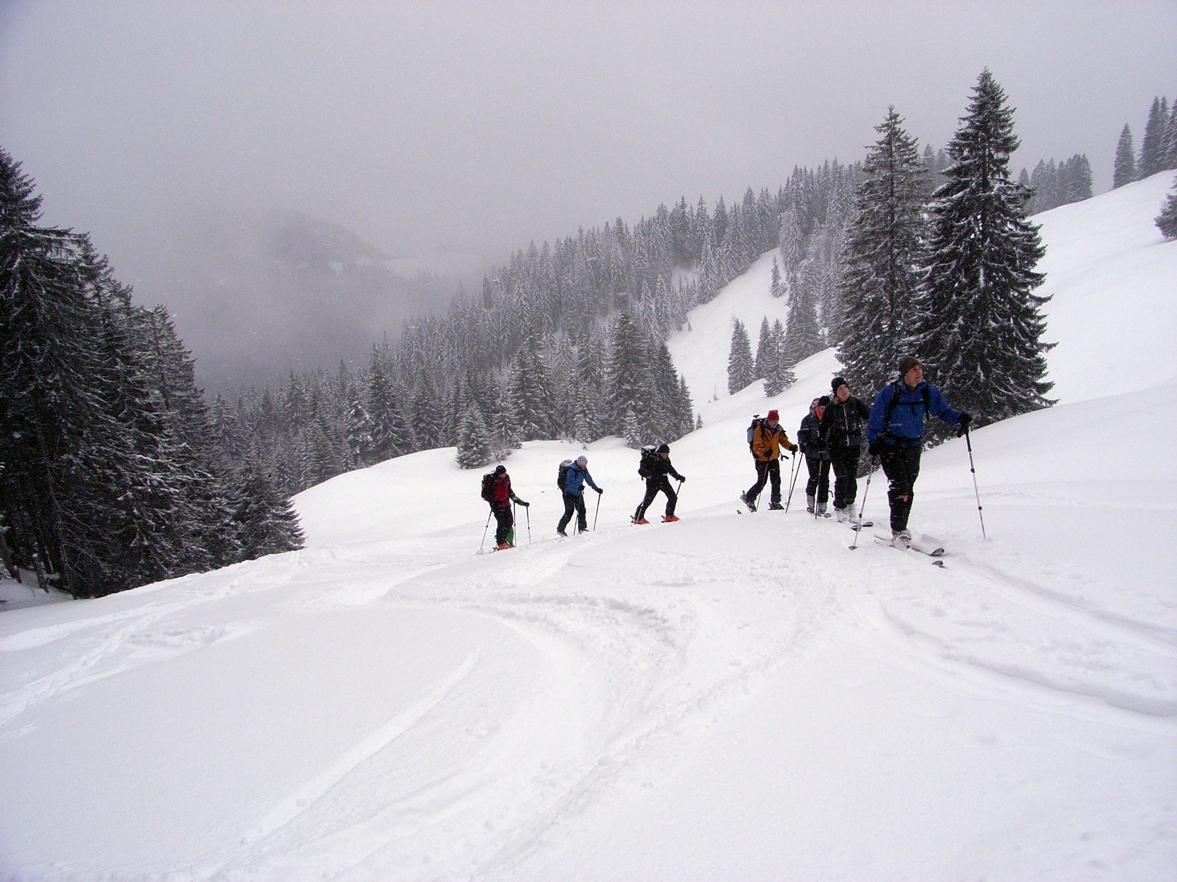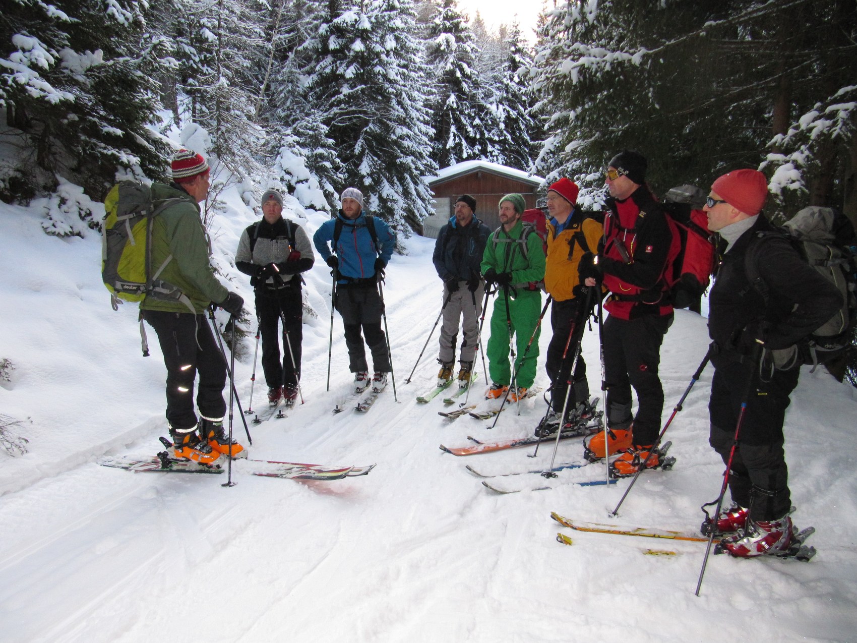 Dieses Wochenende stand ganz unter dem Thema wie bewege ich mich sicher und verantwortungsbewußt im winterlichen Tourengelände. Von der Beurteilung des Lawinenlageberichtes mit Beobachtung des Geländes und der Schneesituation vor Ort begann das Wochenende. Beim Anstieg zum Morgenkogel wurde vom Bergführer erklärt, auf was zu achten ist und wie die Aufstiegspur im Zusammenhang mit Hangneigung und Geländebeschaffenheit richtig anzulegen ist. Bei der folgenden Abfahrt wurden die Teilnehmer über die Notwendigkeit von Sicherheitsabständen aufgeklärt und das richtige Fahren im Gelände besprochen.