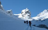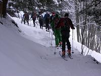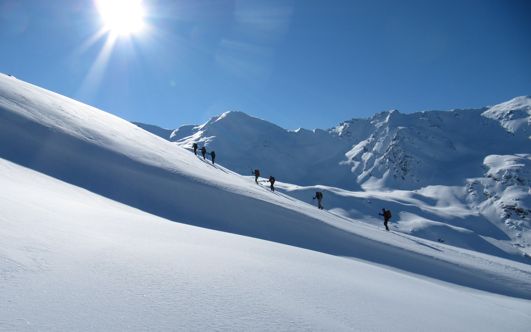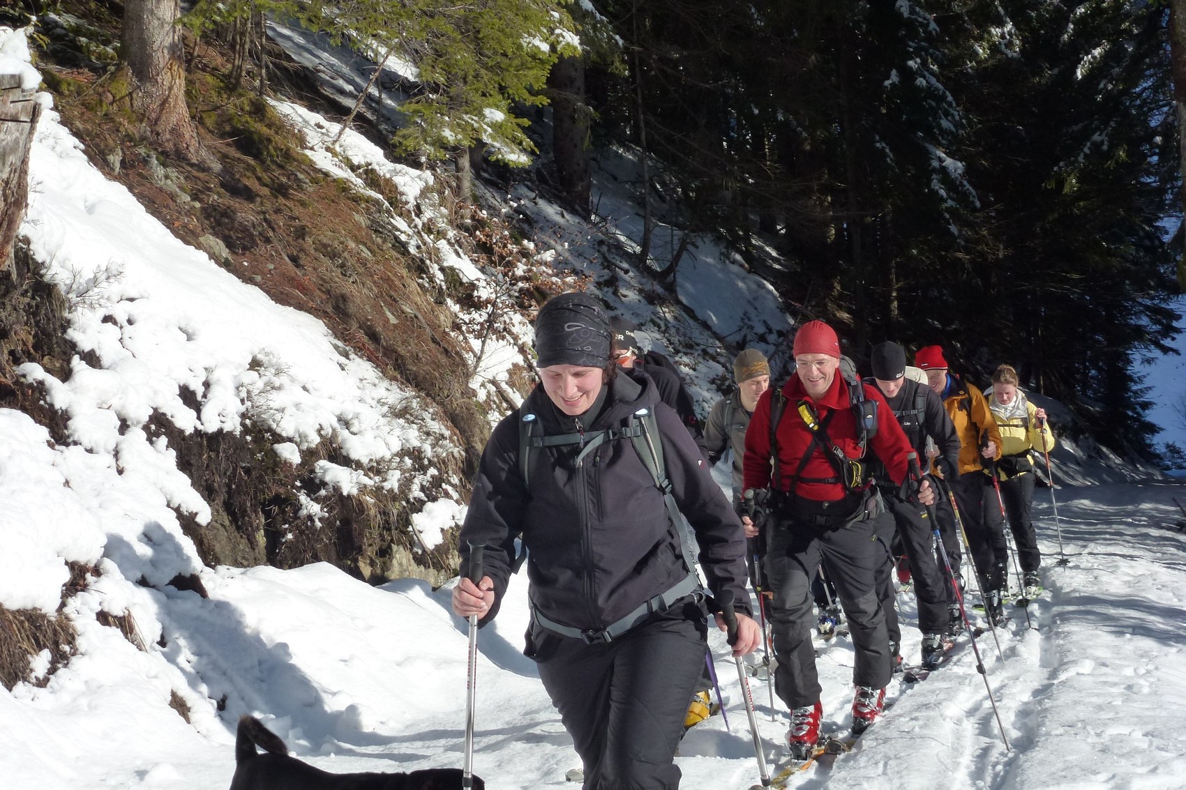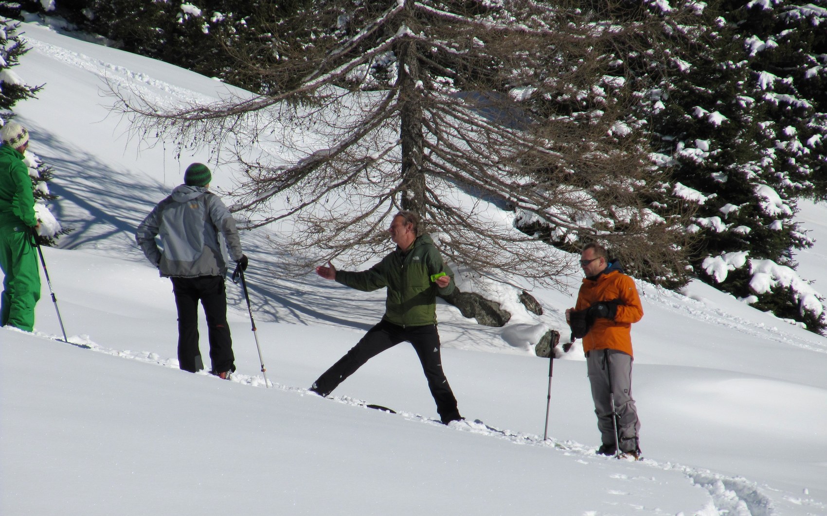 Dieses Wochenende stand ganz unter dem Thema wie bewege ich mich sicher und verantwortungsbewußt im winterlichen Tourengelände. Von der Beurteilung des Lawinenlageberichtes mit Beobachtung des Geländes und der Schneesituation vor Ort begann das Wochenende. Beim Anstieg zum Morgenkogel wurde vom Bergführer erklärt, auf was zu achten ist und wie die Aufstiegspur im Zusammenhang mit Hangneigung und Geländebeschaffenheit richtig anzulegen ist. Bei der folgenden Abfahrt wurden die Teilnehmer über die Notwendigkeit von Sicherheitsabständen aufgeklärt und das richtige Fahren im Gelände besprochen.