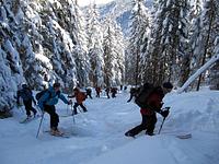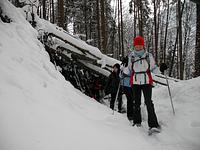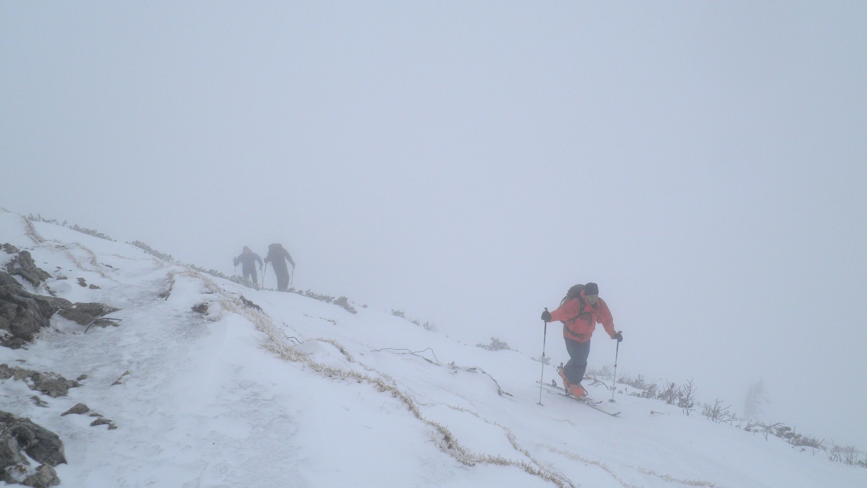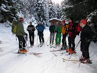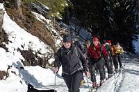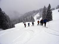 Mitten im Hochwinter die Ski auf einer aperen Forststraße ins Tal tragen? G'wiß net! Darum haben wir die auf das Trainsjoch geplante Skitour zur Mühlhornwand in den Chiemgauern verlegt. Dort reichte der Schnee auf der Forststraße bis in Tal und im oberen Teil fanden wir durchwegs gute Verhältnisse vor. Trotz angekündigtem Schneefall, der auch den ganzen Tag anhielt, waren wir in einer ansehnlichen Gruppenstärke von sieben alten Hasen und zwei Skitouren-Einsteiger bzw. -Umsteiger unterwegs. Mit geschultem Auge war der ehemalige Snowboarder sofort am Fahrstil ausgemacht - zumindest aber an der weit geschnittenen Hose.