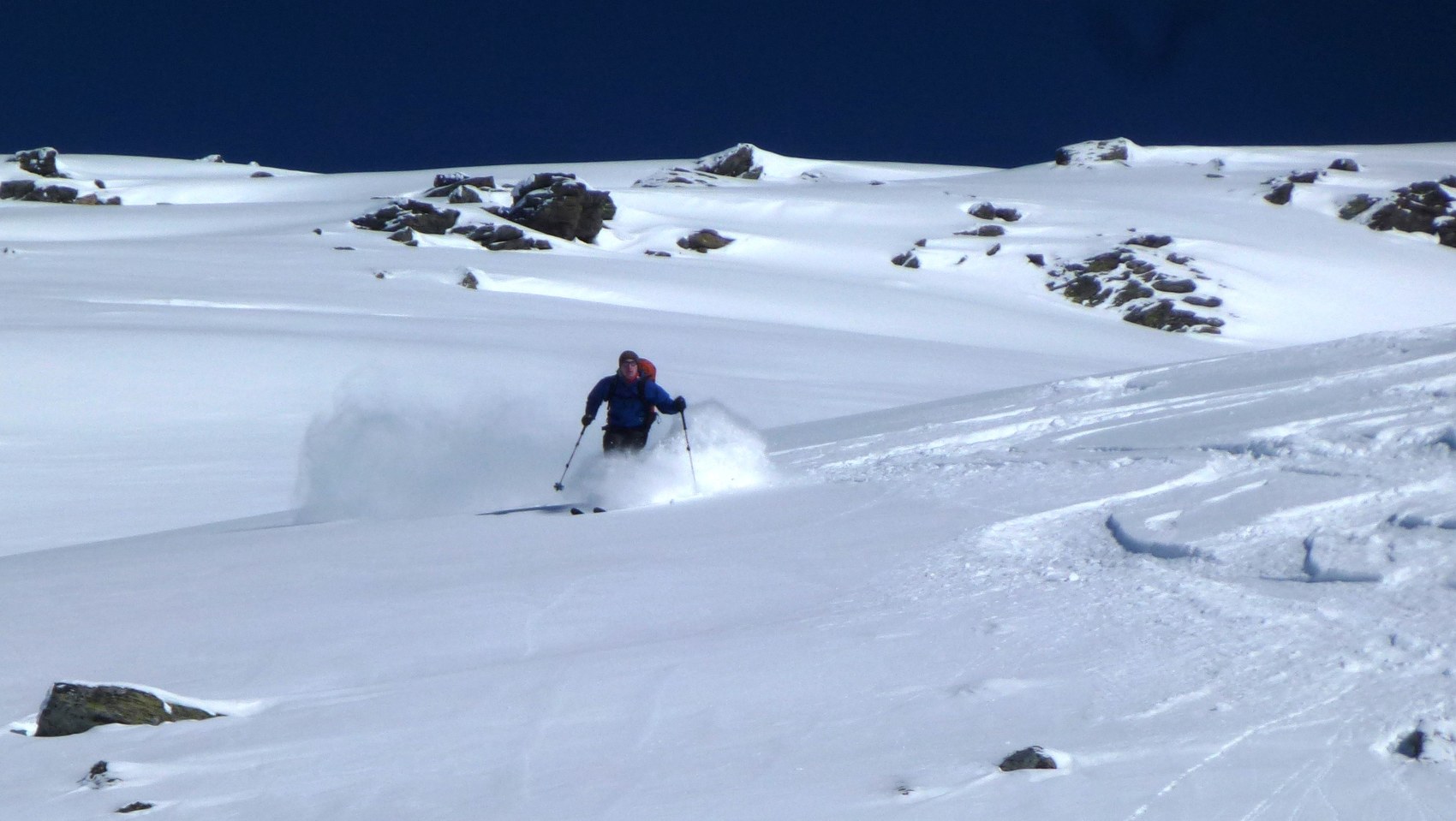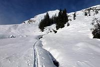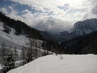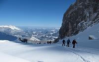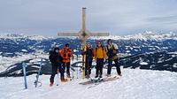 Am nächsten Tag stand der Zendleser Kogel (2 422 m) auf dem Programm. Nach dem idyllischen Mühlental erwartete uns anstrengende Spurarbeit. Bei blauem Himmel erreichten wir den schönen Aussichtsgipfel. Oben angekommen, wurden wir Zeugen eines Beinaheunglücks, bei dem ein anderen Tourengeher während der Abfahrt in einen Steilhang ein riesiges Schneebrett auslöste. Wie durch ein Wunder wurde er nur 20 Meter mitgerissen und ihm ist nichts passiert.