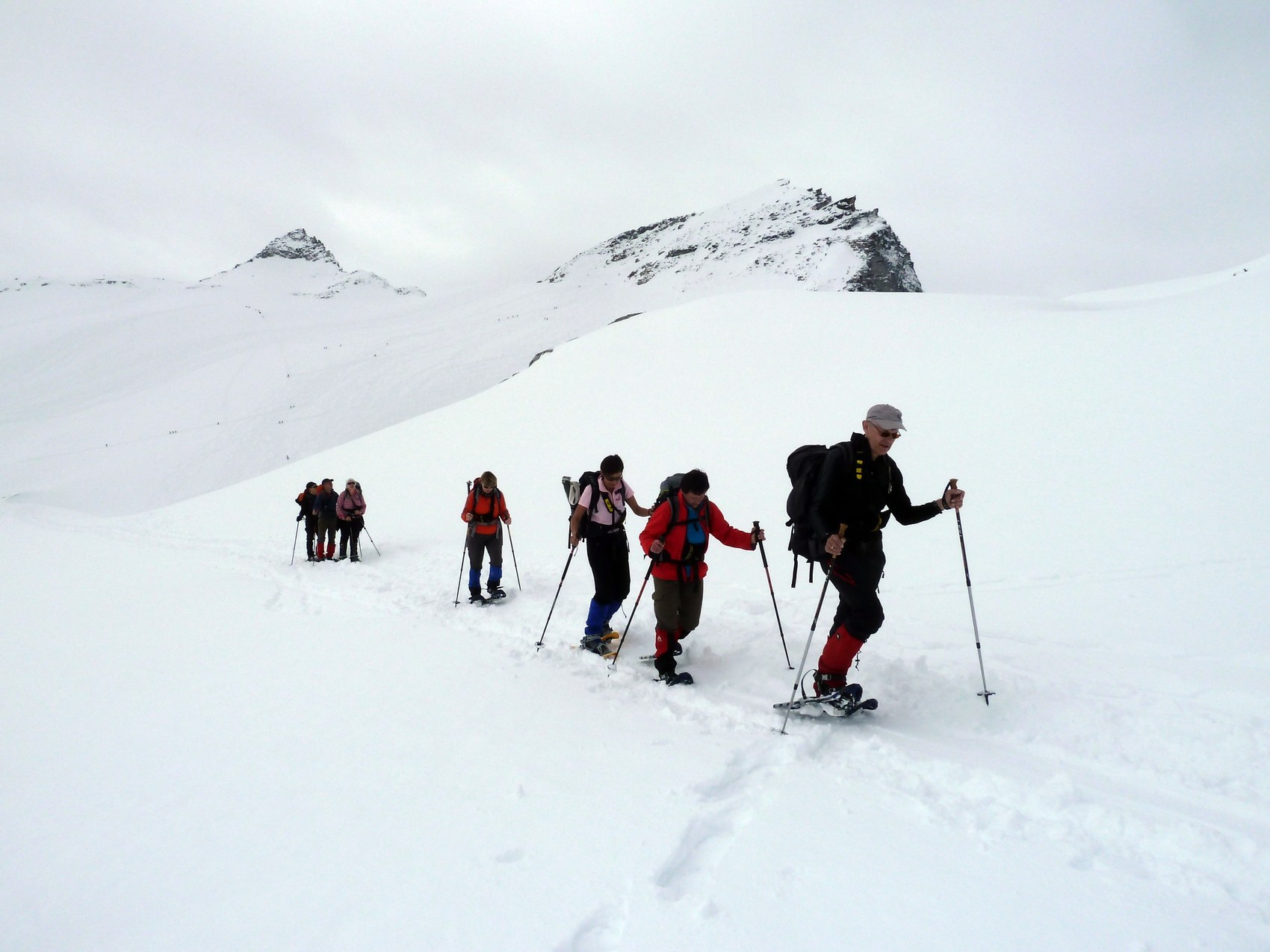 Dass wir unsere Schneeschuhtour quartierbedingt um eine Woche verschieben mussten, stellte sich als Glücksgriff heraus. Bestes Tourenwetter bei idealer Lawinensituation war das Ergebnis. Dass man bei der Lawinenstufe 1 (gering) auch mit Lawinenabgängen rechnen muss, erlebten wir bei der Anfahrt! So stellte sich der riesige Wasserfall im Stubachtal bei nähren Hinblick als Lawinenabgang heraus, denn er stellte seine „Wassertätigkeit“ innerhalb weniger Sekunden restlos ein. Der Anstieg zur Rudolfshütte (2 315 m) wurde per Schneeschuh von Enzingerboden (1 480 m) aus, bei fast schon sommerlichen Temperaturen in knapp vier Stunden absolviert. Die Rudolfshütte – man kann hier nicht mehr von einer Hütte sprechen – ist vielmehr ein 3-Sterne-Berghotel mit jeglichen Annehmlichkeiten, wie Schwimmbad, Sauna, Kletteranlage, etc. Nach dem Abendessen saßen wir in gemütlicher Runde in der Lobby und lauschten der Livemusik.