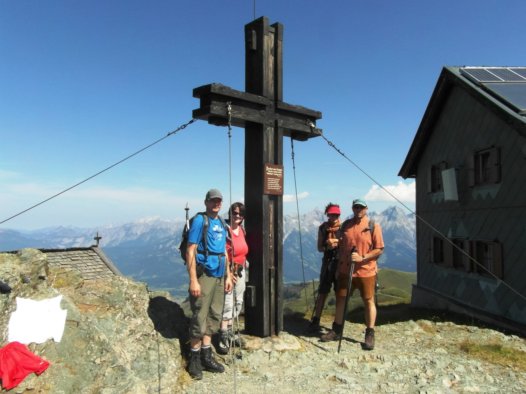 Bei Sonnenschein pur machten wir uns auf ins Gasteiner Tal. Auf bequemem, aber etwas staubigem, Weg erreichten wir die bekannte Drei-Waller-Kapelle, die ursprünglich aus dem 12. Jahrhundert stammt. Ab hier wurde es einsamer, da die meisten Wanderer Einkehr in der nahen Kögerl-Alm machten. Am Gipfel des Rauchkögerls boten sich Ausblicke nach Norden ins Salzachtal und das Hochkönigmassiv, nach Westen zum Arnkogel, Rauriser Sonnblick und Großglockner und natürlich ins Gasteiner Tal. In der Amoser-Alm wollten wir einkehren. Wegen des Ruhetags stiegen wir bis Unterberg zum Parkplatz ab und stillten dort unseren Durst. Die Überraschung war groß, als sich beim Bezahlen herausstellte, dass unsere Bedienung, ein ganz junges Mädchen, aus der Nähe von Gangkofen stammt. Gutgelaunt traten wir die Heimreise an.