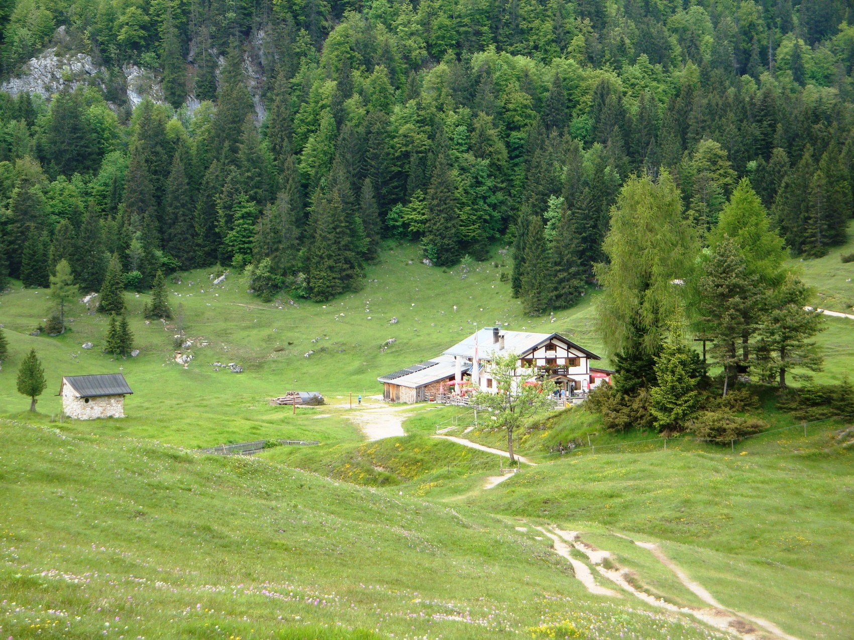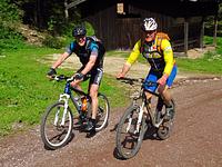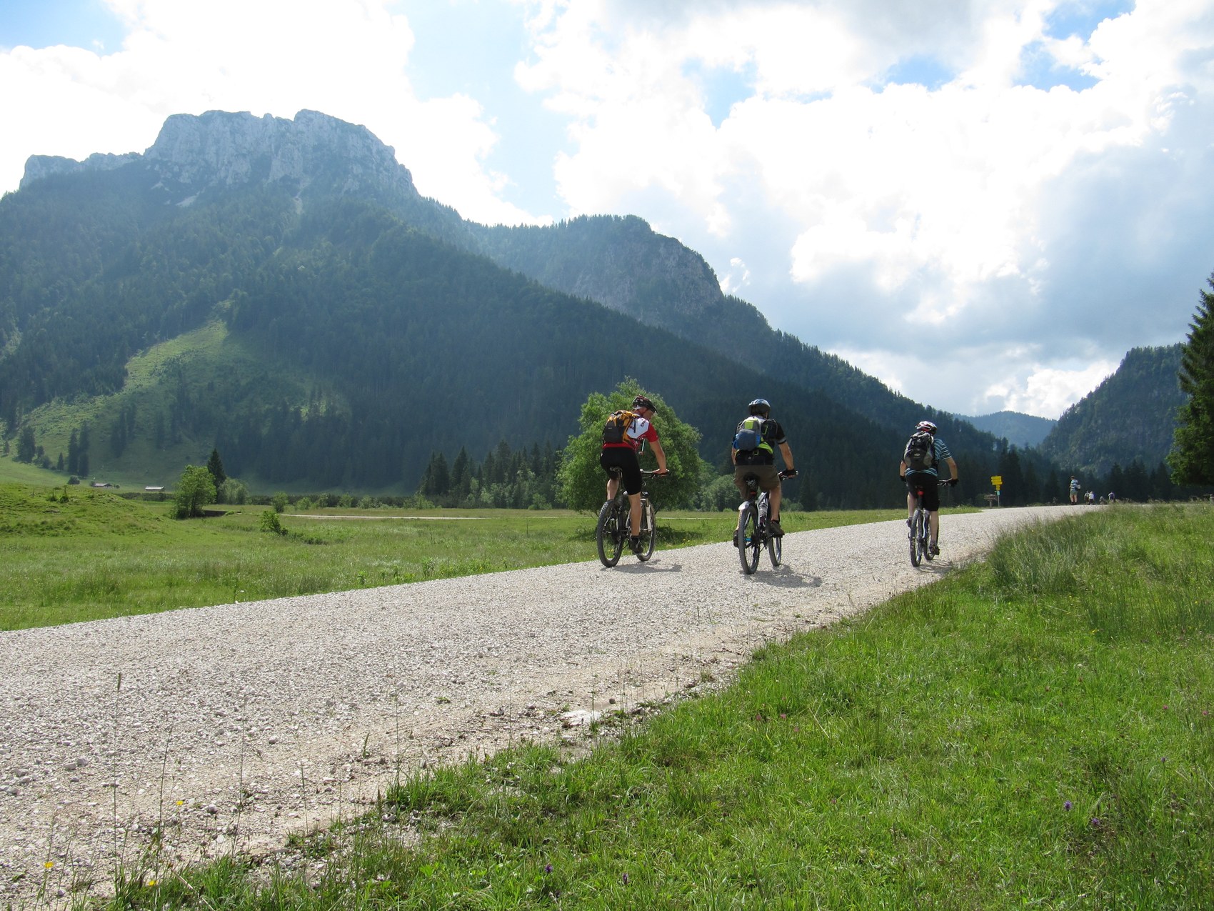 Ziel dieser Tagestour waren die schön gelegenen Almen im Röthelmoos, nordwestlich der Hörndlwand. Von Staudach im Norden des Hochgerns fuhren wir durch das wunderschöne Alplbachtal hinauf zur Vorderalm. Den steilsten Wegabschnitt davon schoben war letztlich dann doch alle, natürlich wegen des durch tagelangen Regen rutschigen und aufgeweichten Untergrunds, vielleicht auch wegen der Steigung von über 20 %. Weiter ging es ins Tal der Weißen Ache und nach nicht allzu langer Auffahrt über das Eschelmoos hinunter ins Röthelmoos, wo wir in der Mittagssonne ausgiebig Rast machten. Zurück wählten wir den Weg über die Jochbergalm. Dorthin führte ein auch bergauf sehr gut befahrbarer Singletrail, bevor es über die dann immer breiter werdende Forststraße bis hinunter nach Marquartstein und weiter zurück zum Ausgangspunkt der Runde über 33 km und 1300 Hm ging.
