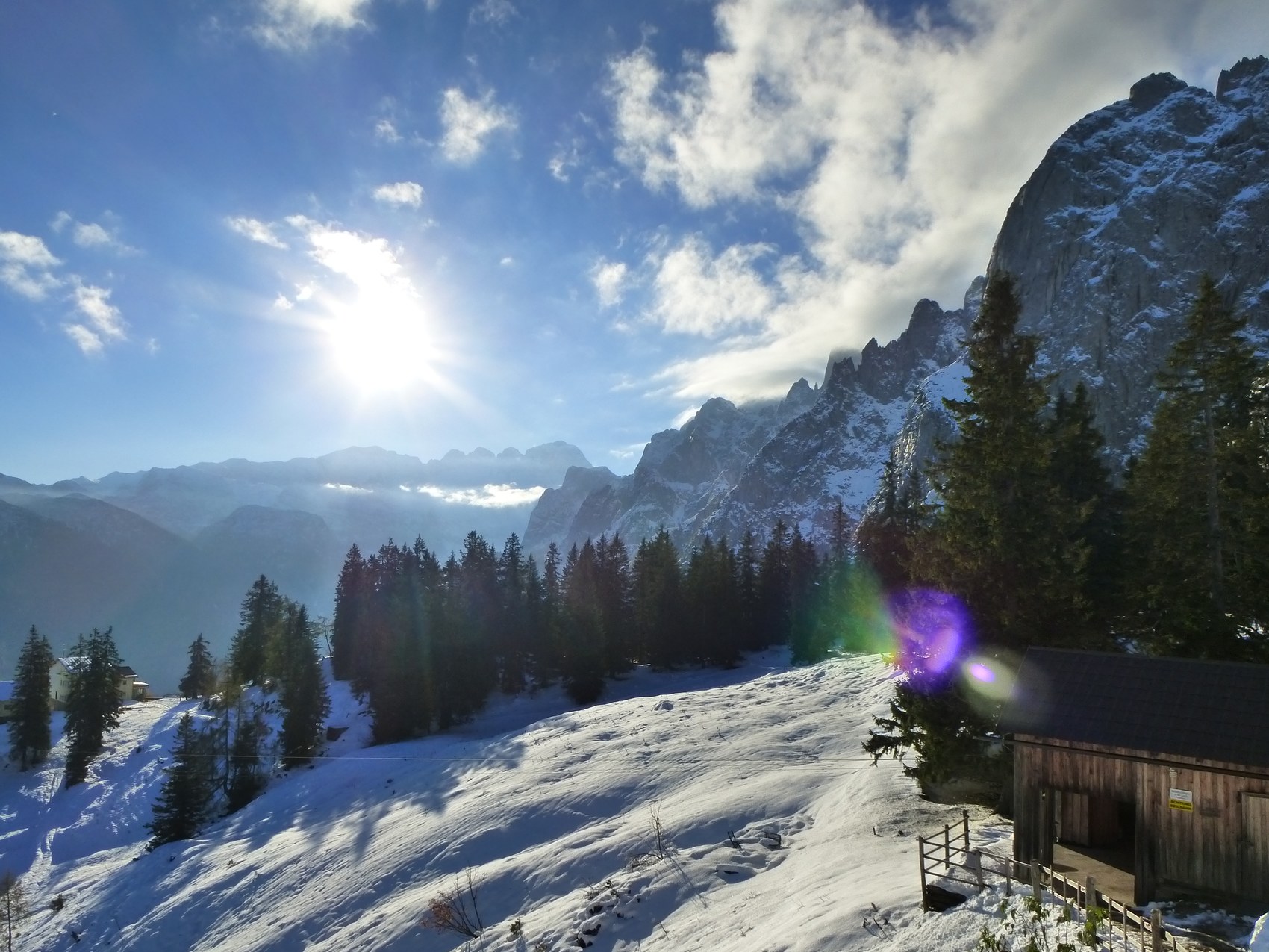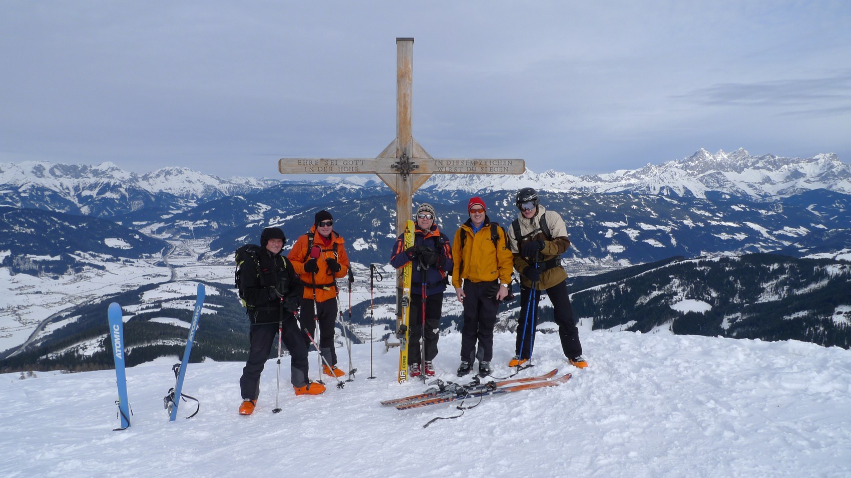 Durch abwechslungsreiches Wiesengelände erreichten wir die beeindruckende Ebene der Lackenalmen im glitzernden Pulverschnee. Nach dem steilen Gipfelanstieg wurden wir mit einer tollen Aussicht Richtung Dachstein und Ankogelgruppe entlohnt. Die Abfahrt versüßten wir uns noch mit einer Rast auf einem sonnenverbrannten Almbankerl, einer schönen Tiefschneeabfahrt vom Eibenberg und einen Einkehrschwung mit Gipfelschaps im Sattelgut.