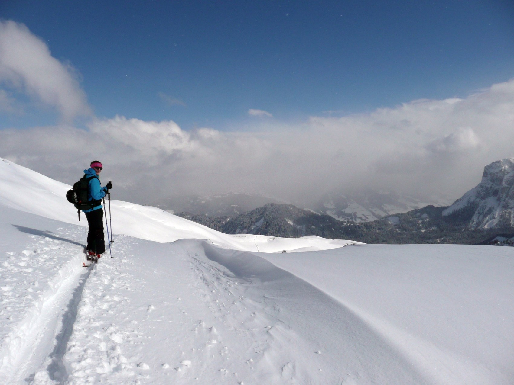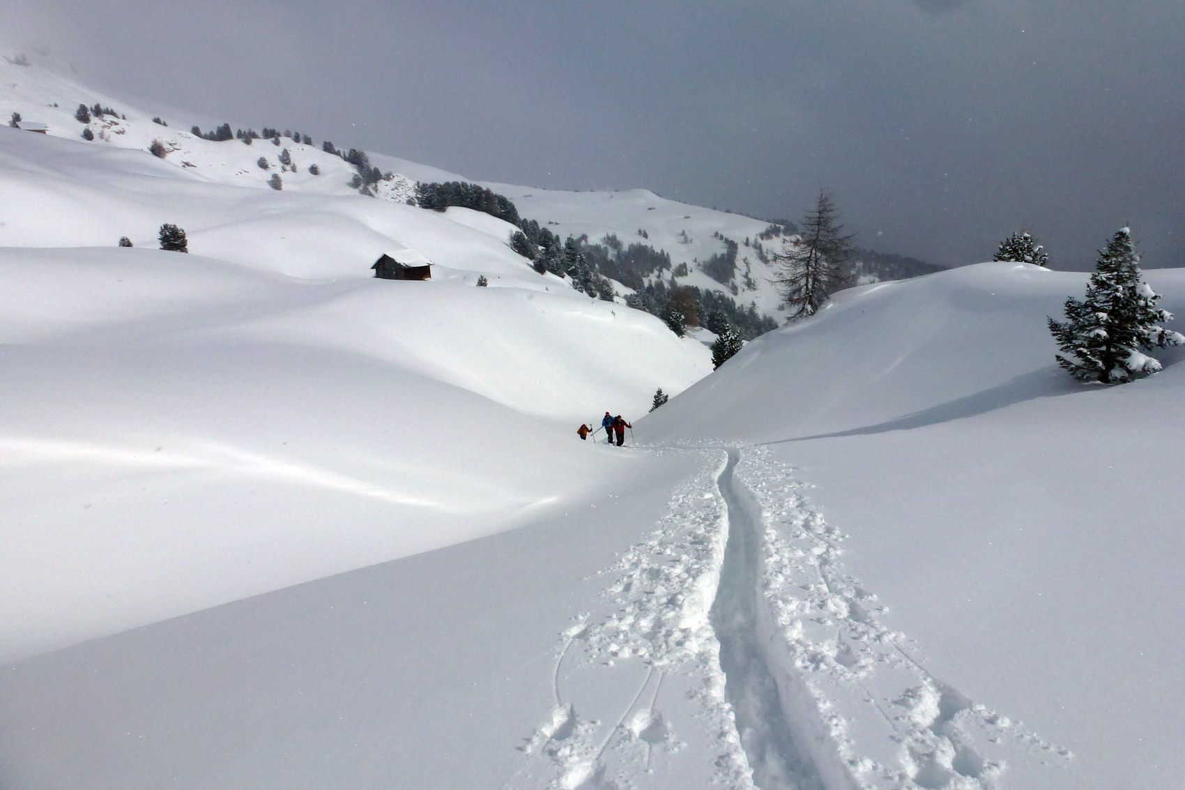 Nach der ersten Nacht in unserem idyllischen Quartier zuhinterst im ladinischen Campill erwartete uns in der Früh fast ein halber Meter Neuschnee. Als Eingehtour nahmen wir uns das Kreuzjöchl (2 293 m) vor. Durch tiefverschneite Lärchenwälder und vorbei an schönen Almhütten ging es hinauf zum Hochplateau, das uns mit starkem Wind in Empfang nahm. Da die Sicht- und Wetterbedingungen immer schlechter wurden, mussten wir aufgrund der schwierigen Orientierungsmöglichkeiten unsere Tour am Kreuzjöchl beenden. Der viele windverpresste Schnee im oberen Bereich erforderte hohe Konzentration bei der Abfahrt. Im Waldbereich wurden wir mit schönem Pulverschnee entlohnt.