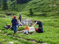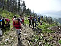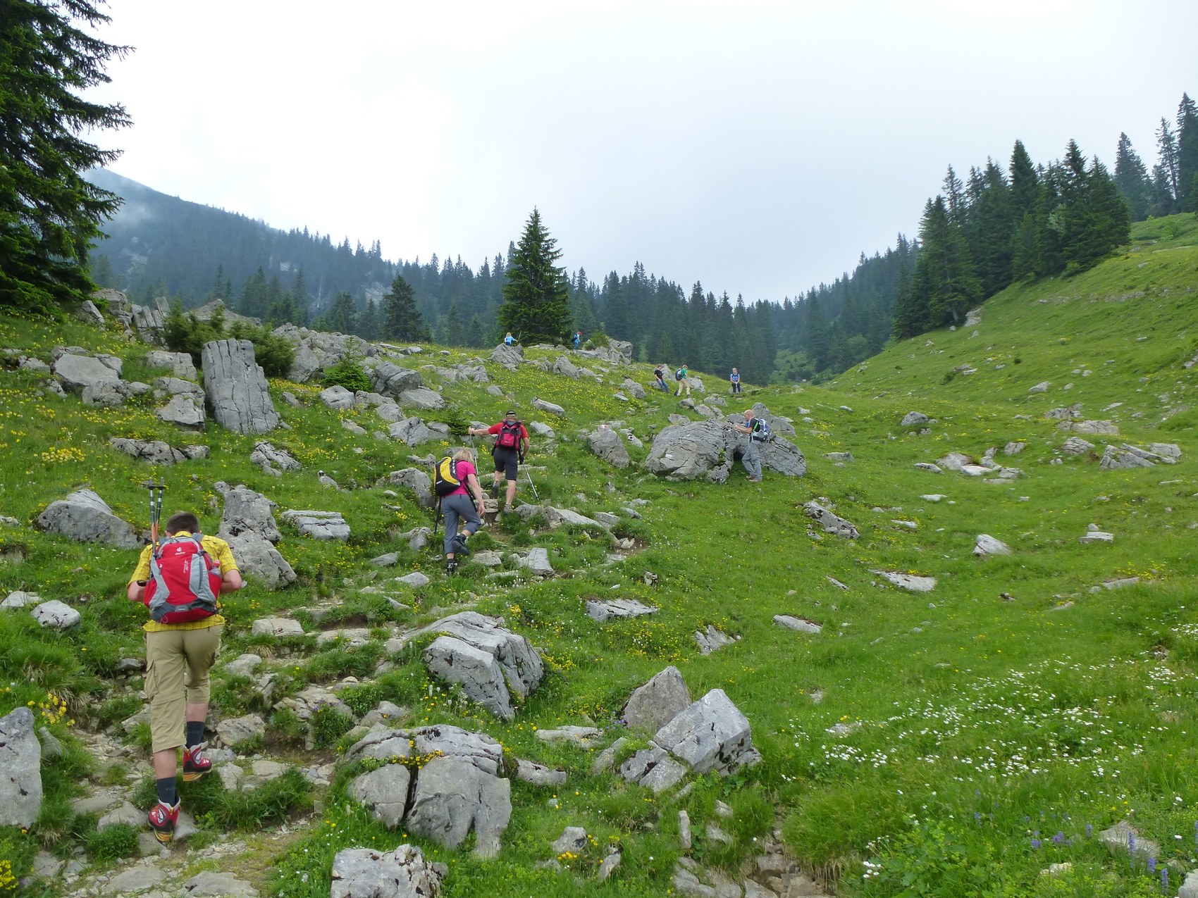 Auf Steigen und Pfaden ging es den Bach entlang und durch wunderbar blühende Wiesen hinauf zur Hochalm. Das Wetter war wunderbar – schön warm, aber auch etwas bewölkt. Nachdem wir uns in der Wiese über der Alm eine ausgiebige Pause gegönnt hatten, wanderten wir erst Richtung Sonntagshorn, um dann am Abzweiger Sonntagshorn-Peitingköpfl am Kamm entlang über den Roßkarsattel unser Ziel anzupeilen. Nach ca. 3-stündigem Aufstieg erreichten wir den Gipfel des Peitingköpfls. Nach einer kurzen Rast stiegen wir über den Wiesenhang Richtung Hochalm ab, um dort noch einzukehren.
